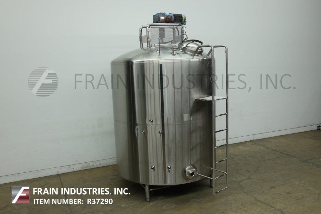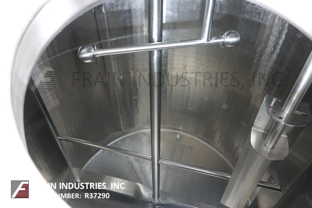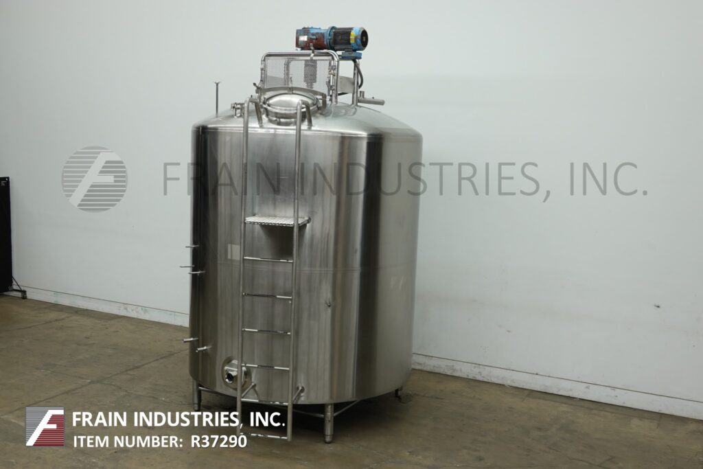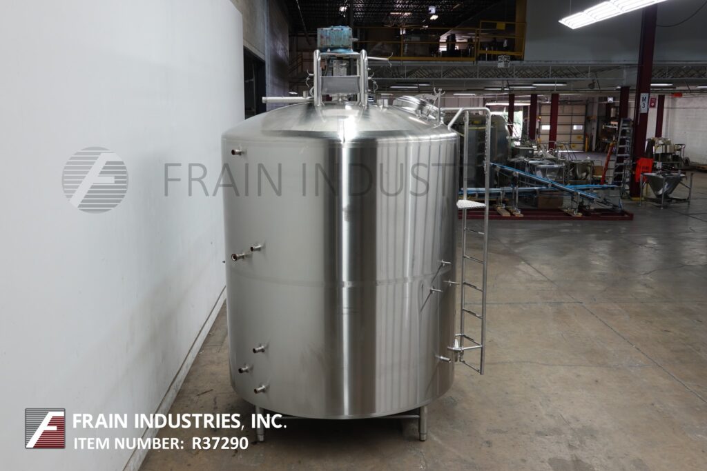 Back to All EquipmentDCI, 2,000 gallon capacity, 304 Stainless Steel jacketed and insulated process tank. Vessel dimensions: 84" diameter, 84" straight wall with 18" manway and 2 thermowells. Equipped with lift up / clamp down covers, top mounted 1½ Hp side and bottom sweep agitation, and (2) CIP spray balls supplied by 2½"OD / 2"ID Tri-clamp fittings. Slant bottom has 3½" OD / 2½" ID side bottom discharge with 22" ground clearance.