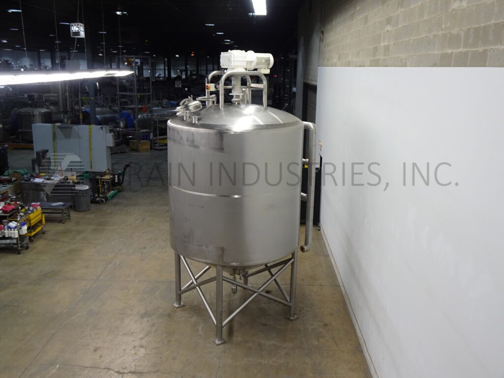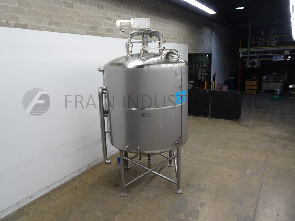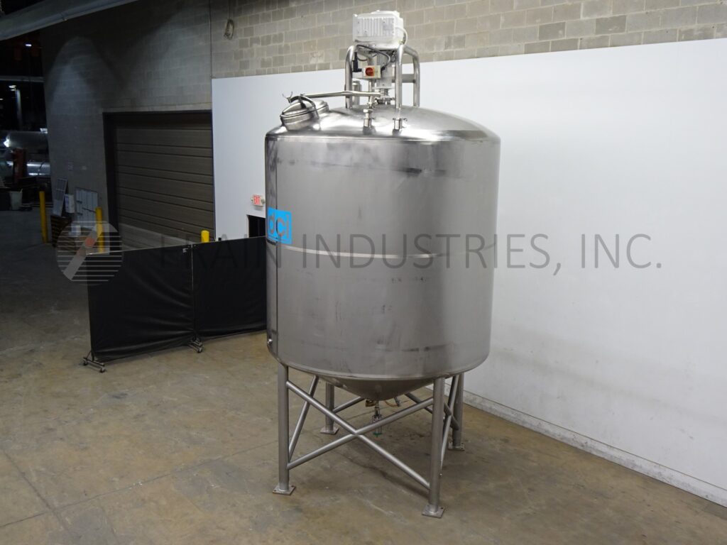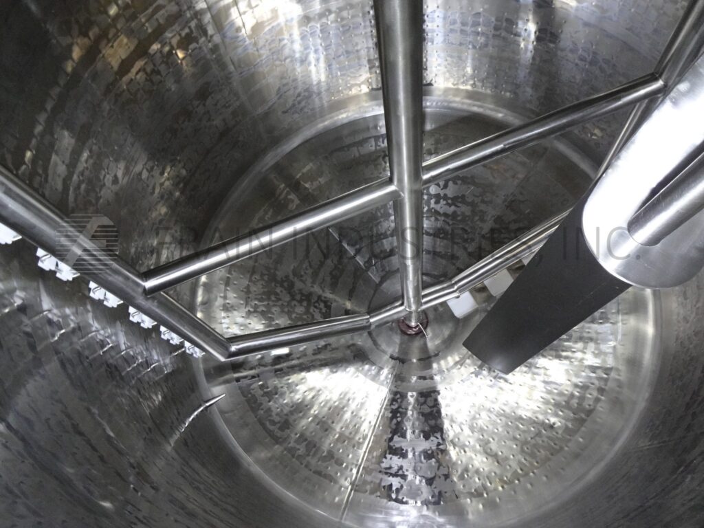 Back to All EquipmentDCI, 3,000 gallon capacity, 316L stainless steel jacketed process tank. Vessel dimensions: 96" diameter, 120" deep, 89" straight wall, Equipped with a 18" top manway with flip-up cover and top mounted 5/10 HP scrape agitation, thermo well, (2) CIP T-Spray Balls supplied by a 2½" OD / 2" ID Tri-Clamp fitting and single CIP Spray Ball supplied by a 3½" OD / 3" ID Tri-Clamp fitting. Cone bottom has 3½" OD / 3" ID bottom discharge with 29" ground clearence.