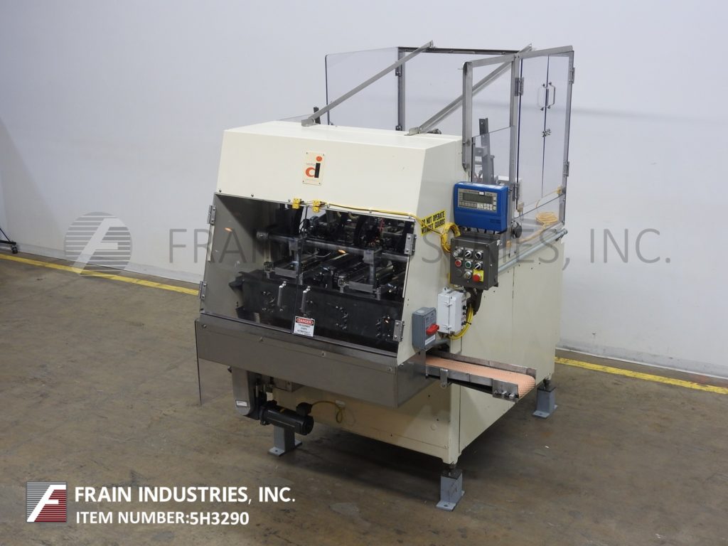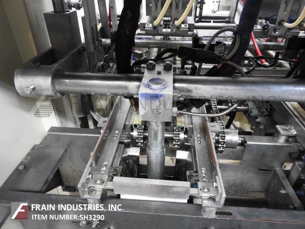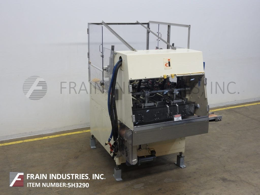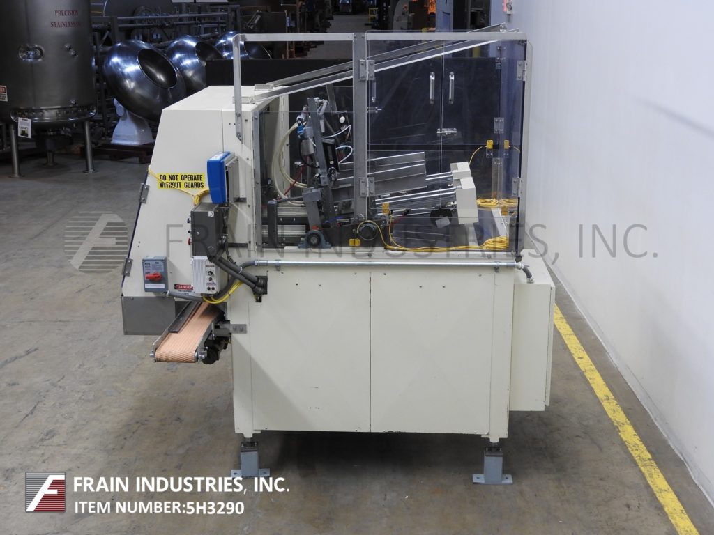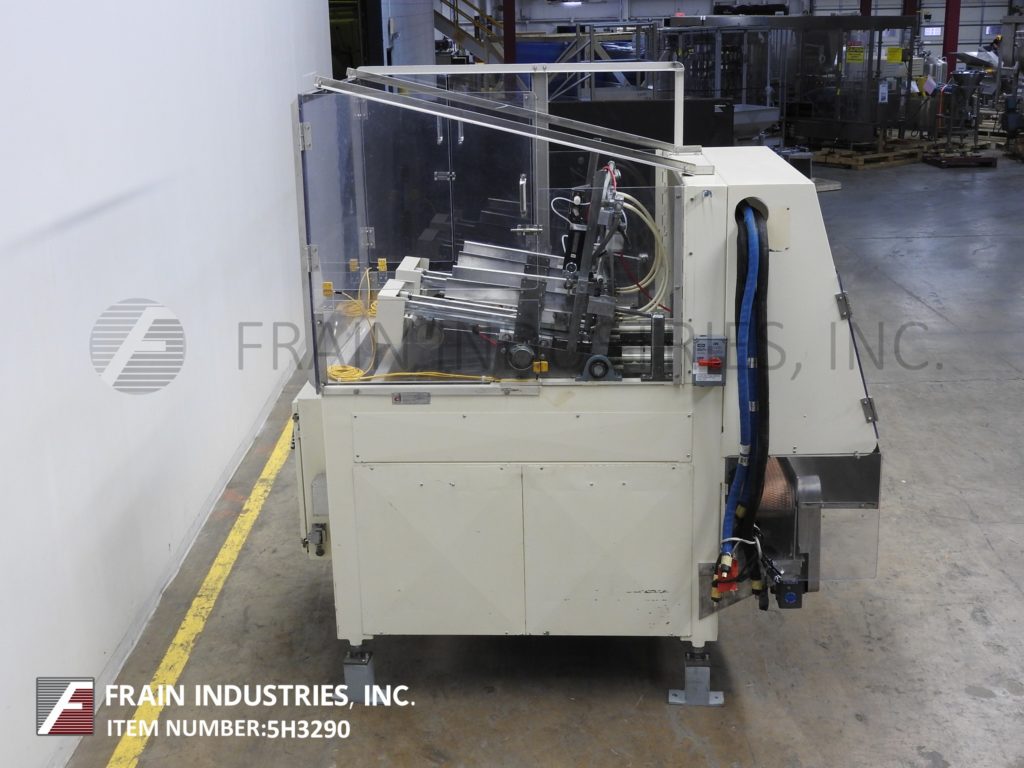 返回所有设备Delkor,752型,自动,双头顶部载荷托盘以前带热熔胶封口机。每分钟5至60个周期,每个头部 - 取决于材料和应用。能够处理宽度为22英寸的平面空白尺寸,宽度为30英寸。Equipped with dual 24" long blank tray magazines, dual vacuum suction cup recipicating pick-in-place’s, dual tray forming heads, 8" wide rubber belt discharge conveyor extending 20" from frame, Nordson hot melt glue system and lexan safety guarding. Control panel with variable speed control, push button start / stop and on / off switches for each pick and place.