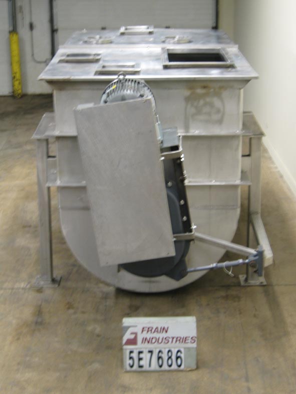 Back to All EquipmentDesign Metals, 285 cubic foot, double ribbon mixer with amounted of product per hour – depending on materials and application. 304 stainless steel. Equipped with inner mixing chamber dimensions: 120" in Length; 64" in Width: 74" in Depth. Double ribbons on 7" OD shaft, with 3" Wide x 1/2" Thick (Outer) ribbons on 3-1/2" Wide x 1/2" Thick spokes with 2" Wide x 1/2" Thick (Inner) ribbons, on 2-1/2" W x 1/2" thick spokes. (2) piece flip up cover has (2) 12" OD flanged 9-1/2" ID with (6) 1/2" bolt holes on 6" centers and (3) 10 x 10, (1) 37 x 20 top ports, and (4) 2" OD sanitary liquid charge ports on side of mixing chamber. Dish bottom has center bottom 11" OD flanged 8" ID discharge port with (6) 1/4" bolt holes on 6" centers and 7" floor clearence, with (2) 3/4" and (2) 1" ID threaded bottom ports, and end 50 Hp belt to motor drive. Mounted on (4) leg frame.