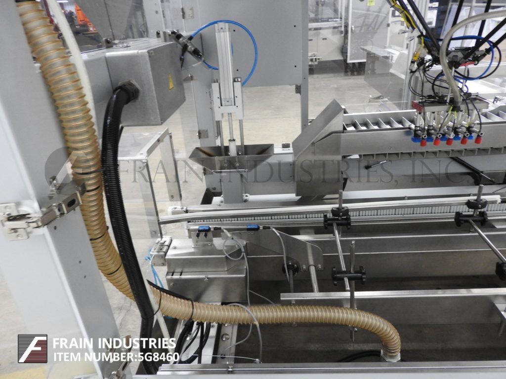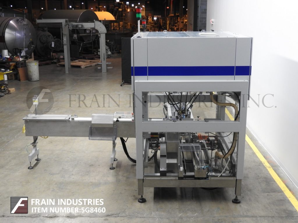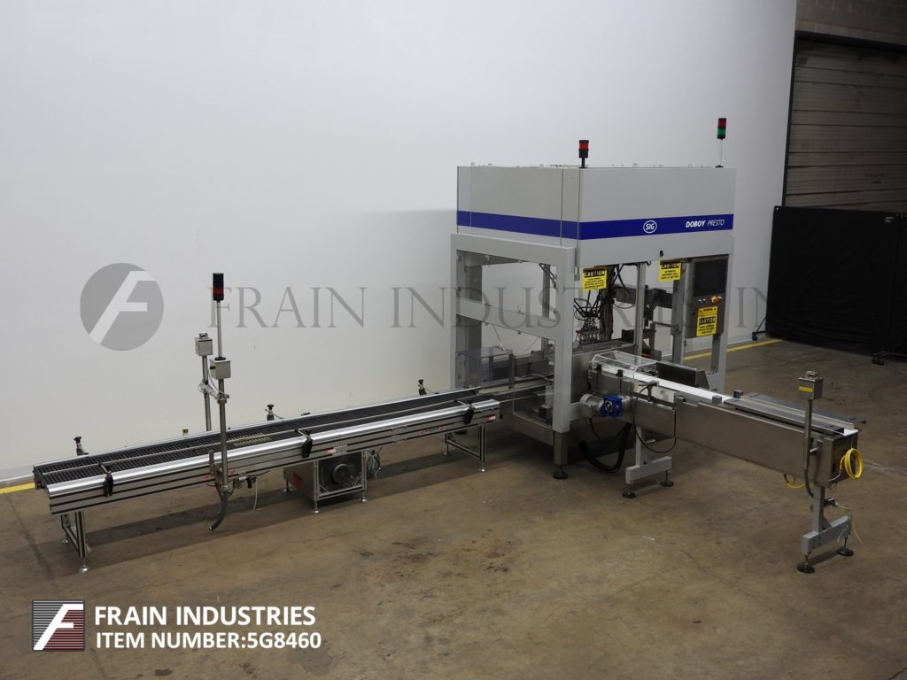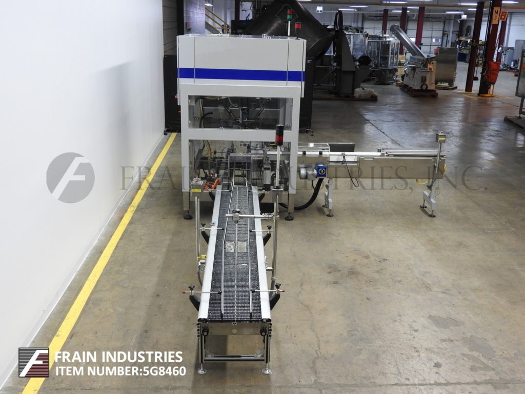 返回所有设备Doboy, Presto型,直角进给,平行整理,单机械臂,顶载,取放系统。额定从10到98循环每分钟(50到490次每分钟)与数量的箱子和托盘-取决于材料,应用,包装模式和机器配置。产品尺寸范围:2“至11¾”长度;宽度为四分之三至五½”;高度:“2¼”。容器尺寸:长度2½”至16½”;宽度为1¾至12½”;身高1到6英寸。能够处理袋,袋,托盘,泡罩和万用箱产品和半开槽,常规开槽,常规底部和展示容器。(有适当的更换部件)。配备103“长x 5¾”宽直角皮带产品进给与产品检测和拒绝站,35“长collation与1(7/8)”x 7(3/8)“x 1”的产品桶,单3轴机器人pic n放置手臂与(5)头吸盘产品夹具,真空泵, 84" long case conveyor and 138" long x 16" wide slip-torque discharge conveyor with empty case detection. Control panel has AB controller with touch screen controller and start, stop, e-stop push buttons. Mounted on base frame with interlock safety guarding.