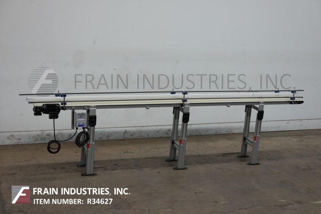 Dorner,型号2200,铝框带式输送机。配备12”宽x 144”长的皮带,29”到38”的进/出料范围和变速控制器。