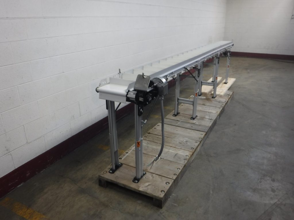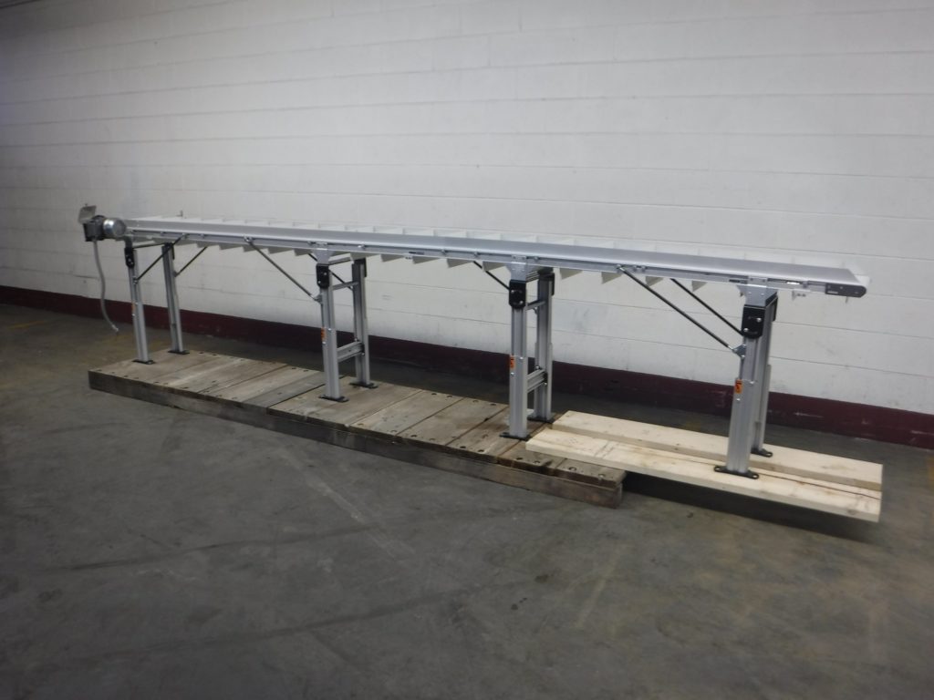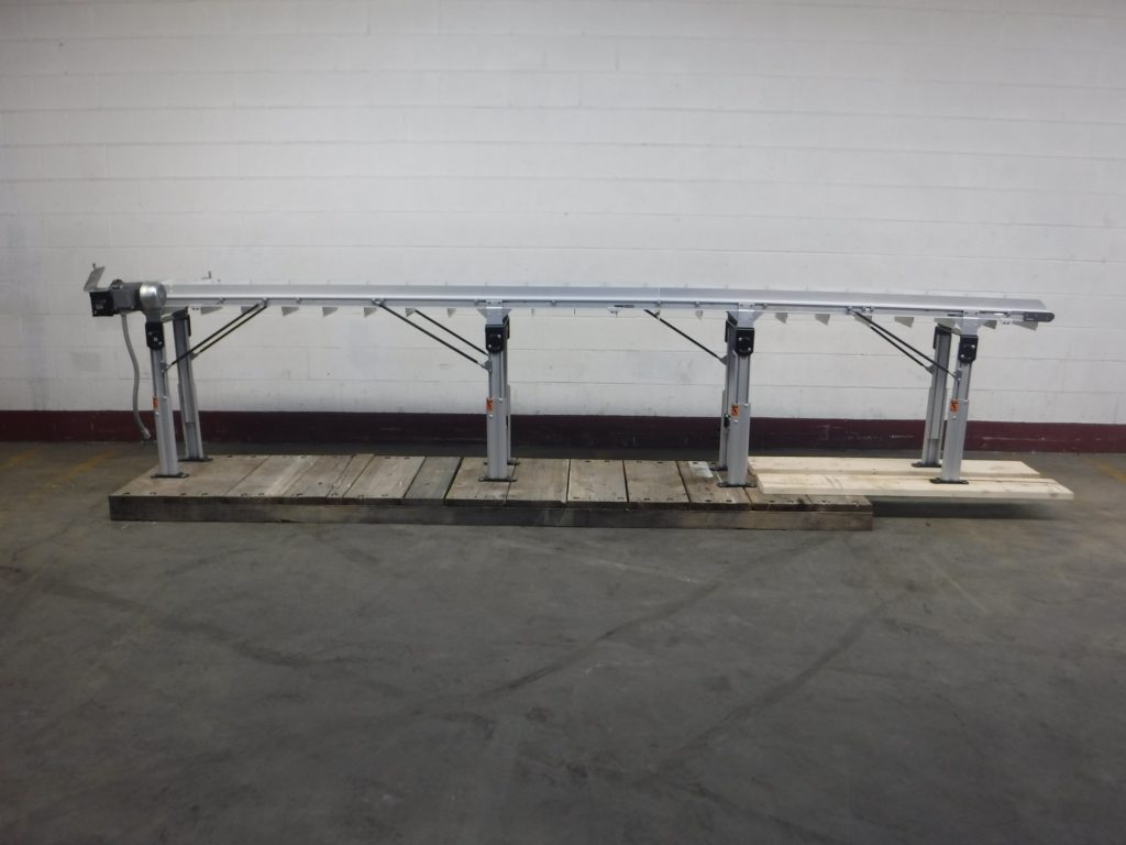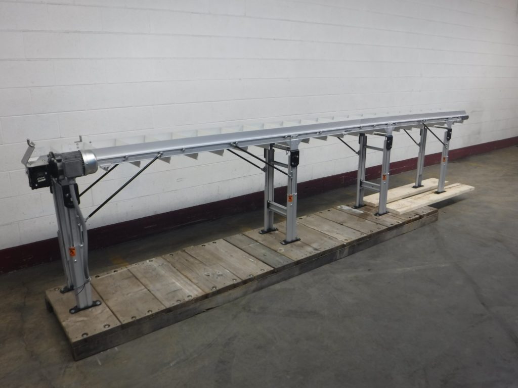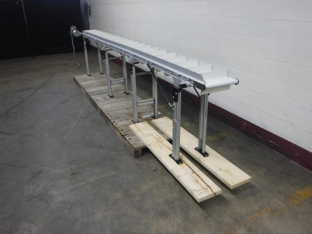 Dorner, 2200型,铝框带式输送机。配备12"宽x 168"长的氯丁橡胶带,2¼"高夹板设置在8"中心,由1 / 4马力驱动,31"至44"进料/放电范围和变速控制器。
