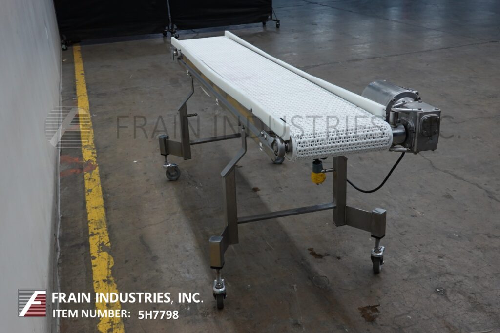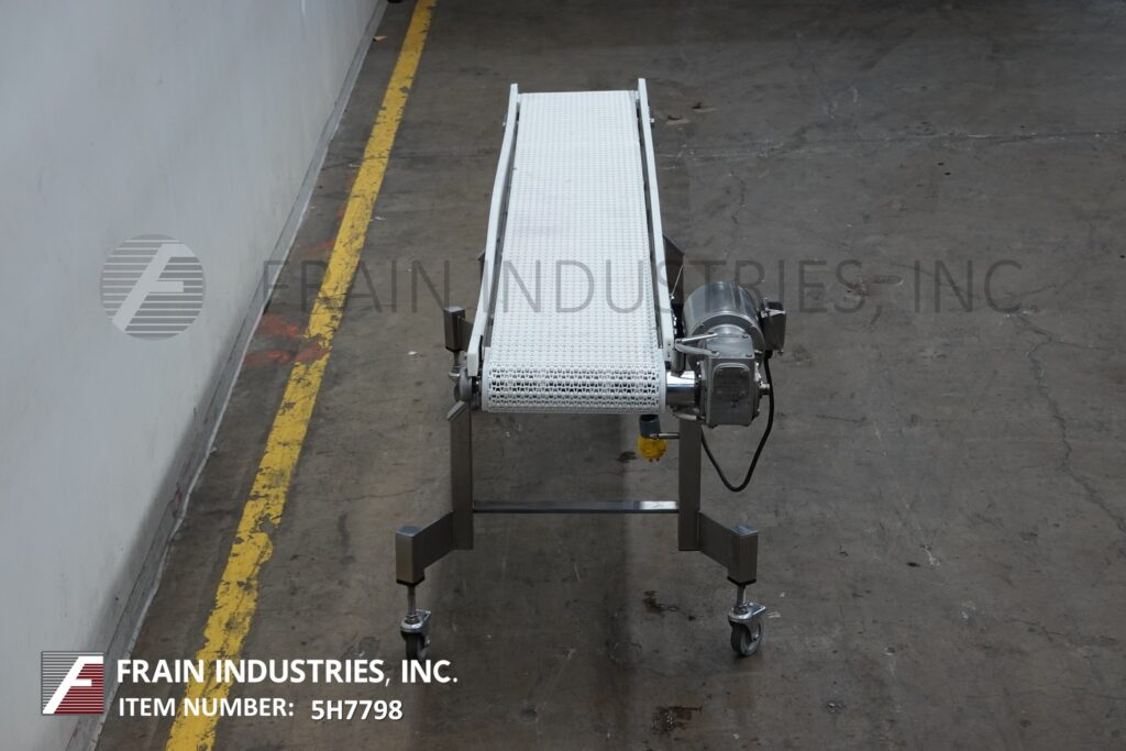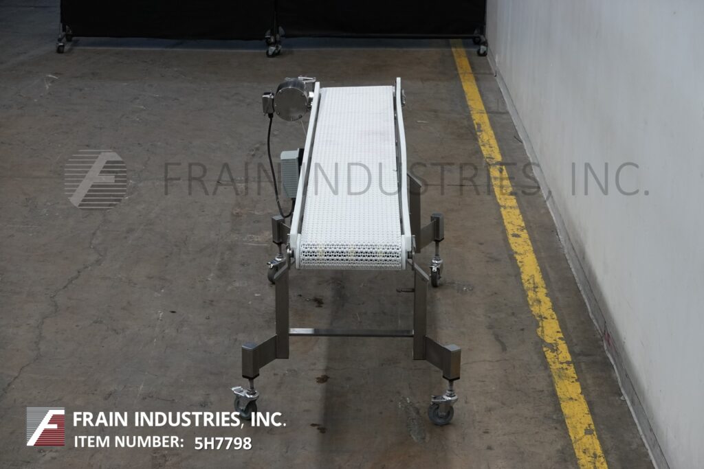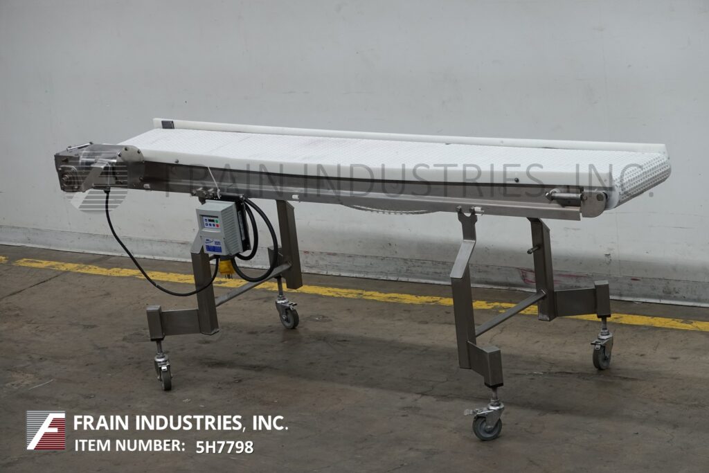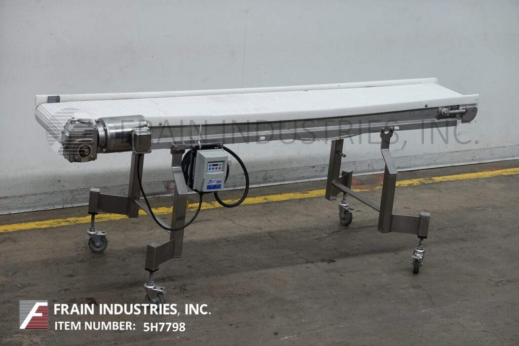 Back to All EquipmentDorner, 13½" wide x 94" long stainless steel table top conveyor. 13½" wide and 94" long Intralox belt has an infeed and discharge height of 35". Equipped with a ½ HP drive, variable speed control and mounted on locking casters.