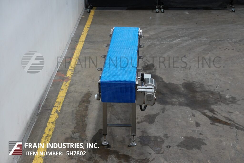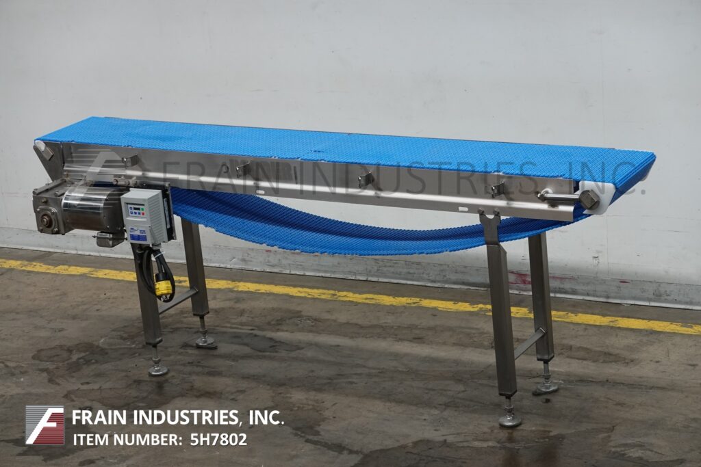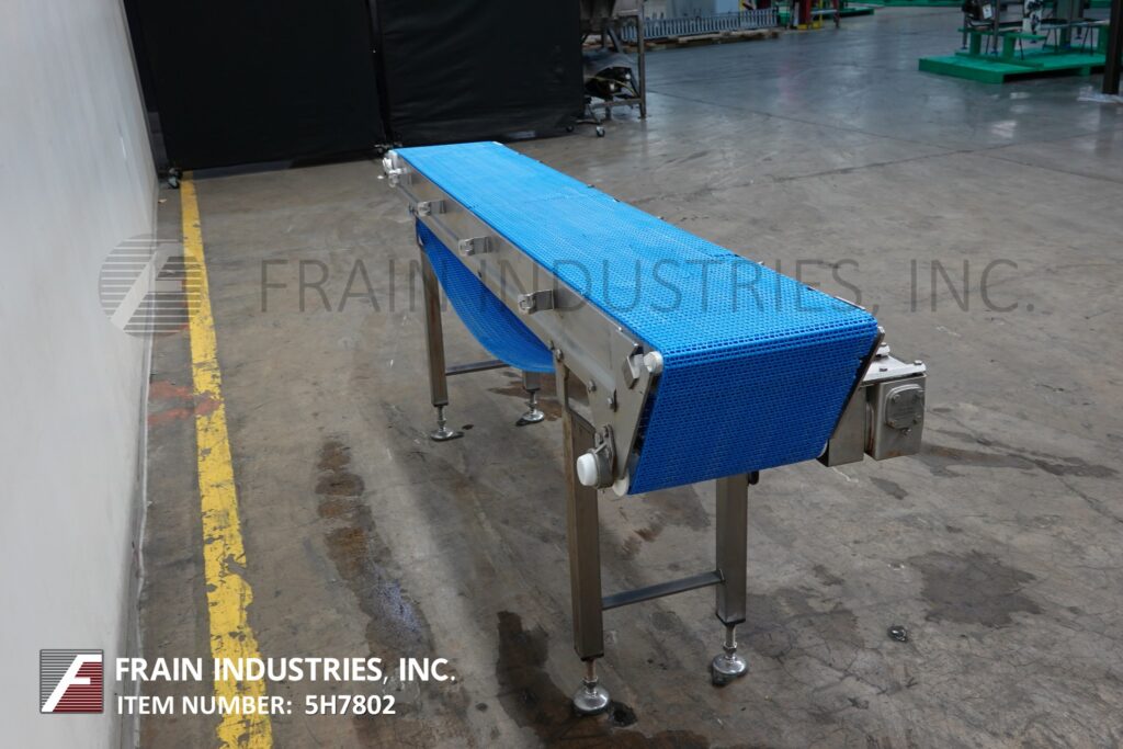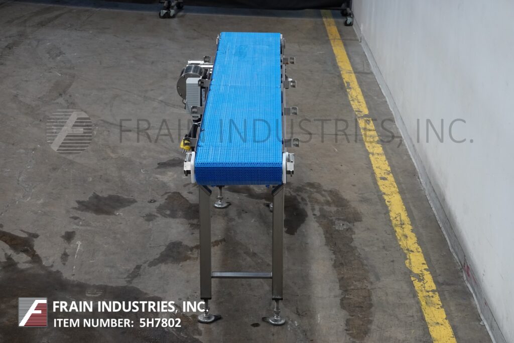 Back to All EquipmentDorner, 14" wide x 94" long stainless steel table top conveyor. 14" wide and 94" long Intralox belt has an infeed and discharge height of 37". Equipped with a ½ HP drive, variable speed control and mounted on leveling legs.