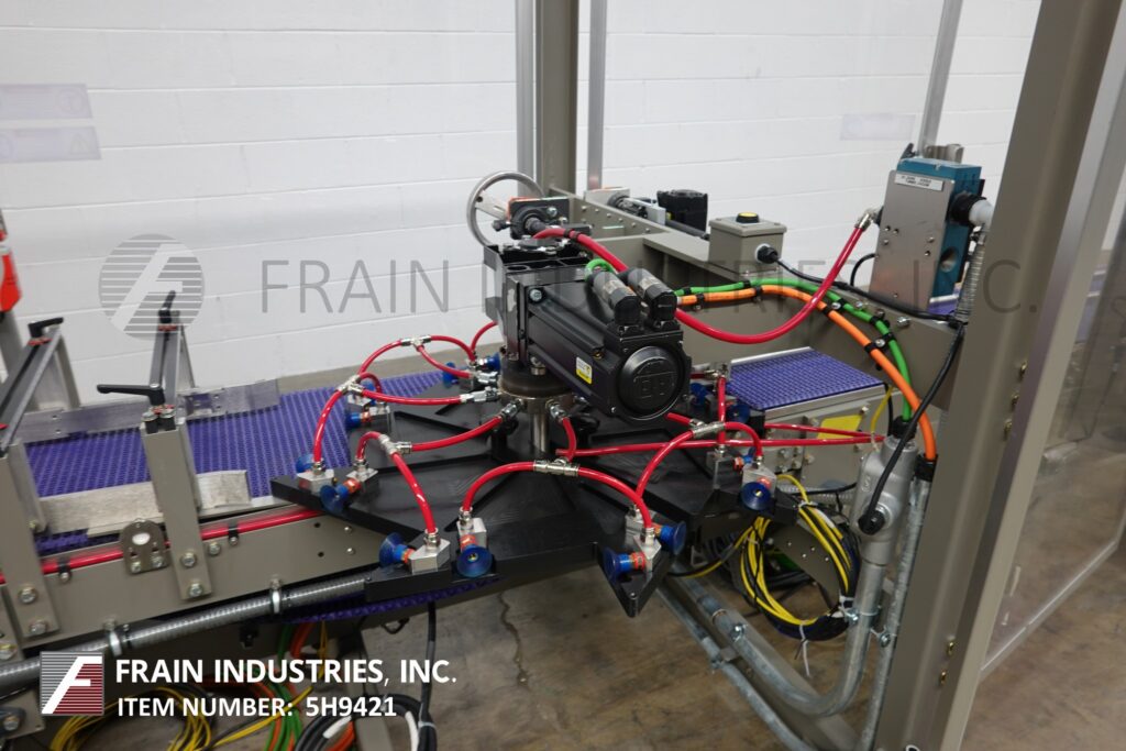 Back to All EquipmentDouglas Model Invex Series IM, Knockdown, intermittent motion, side load case packer rated from 5 to 25 cases per minute – depending on materials, application and operator dexterity. Case size range: 4" to 16" in Length x 6" to 22" in Width x 4" to 12" in High (with proper change parts). Equipped with product in feed conveyor with star wheel indexing, (4) chains adjustable set on 24" centers with 3" wide x 4" high lugs, 60" long automatic, single belt blank case magazine, (4) suction cup reciprocating pick n place, in line product collation section with side load station, Nordson hot melt glue system, side flap closers and compression section with discharge conveyor. Control panel has A/B PLC and side operator panel view controller with start. stop main machine switch and e-stop, Seko gauges and vacuum pump. Mounted on heavy duty frame with interlock safety door guarding, status light bar and leveling legs.