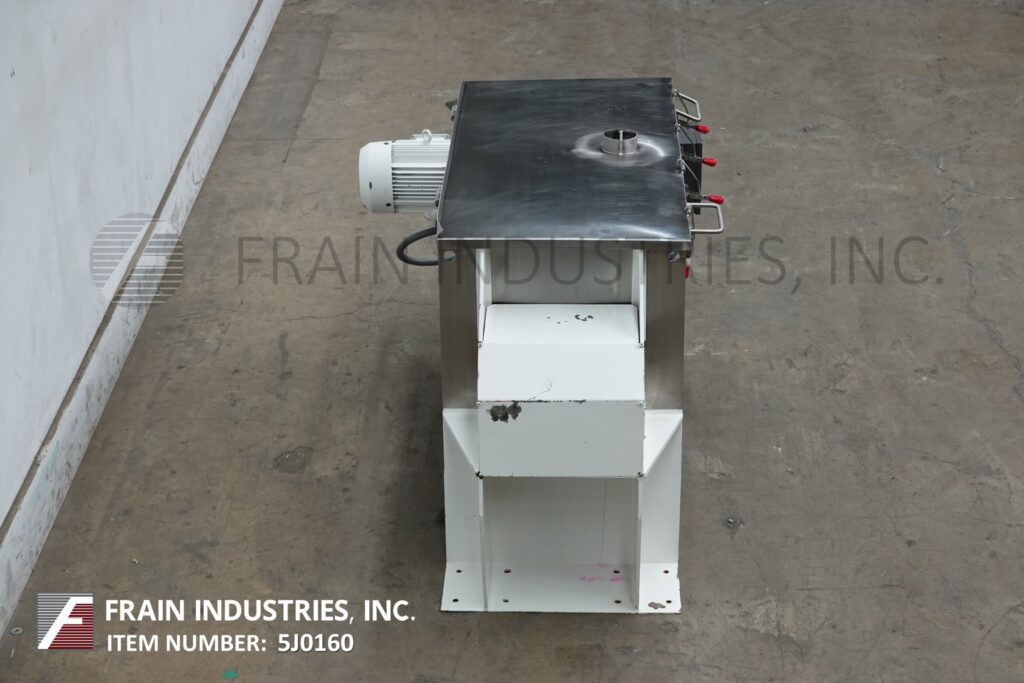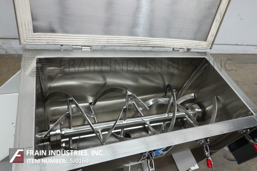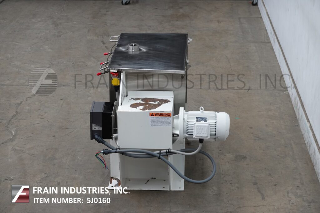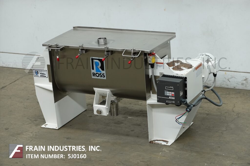 Back to All EquipmentRoss, Model 42B-005, 7 ft³ total (5 ft³ workable), double ribbon mixer with amount of product per hour – depending on materials and application. 304 stainless steel contact parts. Inner mixing chamber dimensions of: 38" in Length; 17" in Width; 21" in Depth, with flip up clamp down cover, 2½" OD mixing shaft with 1" wide x 3/16" thick (outer) and 1½" wide x 1/8" thick (inner) stainless steel ribbons powered by 3 Hp drive. 3" OD center bottom discharge has slide gate valve with 4" ground clearence. Control panel has vari-speed controller. Mounted on heavy duty frame.