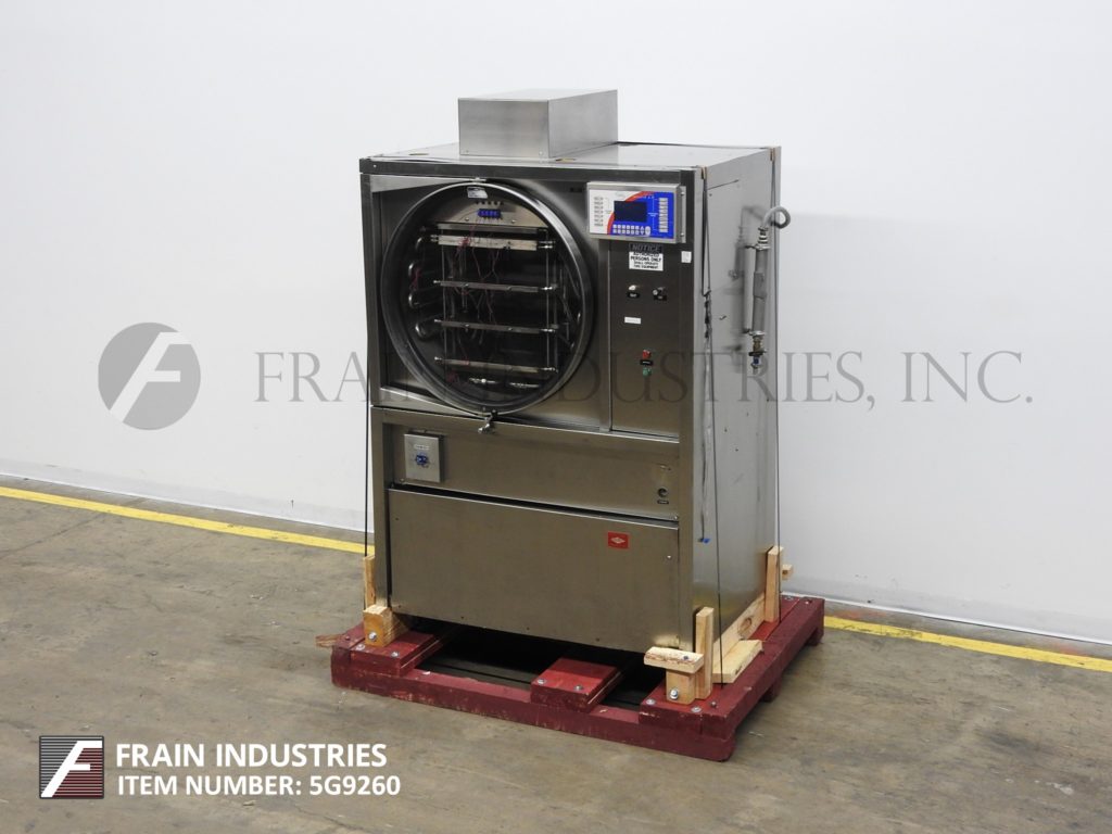 返回所有设备Virtis,型号51 SRC-5, 13.0平方英尺托盘面积,不锈钢,橱柜风格,冷冻干燥机与塞能力和产品数量每小时-取决于材料和应用。配备28"内径x 26"深产品腔,32"外径/ 28"内径可开启,看到通过的房门(4)24”长x 16”宽不锈钢货架与喷淋器内部电容器和货架1”OD喷嘴温度从-45摄氏度到+ 65摄氏度和冷凝器温度-82度C . 24小时18公斤的能力,绝对真空控制在5微米sterilzing介质的气体and steam. Control panel has touch pad controller with readout, gas inert back fill, start and stop stoppering buttons, vacuum level control dial and pressure gauges. Mounted on (4) leg frame with casters.