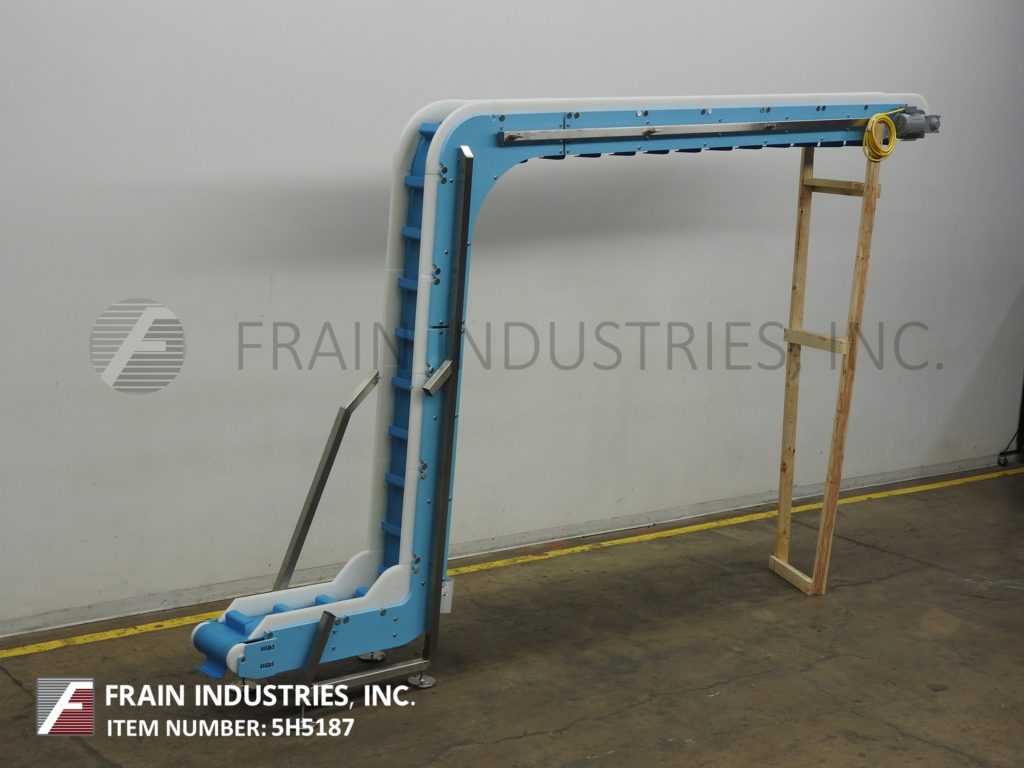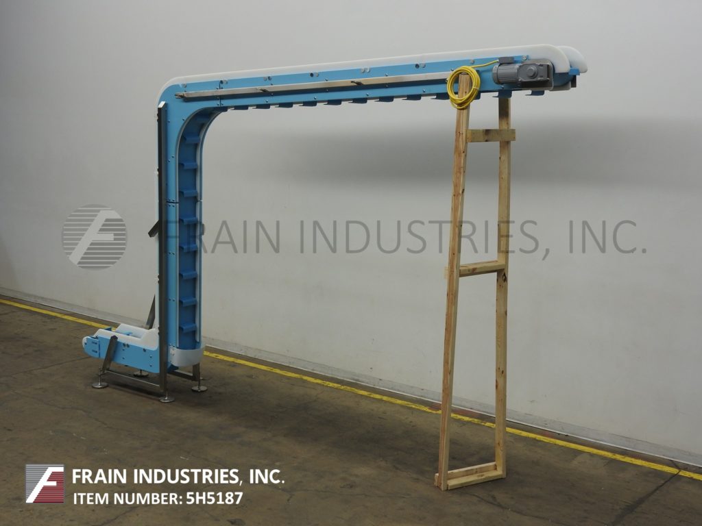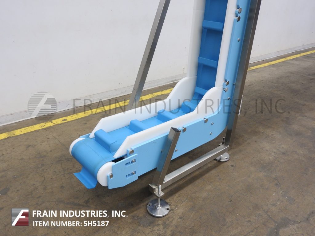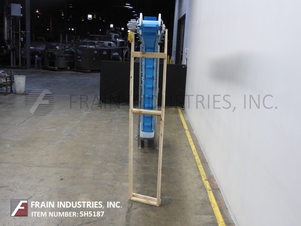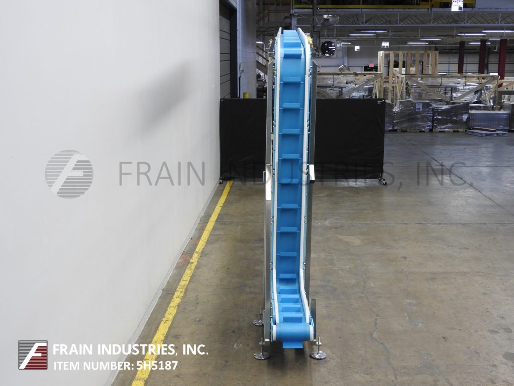 返回所有设备动态输送机,型号Dyna清洁CLN3239,倾斜楔形输送机。配备了一个17"进料,12"宽蓝色传送带2½"高夹板设置在10"中心。输送机有一个36英寸长的底部水平运行,96英寸长的斜面,140英寸长的顶部水平运行和125英寸的排放。