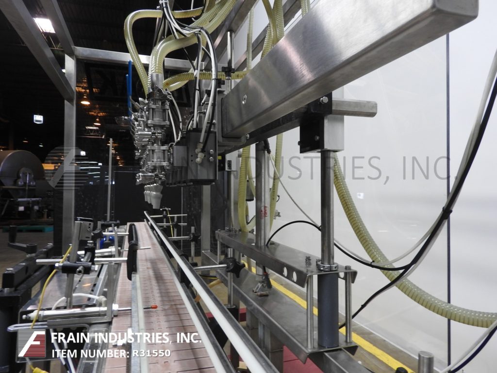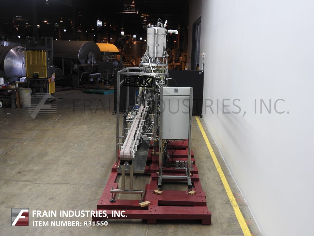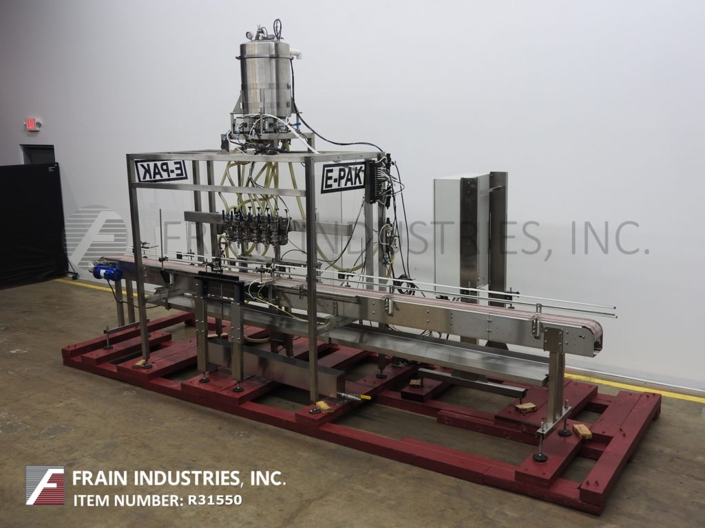 返回所有设备E-Pak, 6头,内联,不锈钢,积极置换填料额定从10到50个集装箱每分钟-取决于材料,应用和机器配置。所有316不锈钢接触部件和齿轮泵。填充范围:3盎司到加仑+/- 2%在3盎司填充。能够处理大多数类型的产品,从低粘度到中粘度到高粘度液体,以及温度范围从0到220华氏度的泡沫产品到各种各样的容器,都有适当的更换部件。配备228“长x 7”宽塑料德隆。产品在进料输送机北大国际mba索引油滴盘,72年“长手柄高度可调滑杆和齿轮(6)316不锈钢卫生泵3/4“OD灌装喷嘴和(2)流泵头填充positvie剪除。控制面板有A/B控制器与触摸板控制和面板视图与压力空气罐。安装在不锈钢底座上。