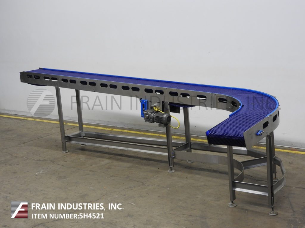 e-quip,17½“宽x 245”长,90°弯曲不锈钢输送机。配备165英寸长直截面成90°曲线,直线截面24英寸。由1 HP驱动器提供动力并安装在平整腿上。