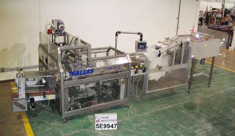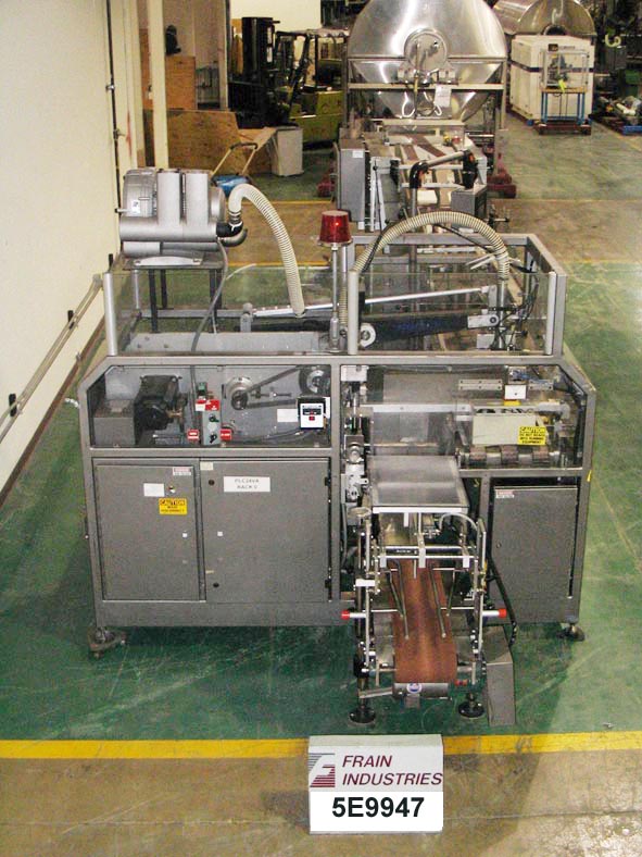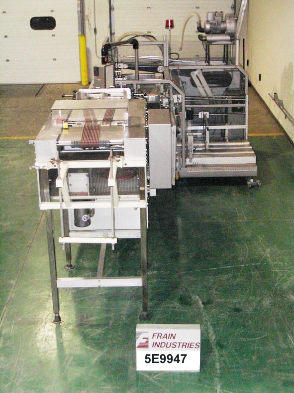 返回所有设备自动,顶载,机器人,立管器,封隔器,封隔器,每分钟可完成30个机器人循环。有一个袋的尺寸范围:(6" -14" L) x (1 12" - 8"W) x (1" - 3 1/2"H)。外壳尺寸范围:(10" - 22"L) x (6" - 14"W) x (4" - 11"H)。配备外壳转向/翻转器,(2)车道外壳进给,水平堆积,机器人真空取放臂。箱子进给平行于箱子旅行,在装载过程中防滑板在箱子下面,孟买门保持顶部襟翼在装载过程中打开,46"L动力箱子出给输送机与顶部关闭机构。42" l3 3链空壳杂志,链驱动推杆,和2杯真空挑选和放置,铰接的第三杯建立的情况。一车道/二车道纸箱分流器可交替输送一车道或其他产品,并设有橡胶绳输送器。Allen Bradley PLC控制,交流伺服电机驱动控制器,安装在龙门臂上的LED显示屏的按钮控制面板,E-stop,状态指示灯,真空泵,电子联锁屏障保护。