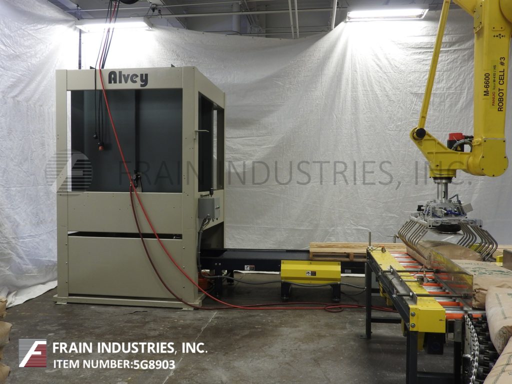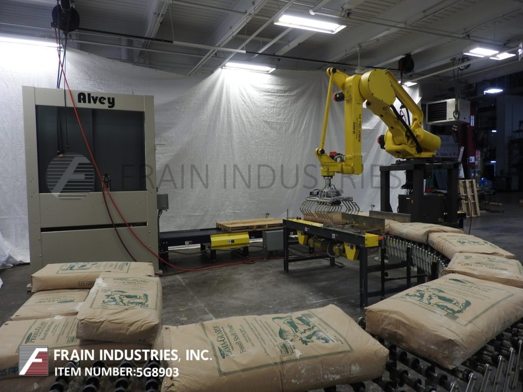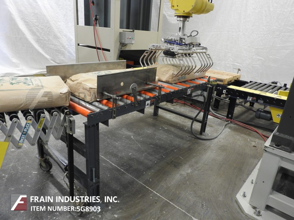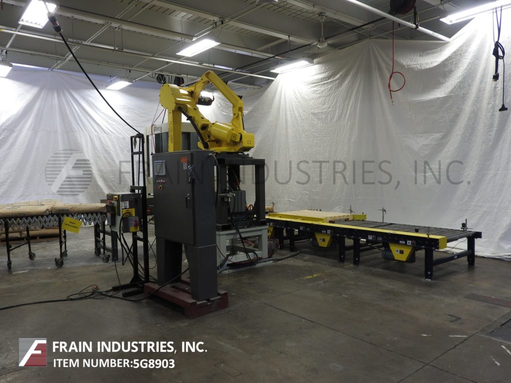 返回所有设备发那科,型号M-410iHS, 4轴机器人,伺服,真空,picn -place码垛机手臂。每分钟5到15次-取决于材料,应用,包装模式和机器配置。该单元是在地板高度和123"之间移动产品的电缆,额定承受最大220磅的重量。配备(1)18“x 44”(52)吸盘真空头安装在机械臂与78“水平达到。发那科R-J3模型控制器与手持教挂件。安装在底座框架上。