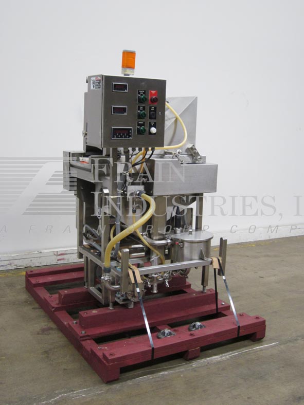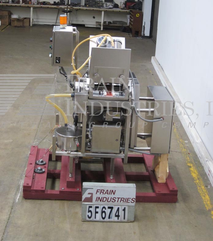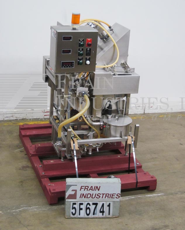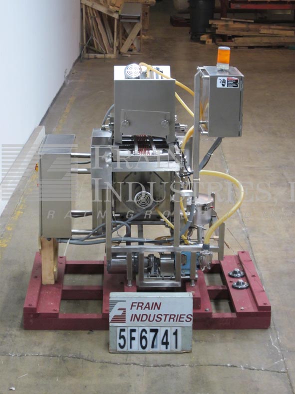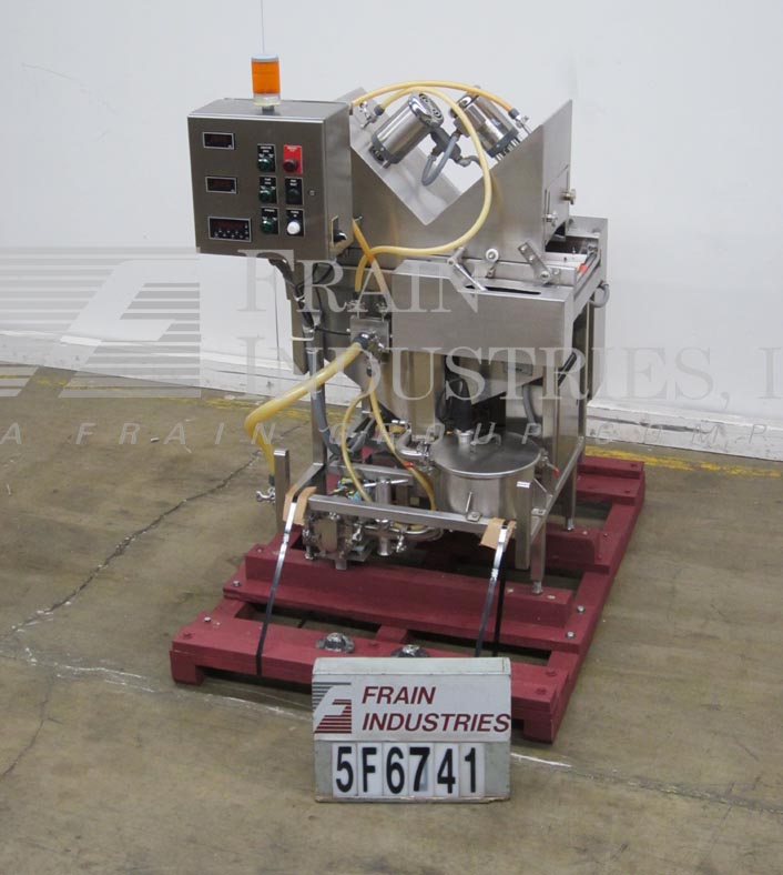 Back to All EquipmentFedco Model SS123COS, spin disc coating system, all stainless steel construction with conveyor speeds up to 45 feet per minute, number of product – depending on materials and application. Total uniform coverage of the product is achieved by the use of (3) 8" OD spinning disks (2) above (1) below with dual back to back 17" long x (9) 3/16" wide eagle belts feed conveyors, 12" ID x 8" Deep stainless steel solution filtering system with strainer, removable cover and level detector, prevents solids from reaching feed pump that could clog and effect coverage of the product. Cherry Burrell 018 all stainless steel sanitary pump for metering solutions to spinners. Control panel with start e-stop, level indictor on/off switch, pump and spin controls with conveyor FPM, pump GPM digital read outs.