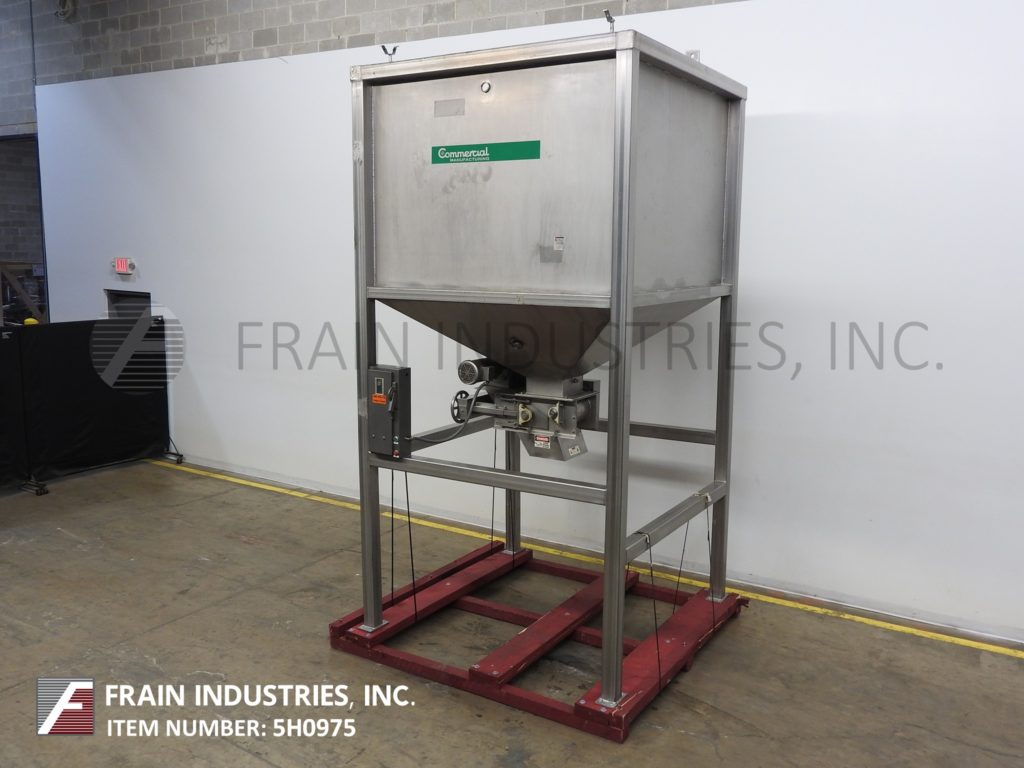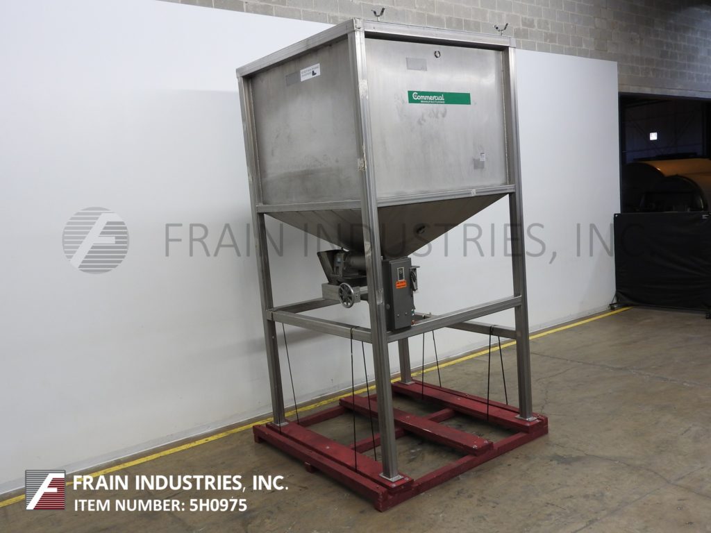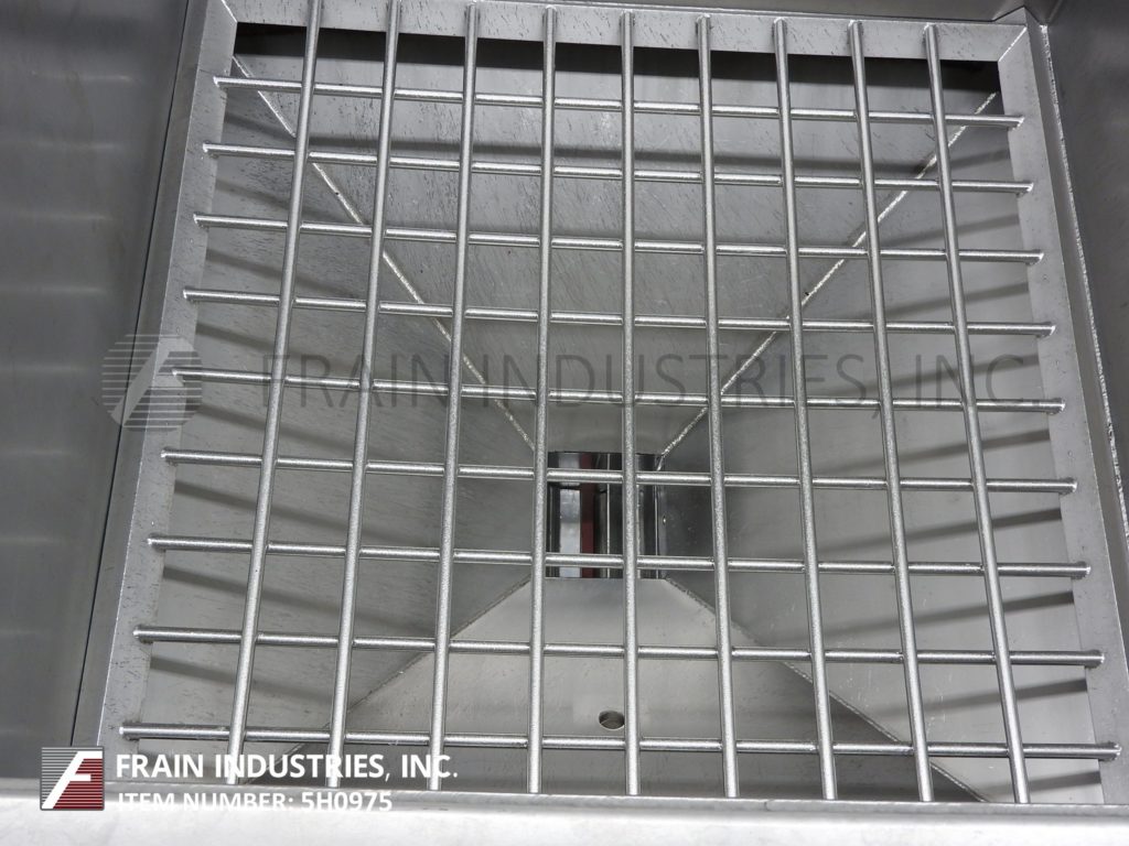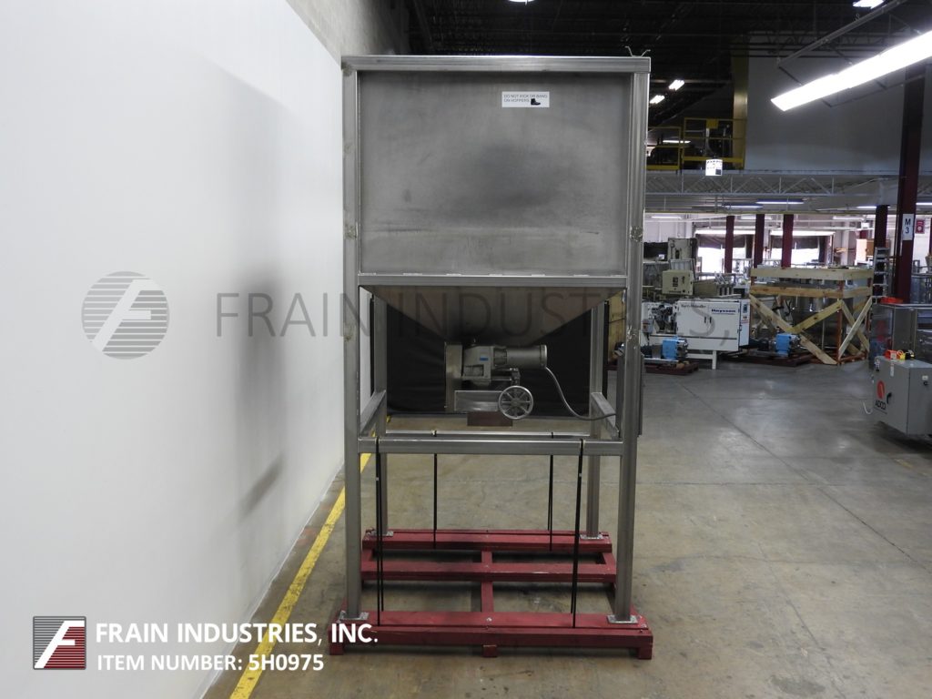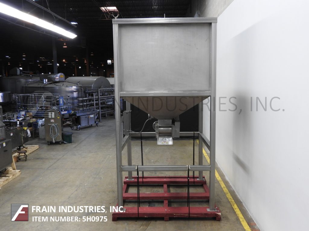 商业制造不锈钢熟饮用72“长x 72”宽x 79“深,175英尺,散装不锈钢产品料斗。单位有两个3”直径×11½“长的旋转叶片调整,可调节间隙宽度和14½”x11½“中心底部放电,带有48½”的地间隙。安装在不锈钢底架上。