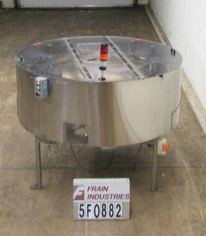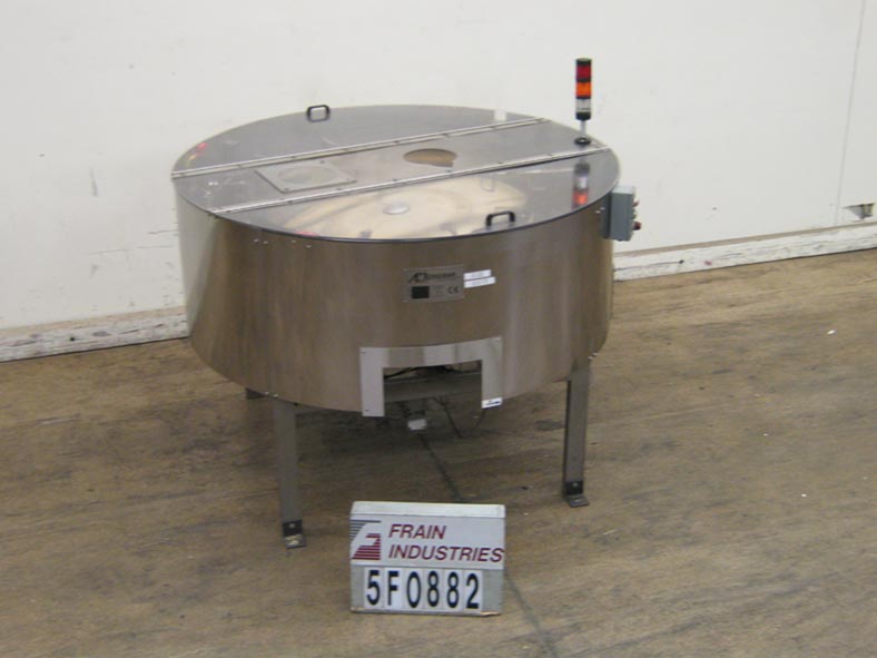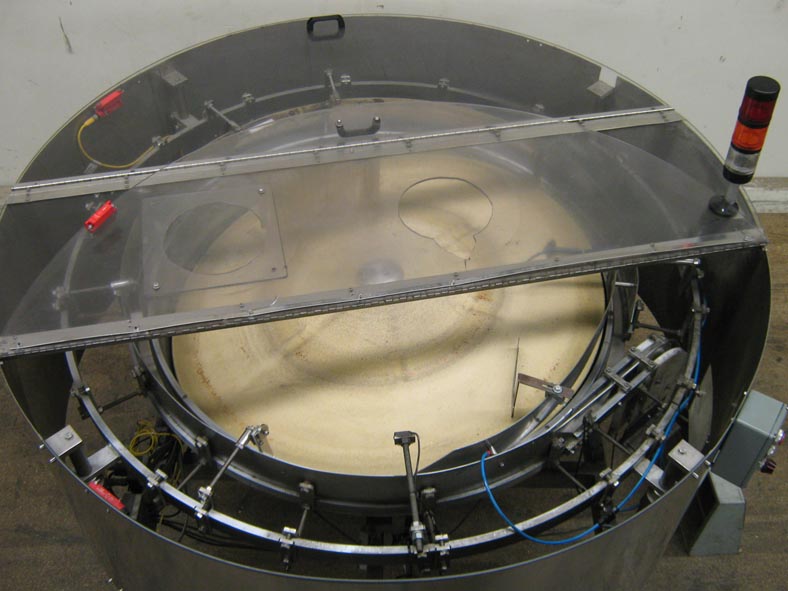 60"直径,不锈钢,碗式给料机。配备一个翻转上盖,8"直径进口,和2"宽排放溜槽。安装在不锈钢支架上,支架高度可调。最后运行2盎司瓶,每分钟150瓶。