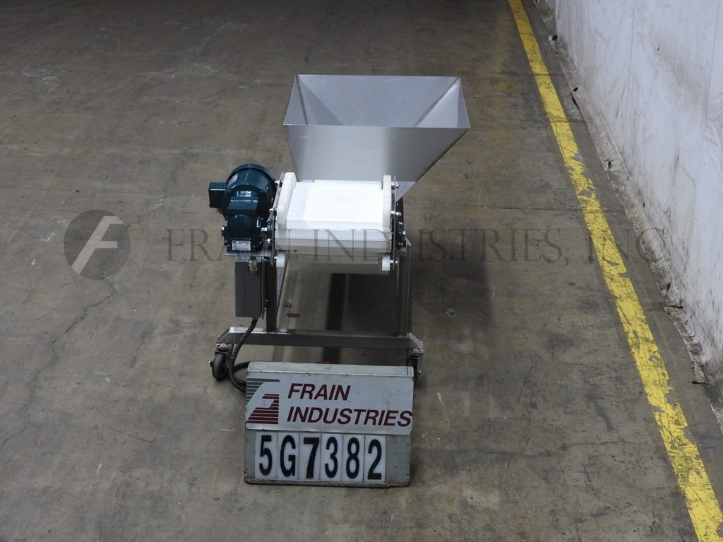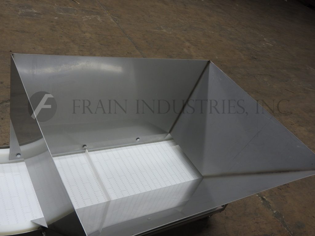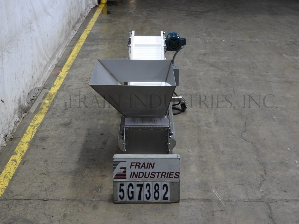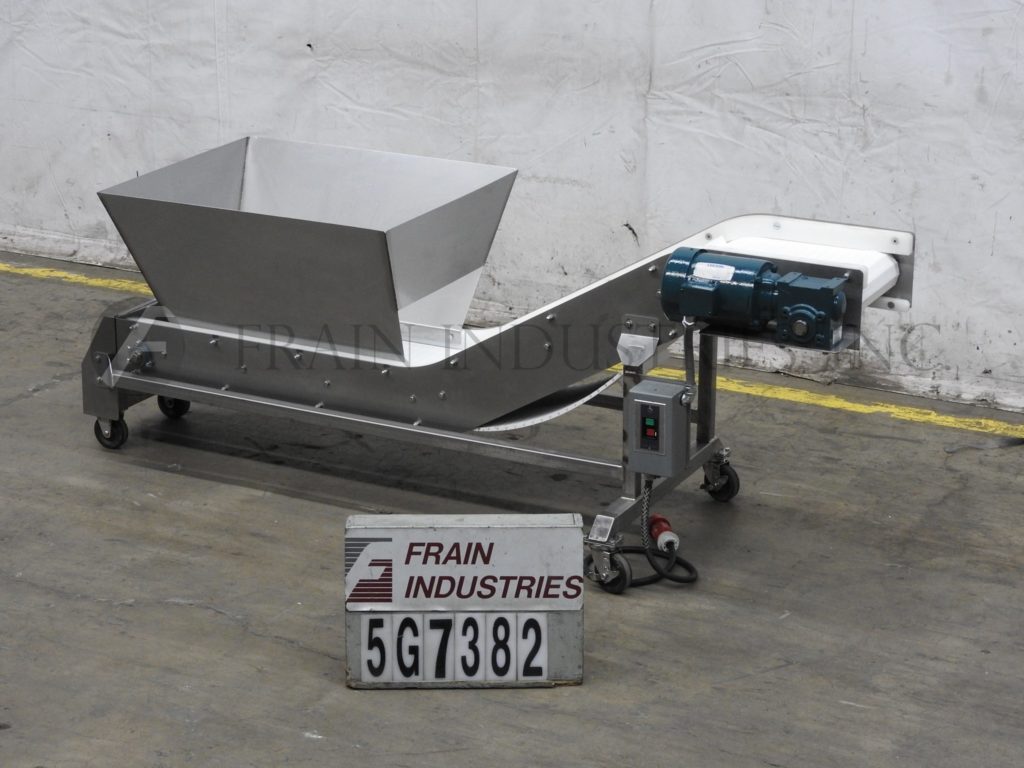 返回所有设备倾斜的夹紧输送机,不锈钢。配备36英寸长的x 30“宽x 17”深料斗,有31英寸的进给高度,16英寸进给皮带高度,12英寸“宽柔韧加载带,带有1”高x11½“宽夹板,设置在24”中心。输送机具有35“长底部水平运行,35”长倾斜,18“长顶水平跑步和30”排放高度。由顶部安装的½HP电机驱动器供电,安装在(4)腿不锈钢基架上安装脚轮。