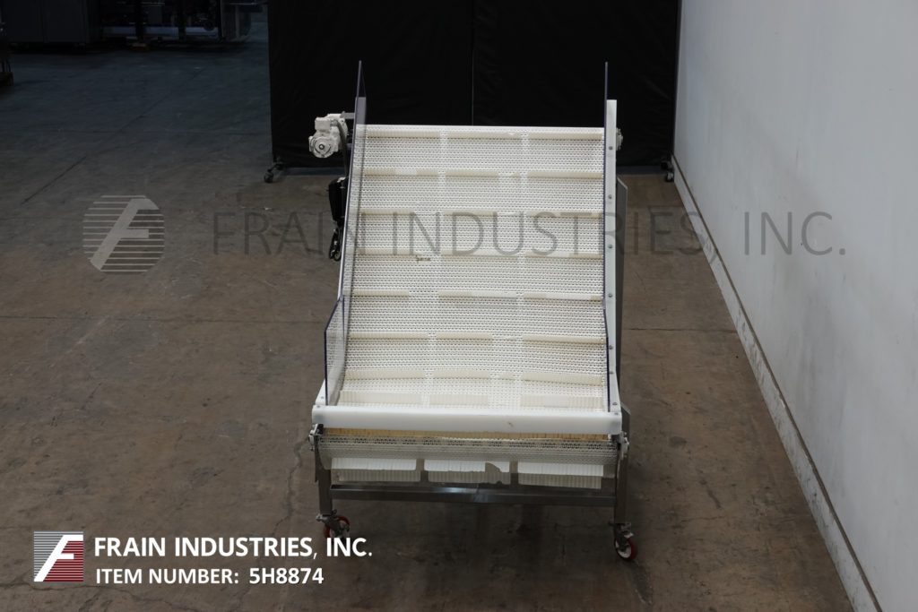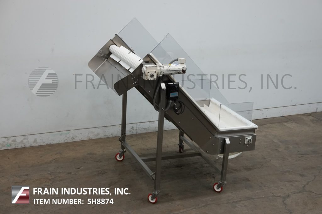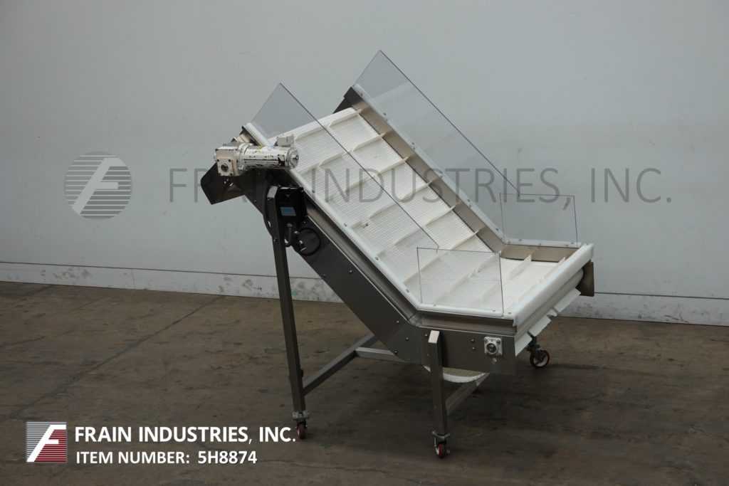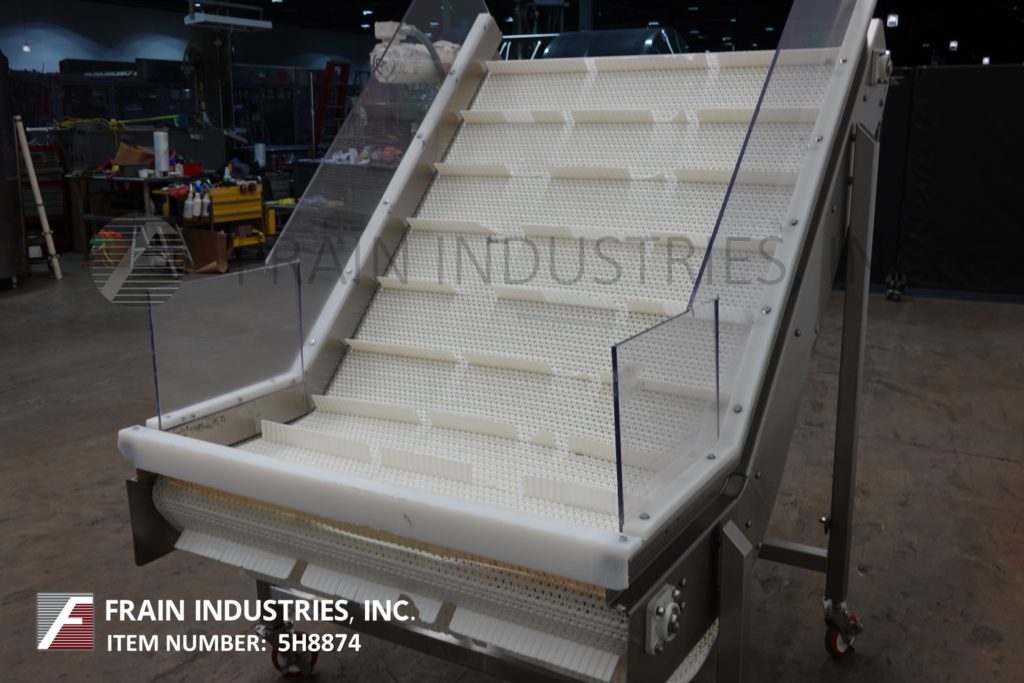 返回所有设备不锈钢斜带式输送机,每小时输送量-取决于材料和应用。配备45“宽x 70”长的白色新风带2“高夹板设置在8¼”中心。29"进料高度和67"排出高度与排出槽53"地间隙。顶部安装½Hp电机驱动器与变速控制器。安装在不锈钢框架与脚轮。