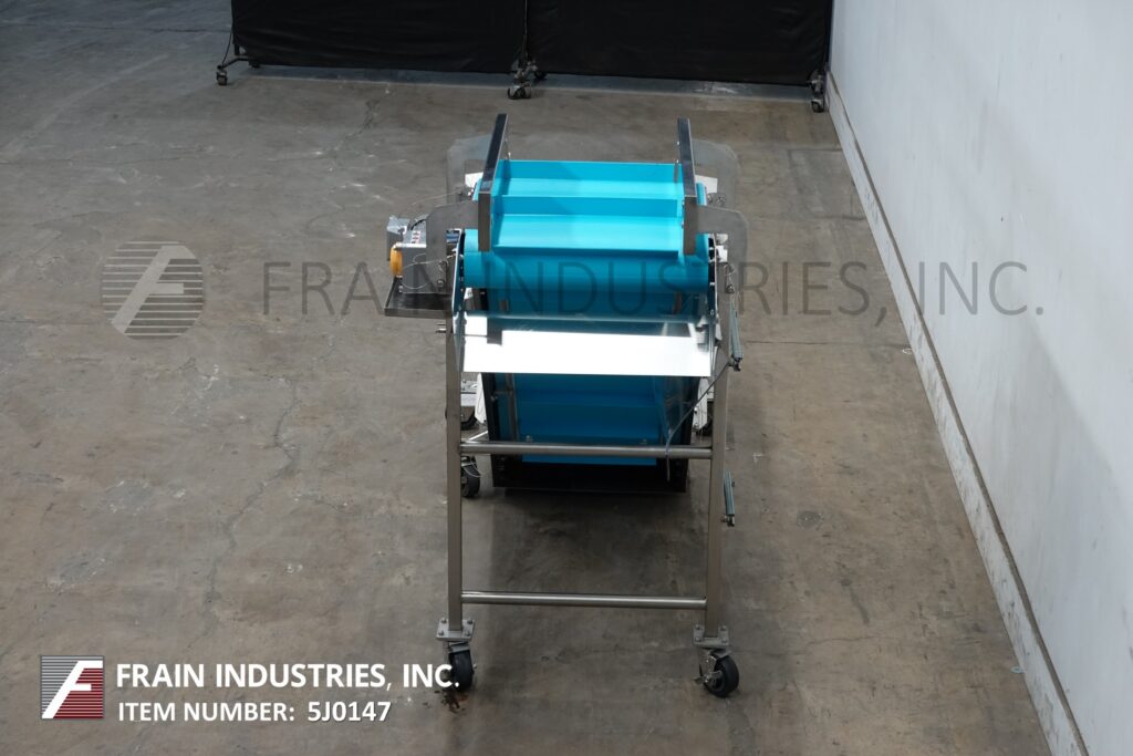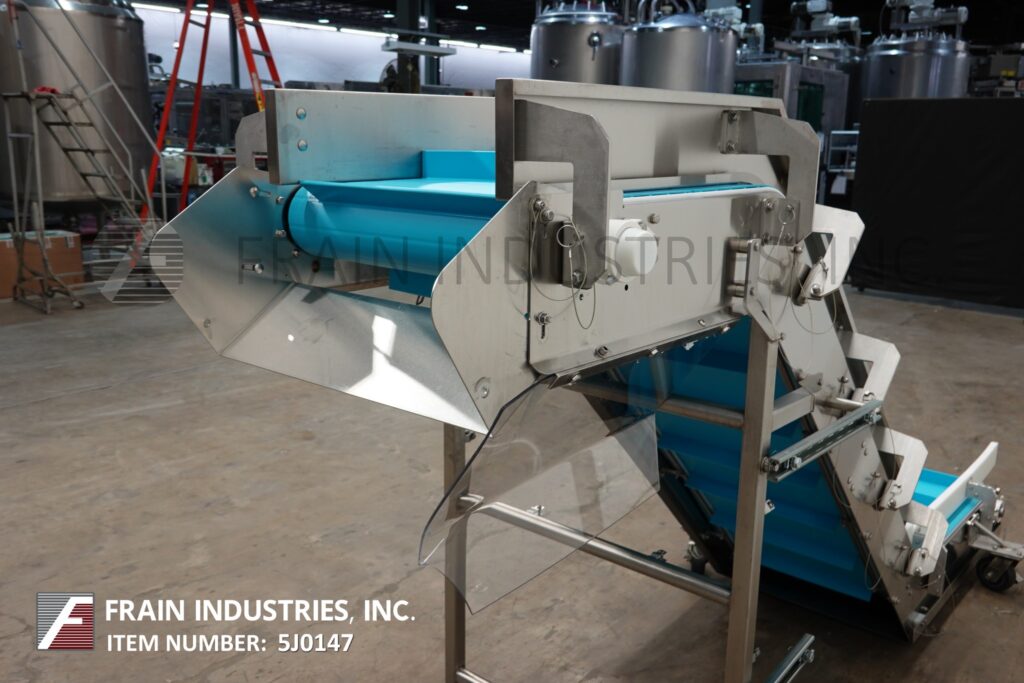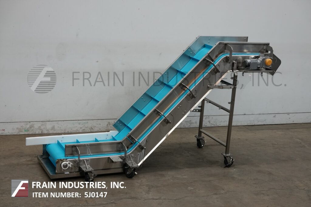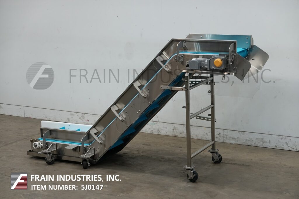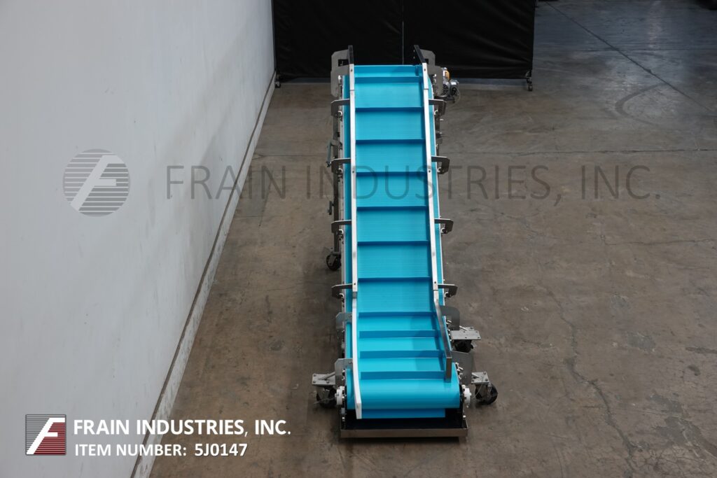 Back to All EquipmentStainless steel, inclined cleated conveyor. Equipped with 10" infeed height, 24" wide blue belt conveyor belt with 18" wide x 2" high cleats set on 9¾" centers. Conveyor has 32" long bottom horizontal run, 68" long incline, 24" long top horizontal run with 59" discharge. Powered by ½ Hp motor drive with variable speed. Mounted on stainless steel multi-leg frame with casters.