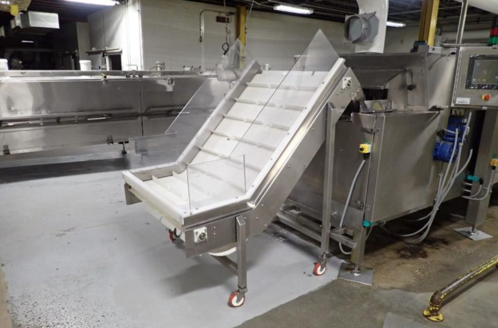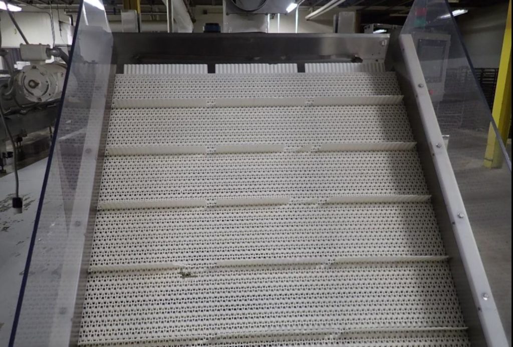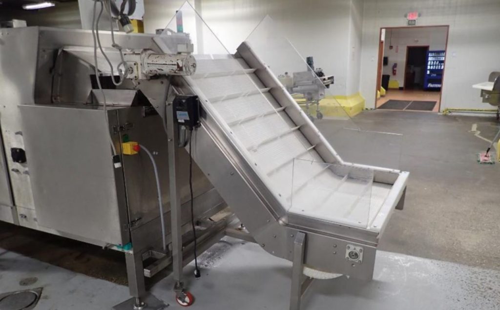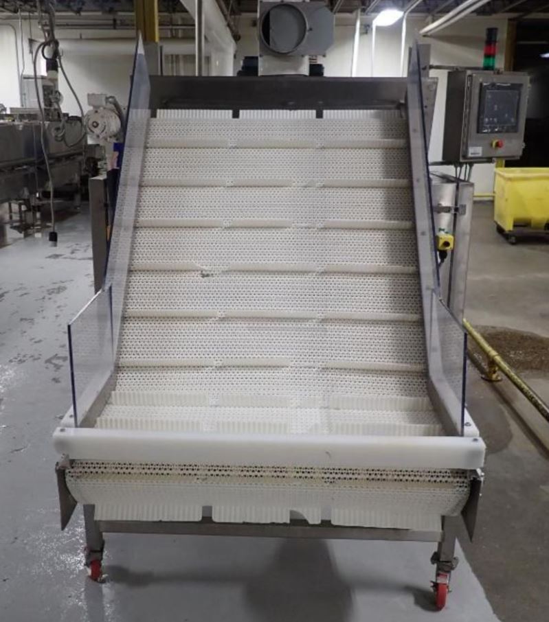 返回所有设备不锈钢倾斜的夹持式输送机,每小时的产品量 - 取决于材料和应用。配备45“宽X 70”长白色新座腰带,带有2“高夹板,套装在8英寸”中心。29英寸在进料高度和67“排出高度,带有53个”地间隙“的放电斜槽。顶部安装½HP电机驱动器,具有可变速度控制器。安装在带有脚轮的不锈钢框架上。