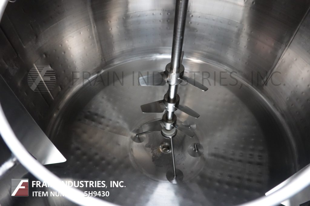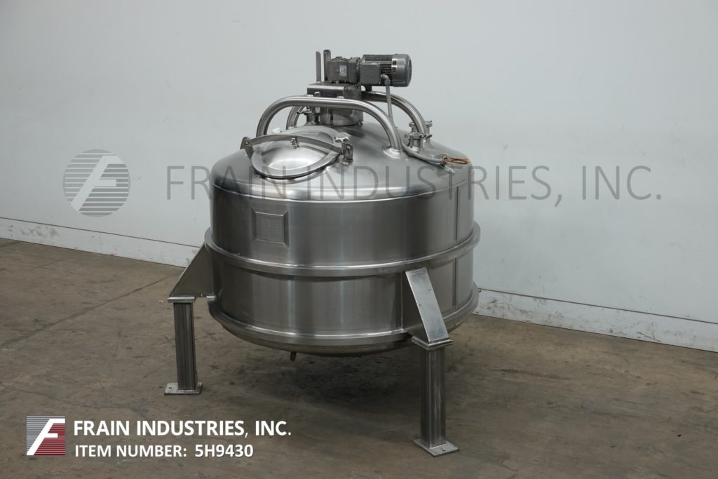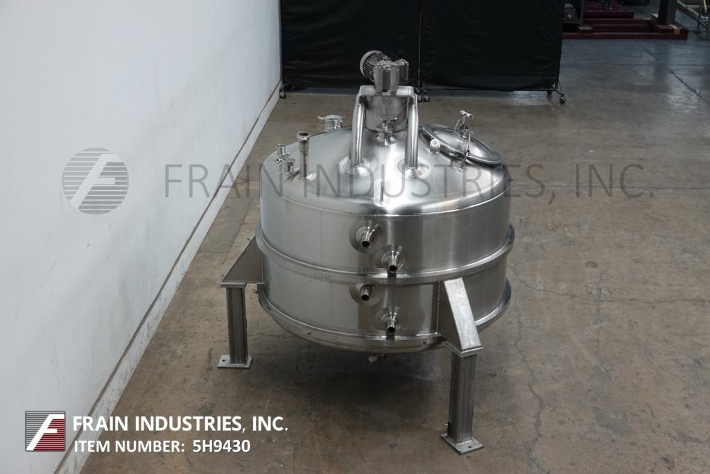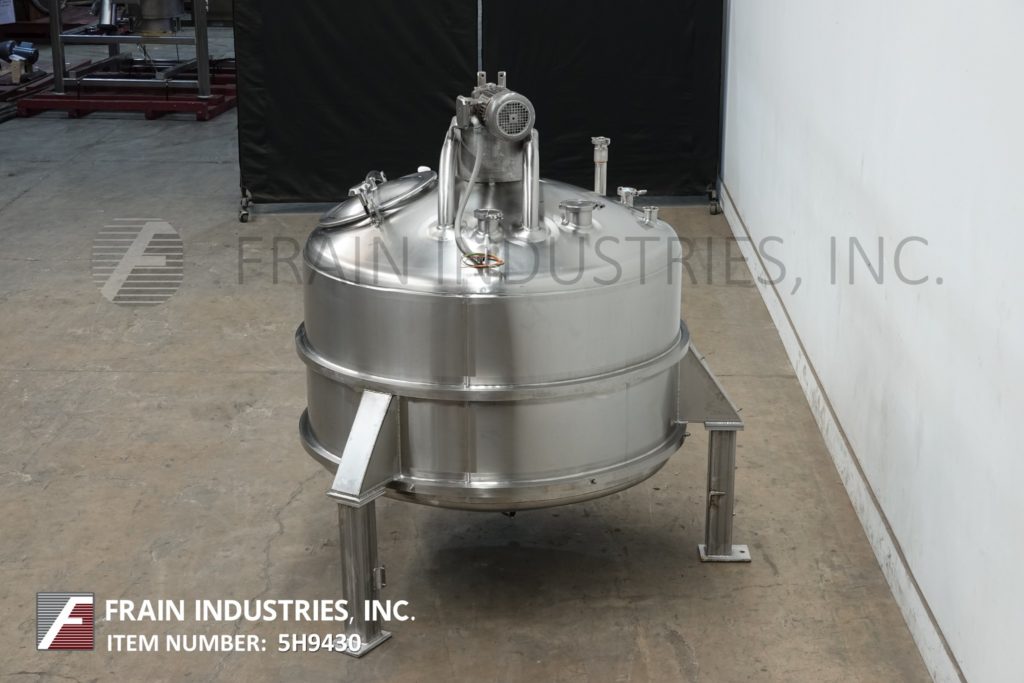 Back to All EquipmentFeldmeier, 300 gallon capacity, stainless steel jacketed process tank. 316L stainless steel contact parts and 304 stainless steel jacket and exteroir parts. Vessel dimensions: 54" diameter with 32" straight wall. Equipped with dome top, 18" OD flip top man way, top mounted 2 Hp prop agitation, CIP spray balls, (3) 4½" wide fixed baffles and thermowell. Dish bottom has 2½" OD / 2" ID center bottom discharge with 11" ground clearence.