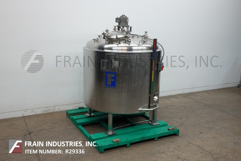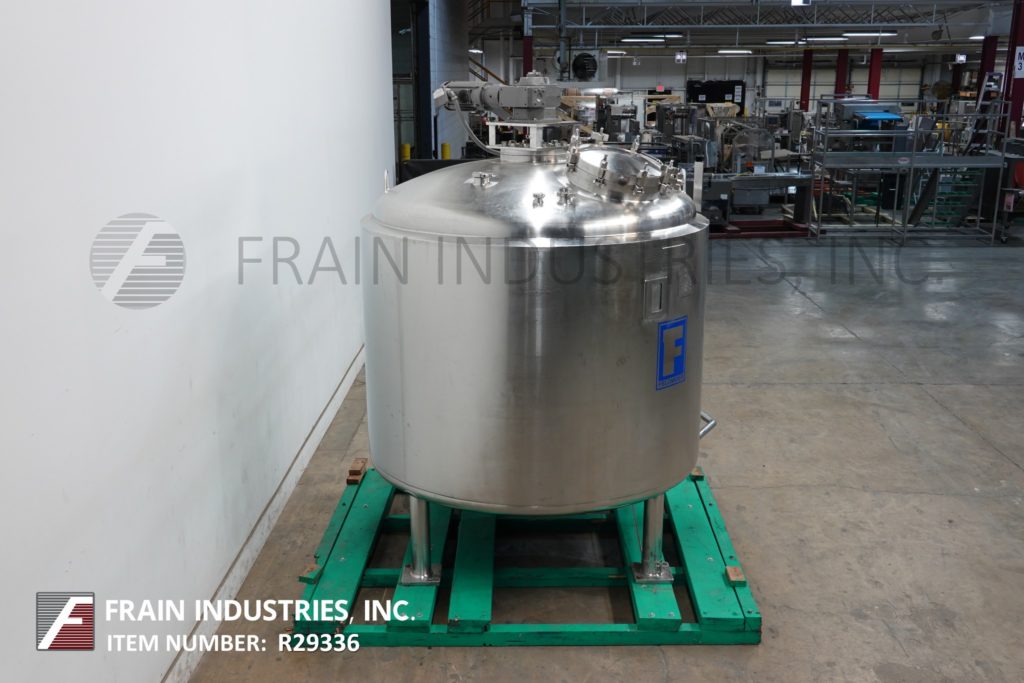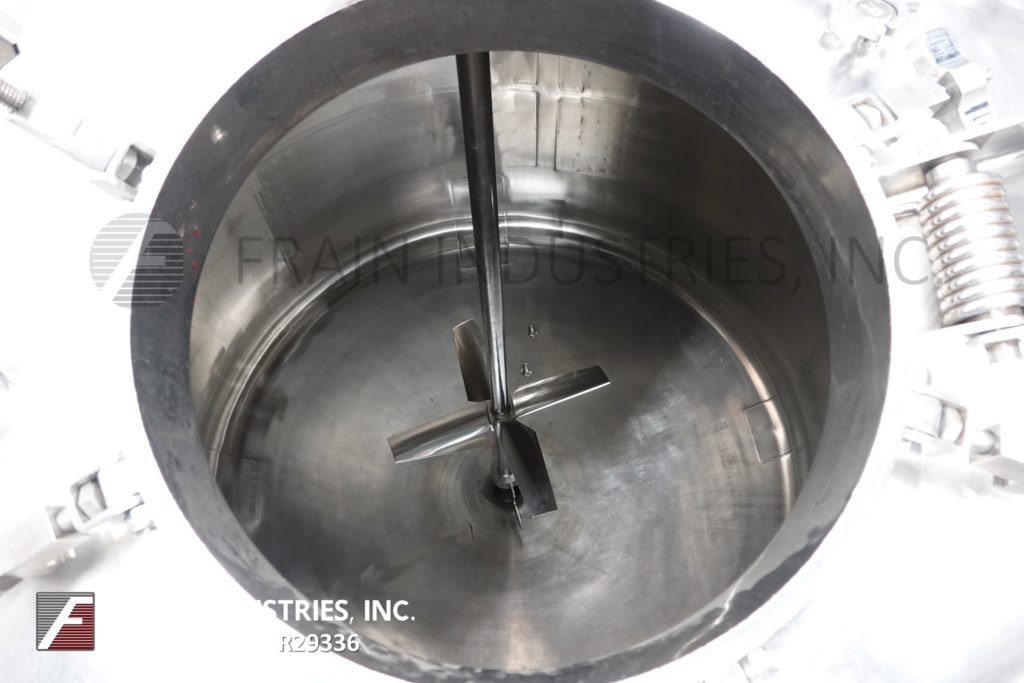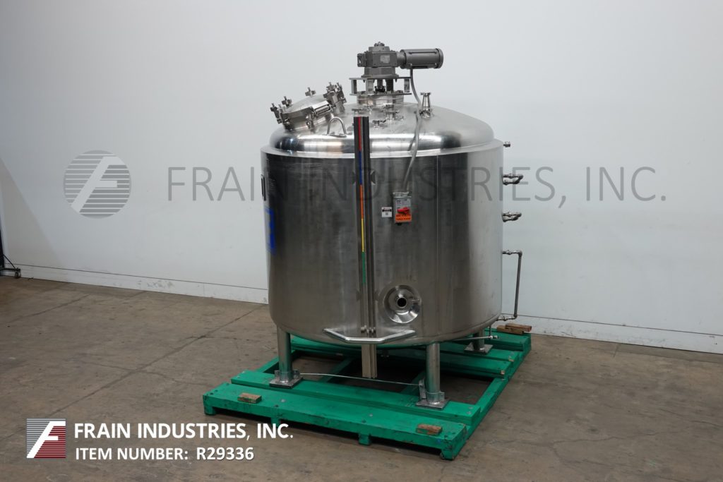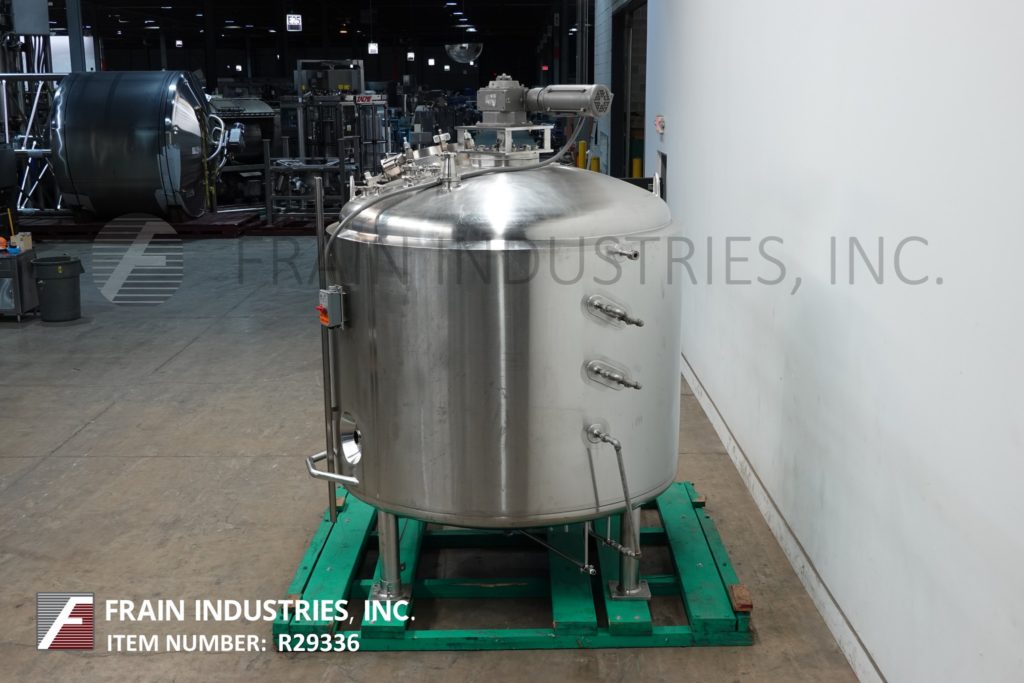 返回所有设备费尔德梅尔,容量4500升或1125加仑,316不锈钢3区夹套工艺罐。血管尺寸:76" ID x 72"深,60"直壁。配备一个圆顶顶部,倾斜的底部,(1)20“直径顶部入口铰接的人的方式,(2)温度计套管,3马力顶部安装27”直径的支柱搅拌器和2½“外径/ 2”ID三夹式底部中心放电12“地间隙。