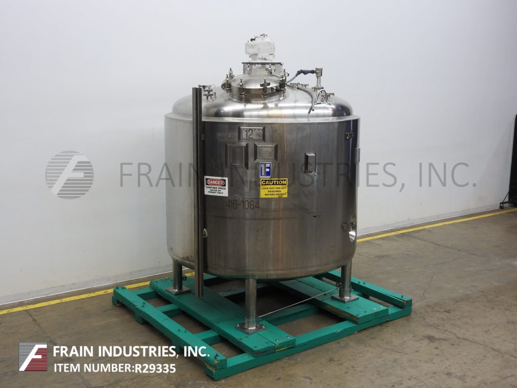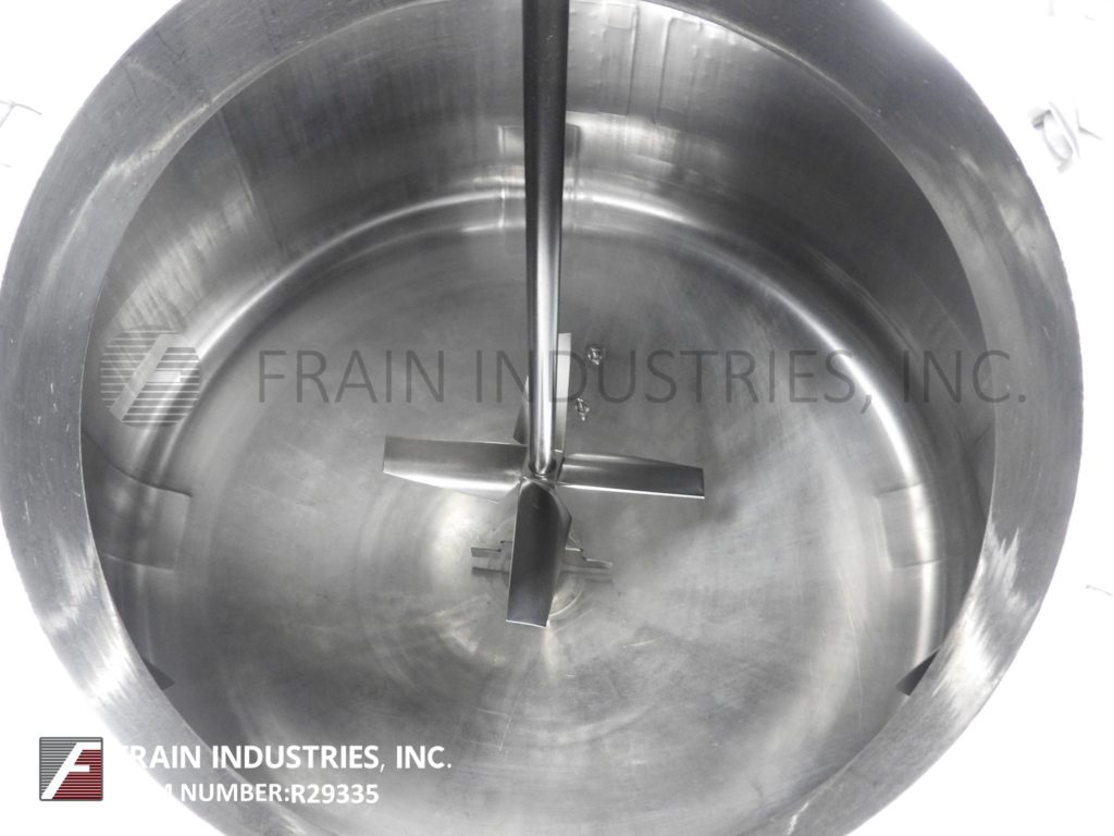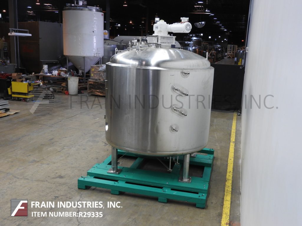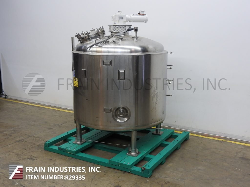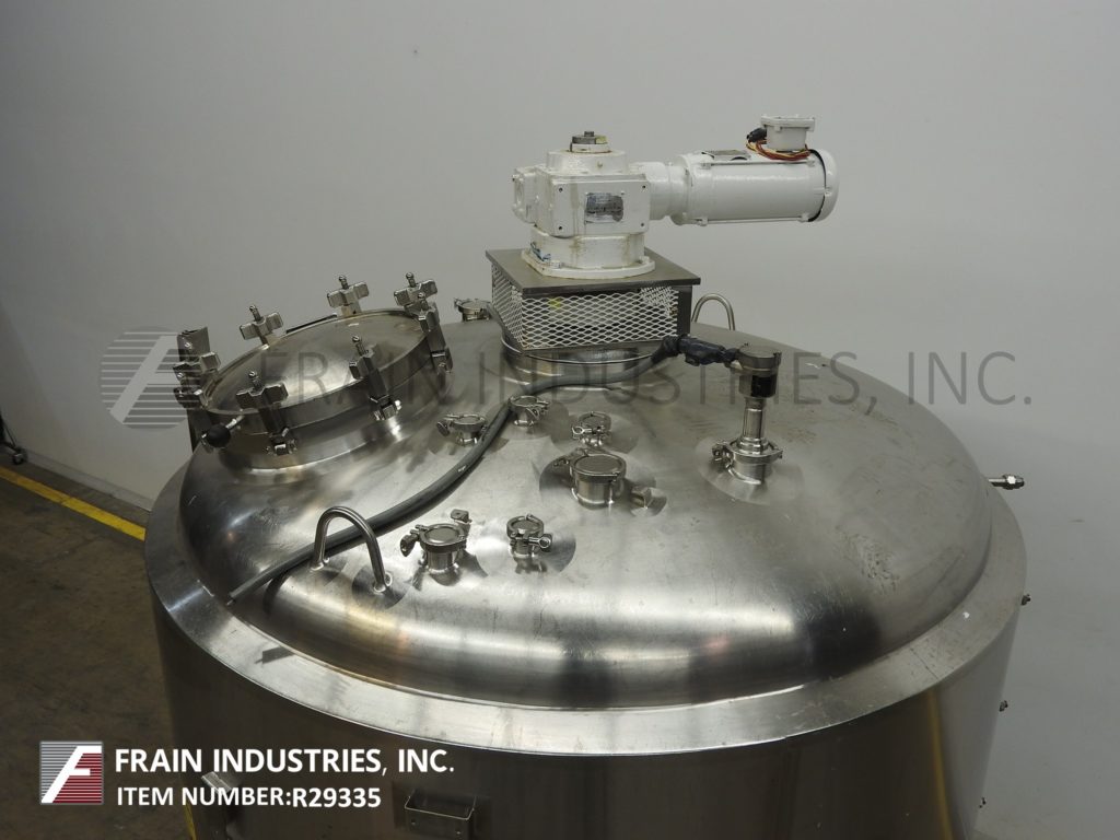 返回所有设备费尔德梅尔,容量4500升或1125加仑,316不锈钢3区夹套工艺罐。容器尺寸:76"内径x 72"深,60"直壁。配备圆顶顶部,倾斜底部,(1)20"直径顶部进入铰链式人路,(2)温度计套管,3马力顶部安装27"直径支柱搅拌器和2½"外径/ 2" ID三夹式底部中心放电与12"地间隙。