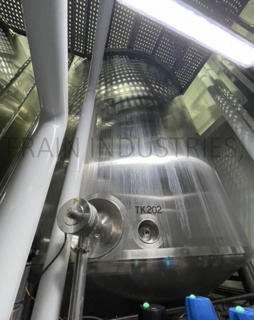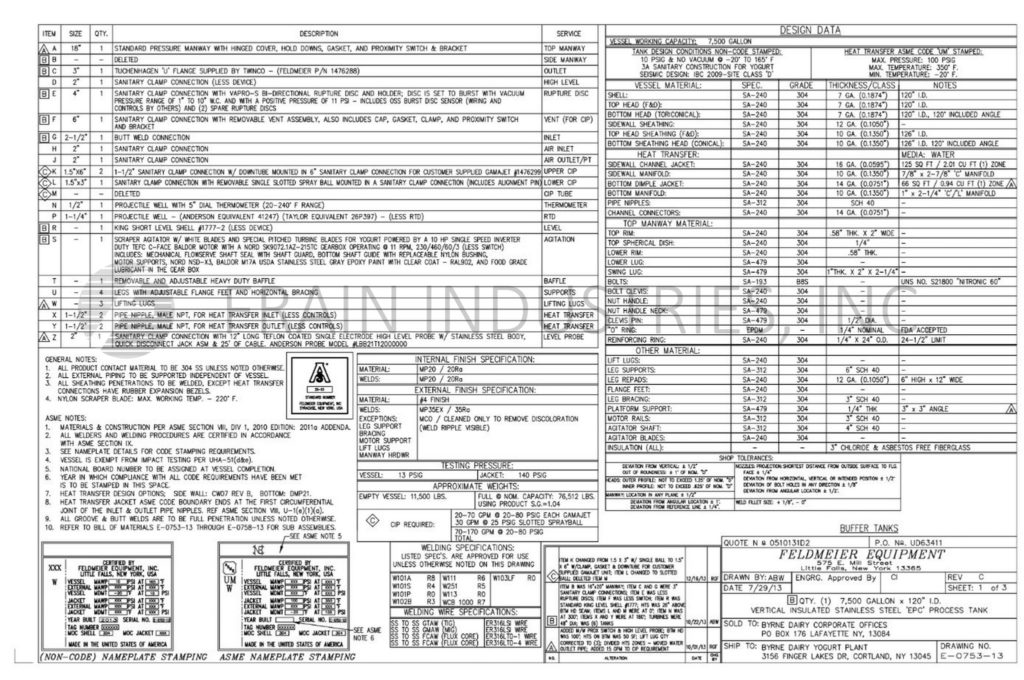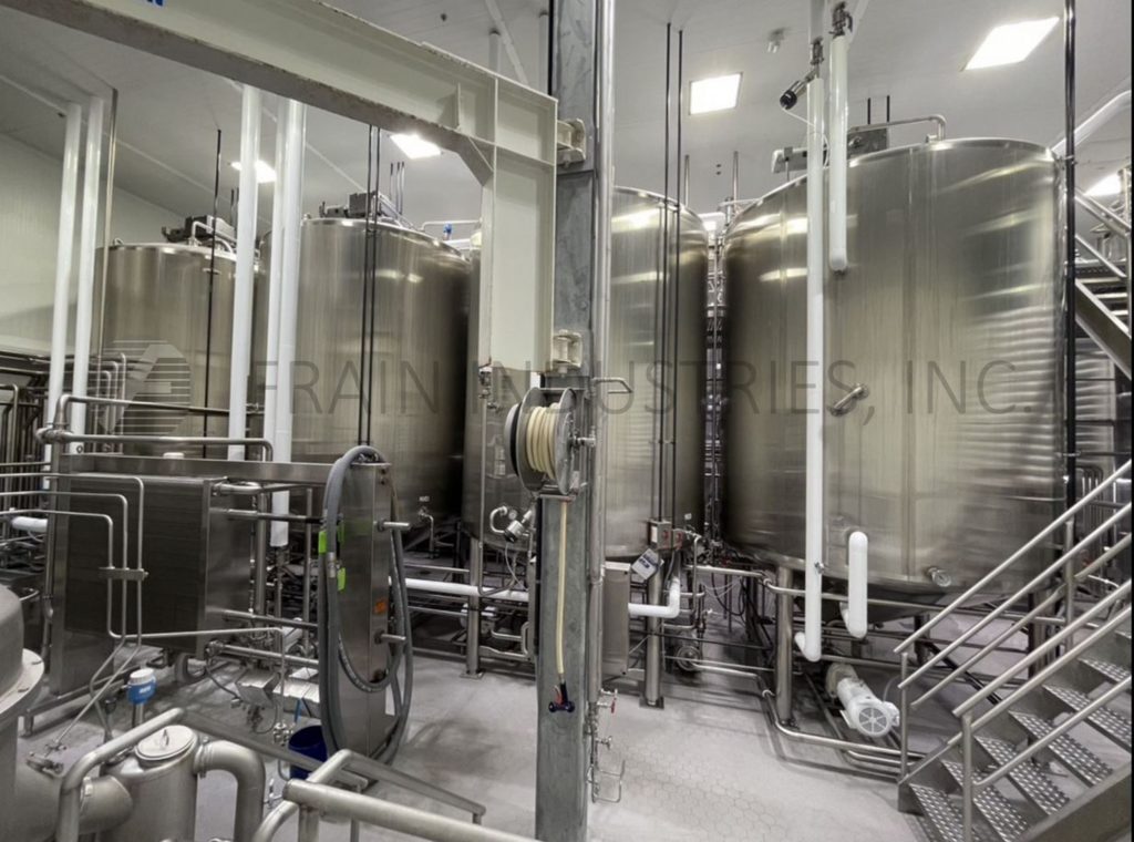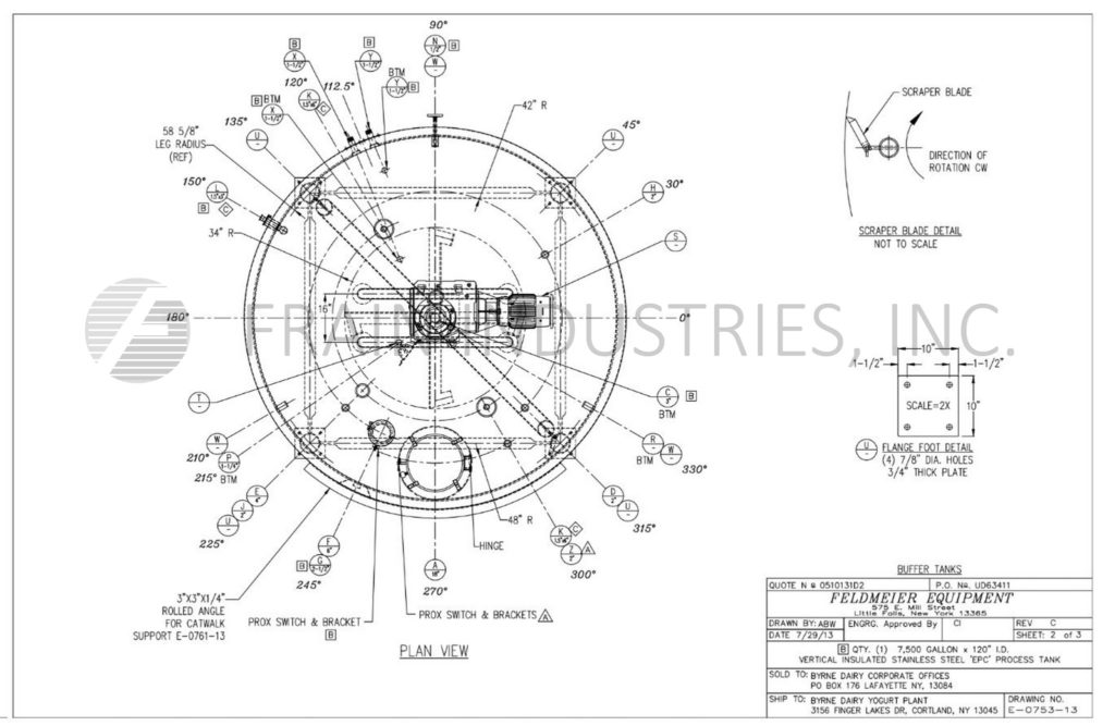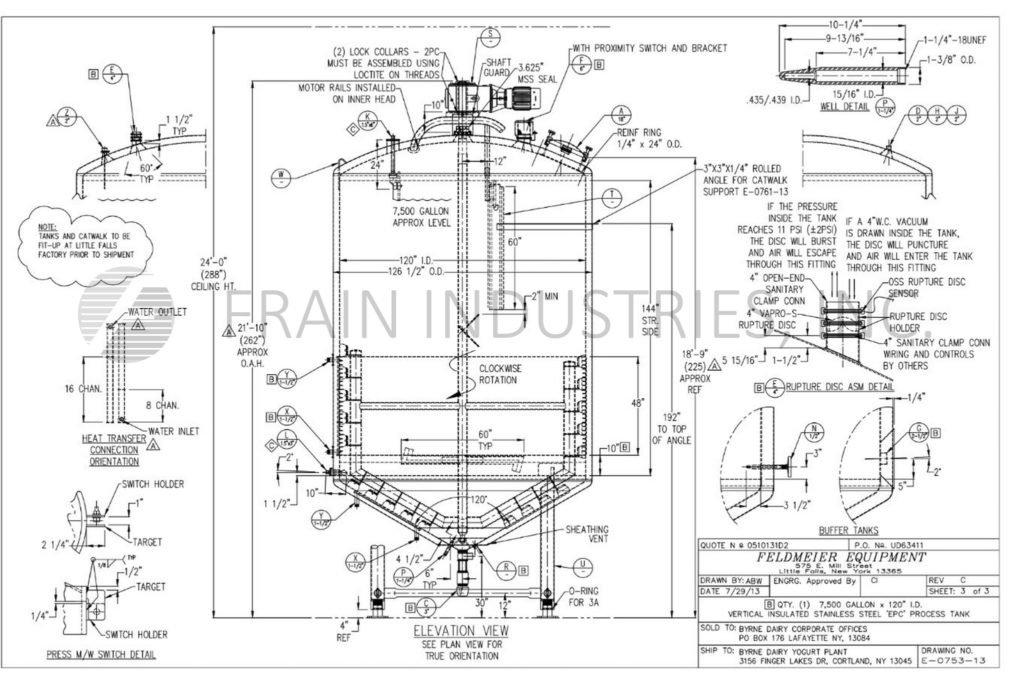 Back to All EquipmentFeldmeier, 7500 gallon capacity, stainless steel jacketed and insulated process tank. 304 stainless steel contact parts and 304 stainless steel jacket and exteroir parts. Vessel dimensions: 120" diameter with 144" straight wall. Equipped with dome top, 18" diameter bolt down man way, top mounted 10 Hp side and bottom scrape surface agitation, baffle, (2) CIP spray balls supplied by 2"OD / 1½"ID Tri-clamp fittings and thermowell. Dish bottom has 3½" OD / 3" ID center bottom pneumatic valve discharge with 30" ground clearence. Control panel with push button start / stop and variable speed control. Mounted on (4) legs with foot pads.