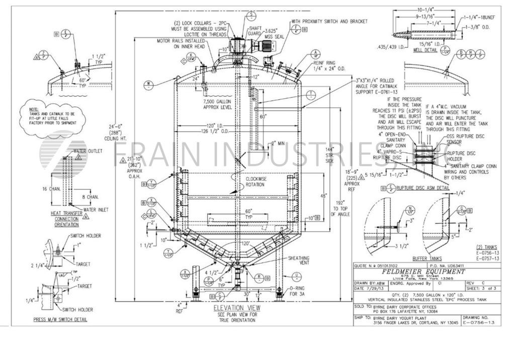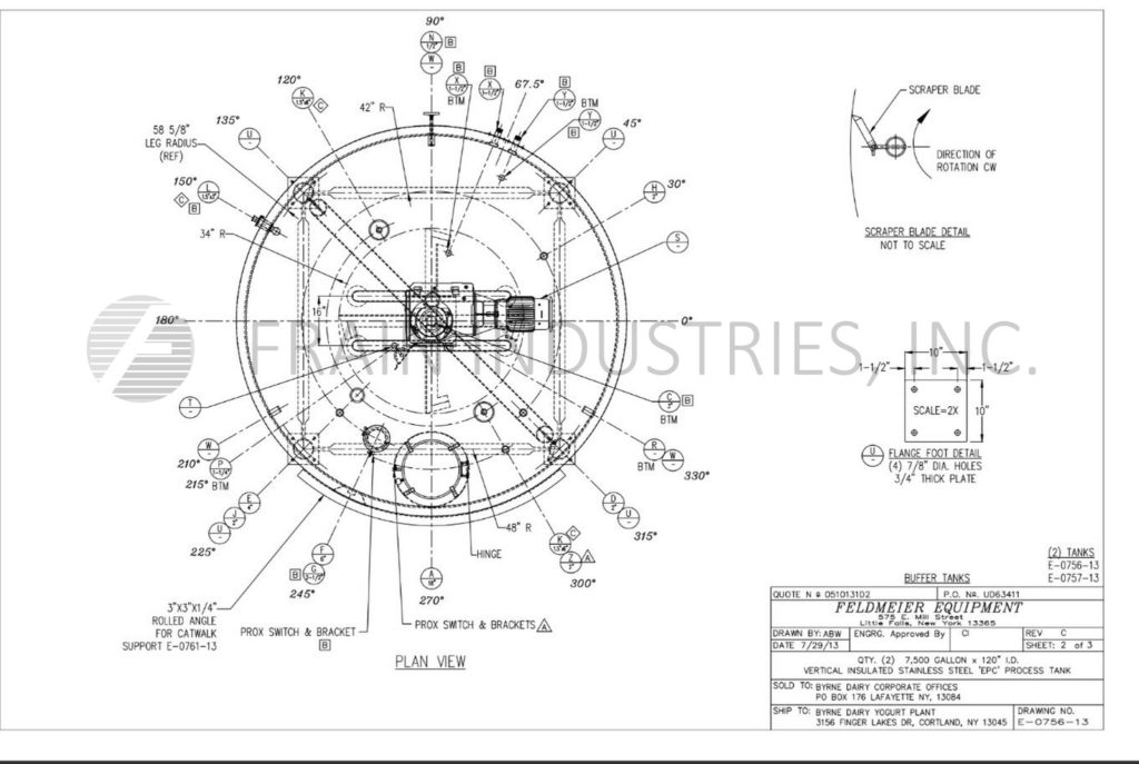 Back to All EquipmentFeldmeier, 7500 gallon capacity, stainless steel jacketed and insulated process tank. 304 stainless steel contact parts and 304 stainless steel jacket and exteroir parts. Vessel dimensions: 120" diameter with 144" straight wall. Equipped with dome top, 18" diameter bolt down man way, top mounted 10 Hp side and bottom scrape surface agitation, baffle, (2) CIP spray balls supplied by 2"OD / 1½"ID Tri-clamp fittings and thermowell. Dish bottom has 3½" OD / 3" ID center bottom pneumatic valve discharge with 30" ground clearence. Control panel with push button start / stop and variable speed control. Mounted on (4) legs with foot pads.
