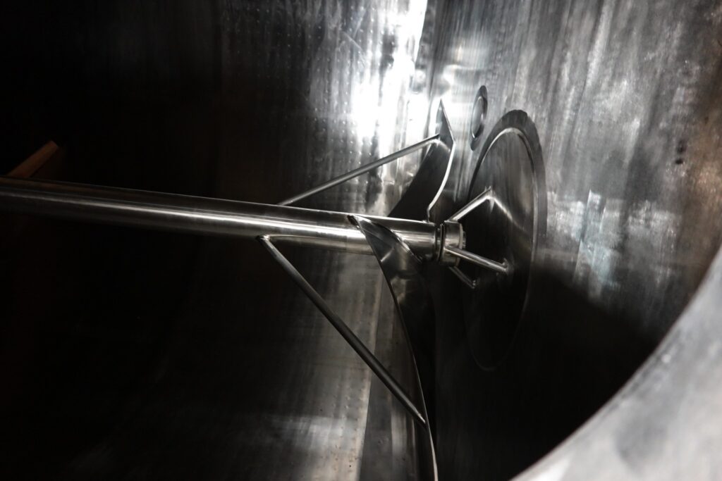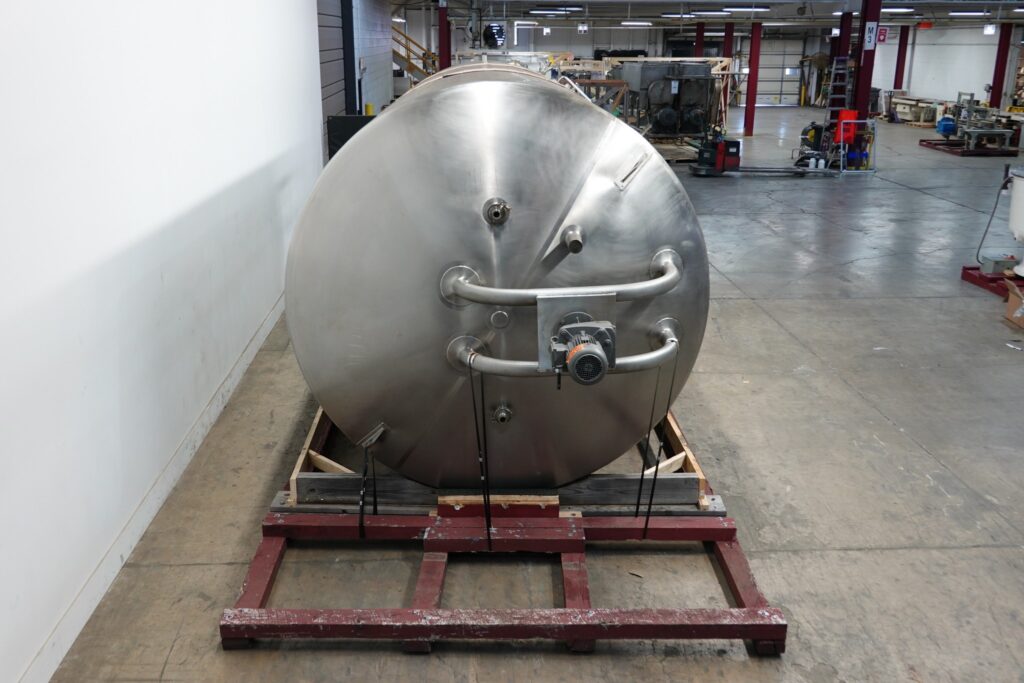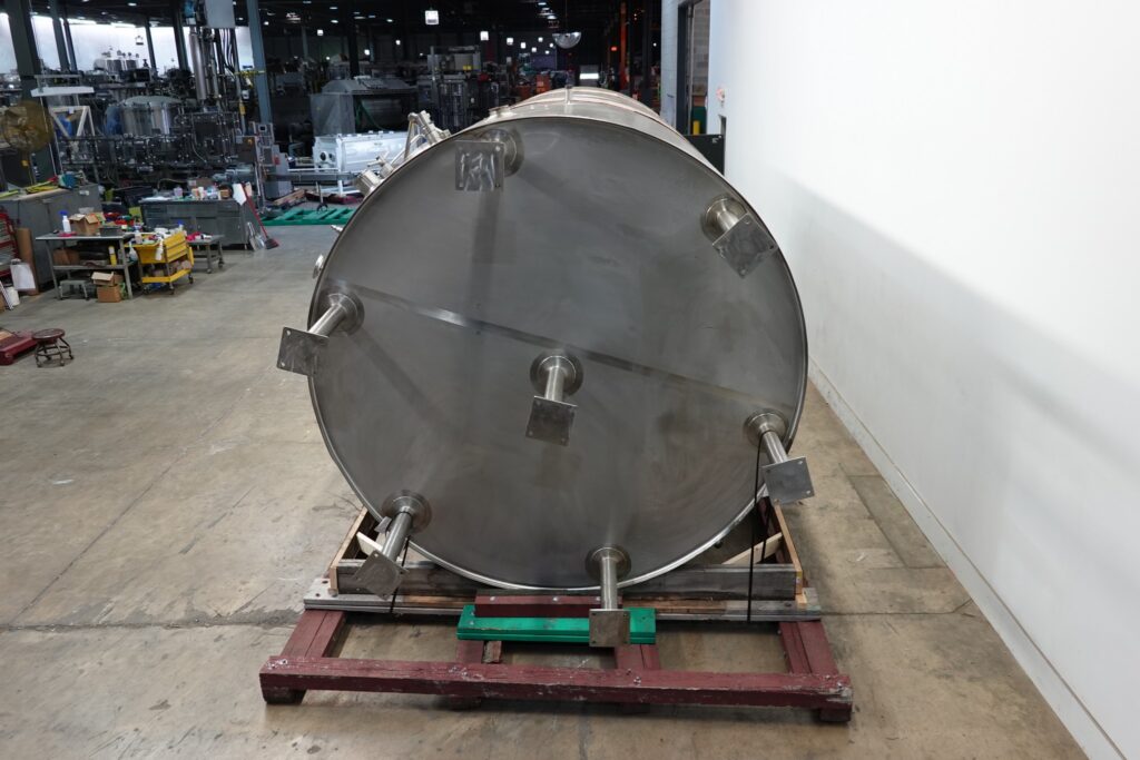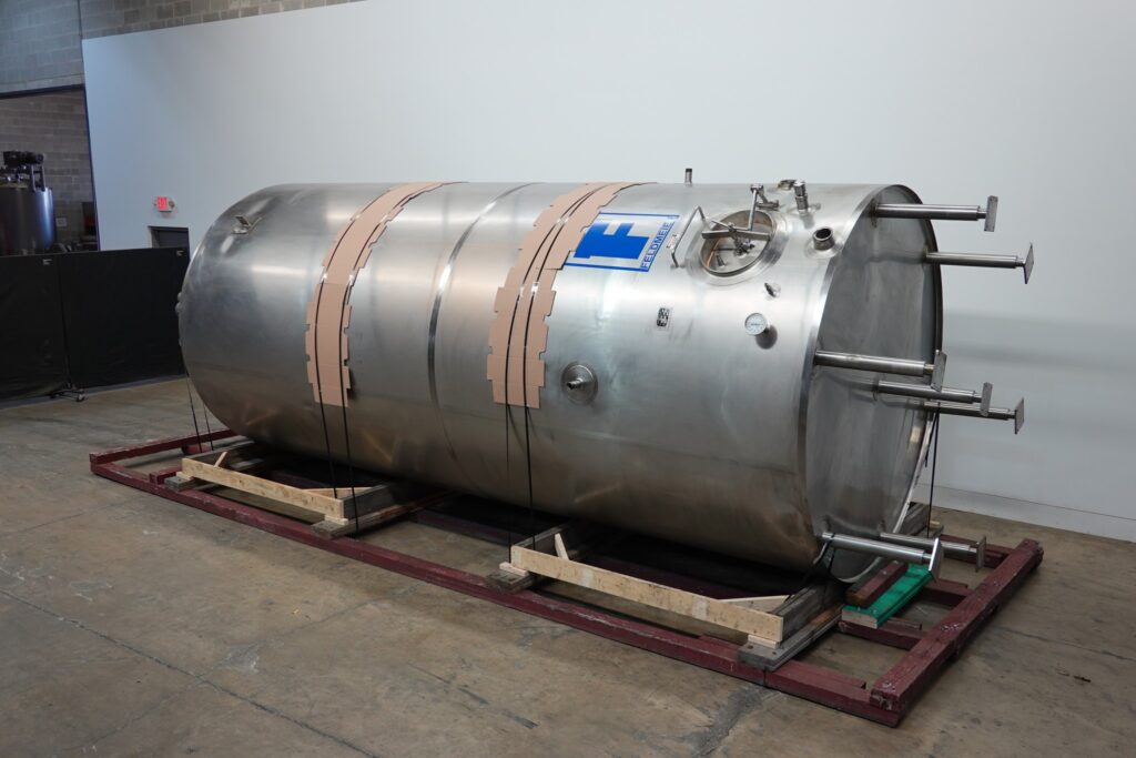 Back to All EquipmentFeldmeier, 6,000 gallon, stainless steel, ammonia jacketed mix tank. Product contact surfaces: 316L S/S. Vessel dimensions: 96" ID; 103" OD; 216" straight wall. Equipped with dome top, 5 Hp bridge mounted agitator 48" bottom sweep and mid mounted 32" (2) blade axial flow turbine thermowell, 20" diameter side bottom manway and sloped bottom with 4" OD / 3½" ID Tri-Clamp side discharge at 27" ground clearance. Mounted on (7) legs.