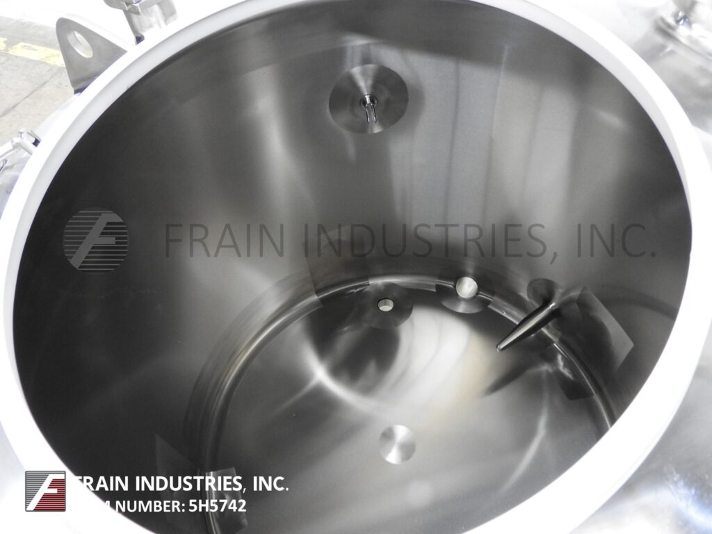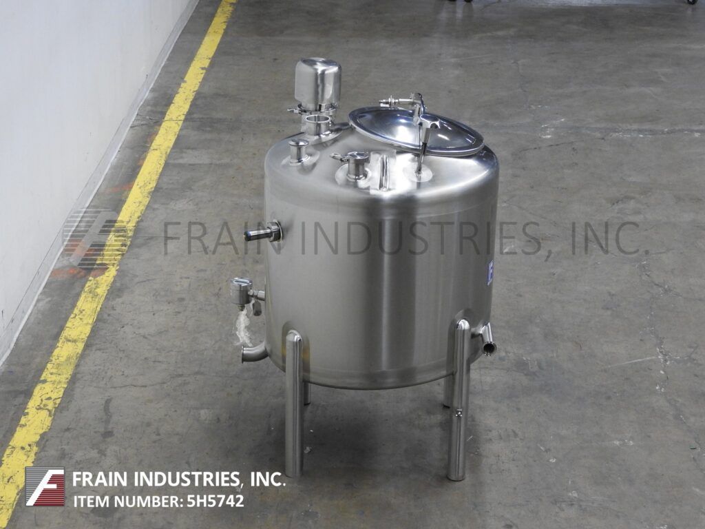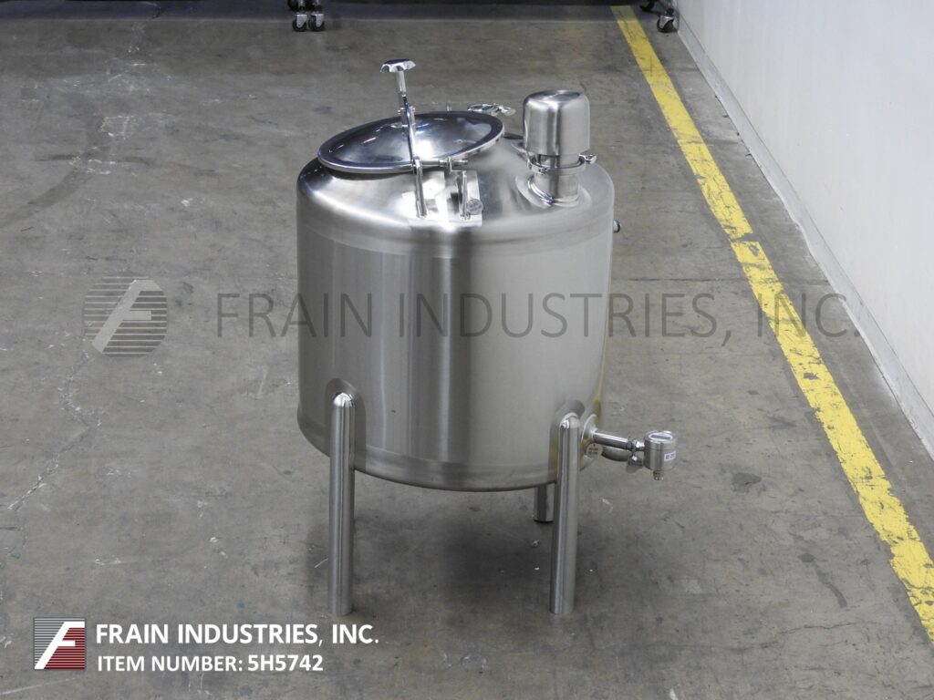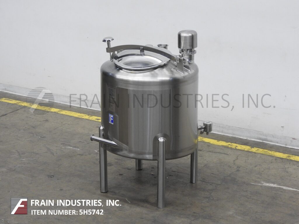 Back to All EquipmentFeldmeier, 75 gallon capacity, 316 stainless steel single wall tank. Vessel dimensions: 30" diameter x 28" deep with 24" straight wall. Equipped with dome top, 16" man way with flip up / clamp down cover, CIP spray ball supplied by a 2"OD / 1½"ID Tri-Clamp fitting, (1) level sensor port, (1) temp probe port and (1) flush mount sensor port. Slant bottom has 2½" OD / 2" ID Tri-Clamp style bottom discharge with 11" ground clearance. (Level Sensor, temperature probe and flush mount sensor not included)
