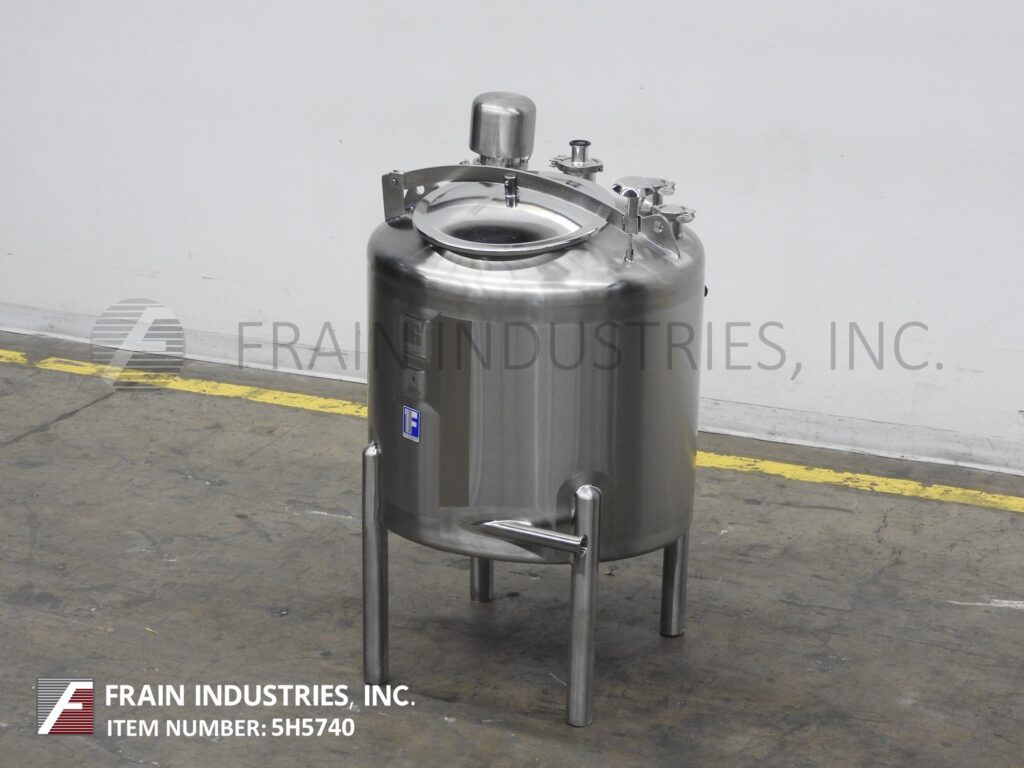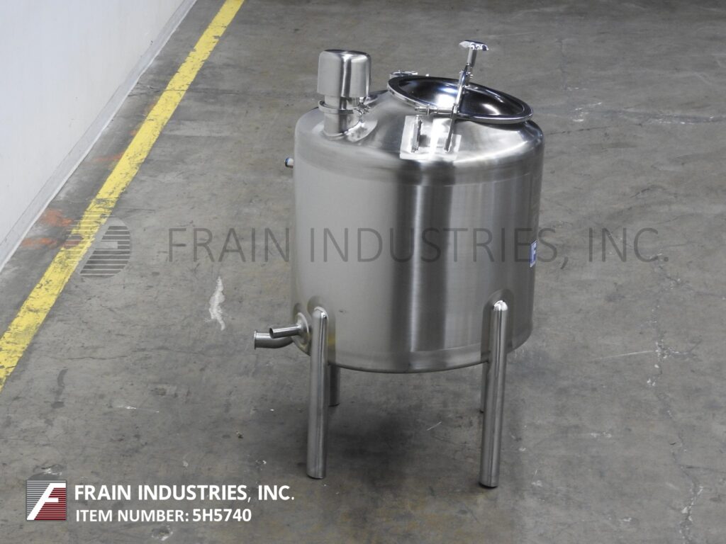 Feldmeier, 75 gallon capacity, 316 stainless steel single wall tank. Vessel dimensions: 30" diameter x 28" deep with 24" straight wall. Equipped with dome top, 16" man way with flip up / clamp down cover, CIP spray ball supplied by a 2"OD / 1½"ID Tri-Clamp fitting, (1) level sensor port, (1) temp probe port and (1) flush mount sensor port. Slant bottom has 2½" OD / 2" ID Tri-Clamp style bottom discharge with 11" ground clearance. (Level Sensor, temperature probe and flush mount sensor not included)