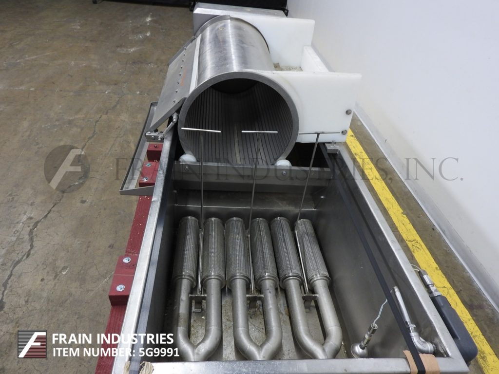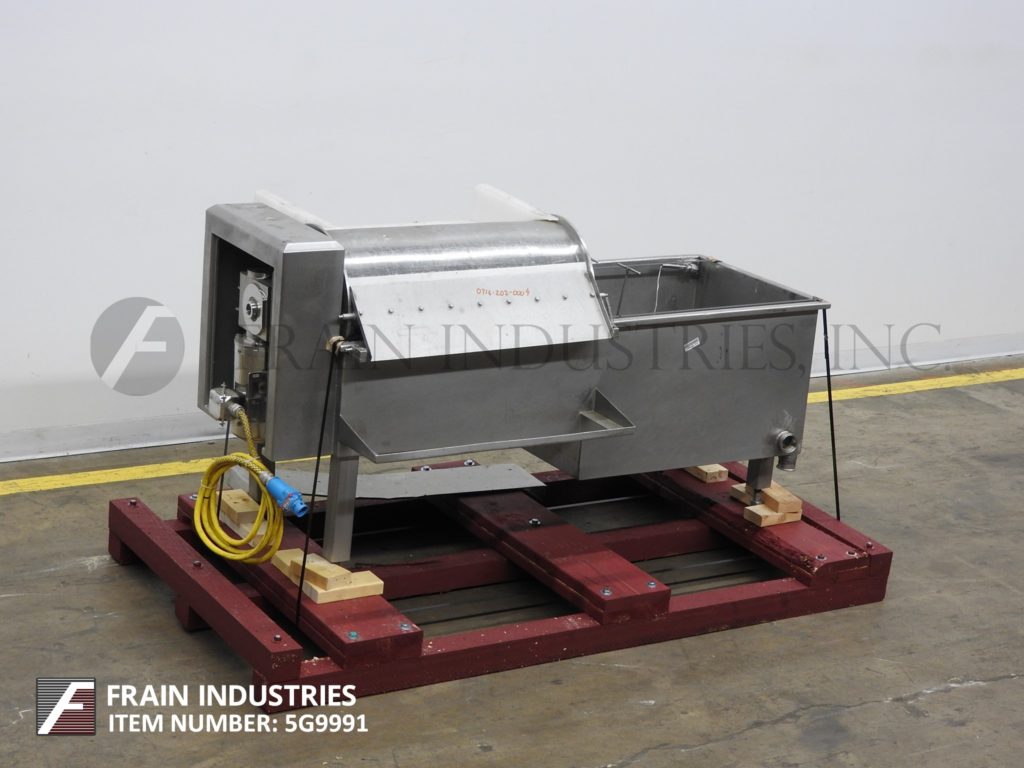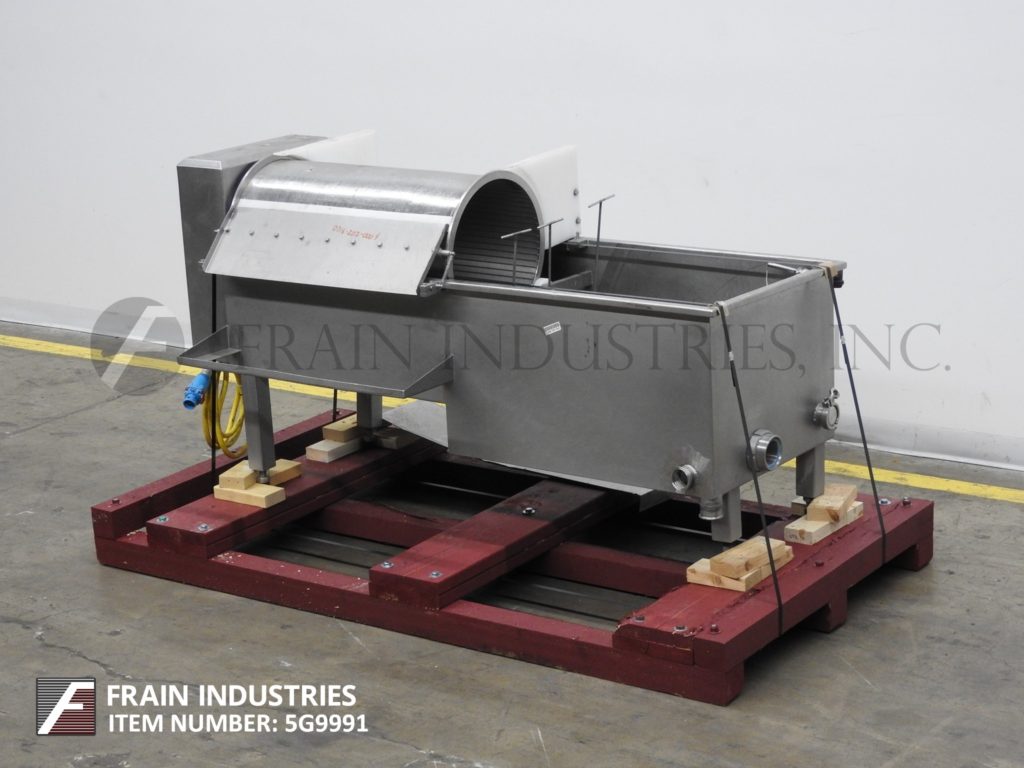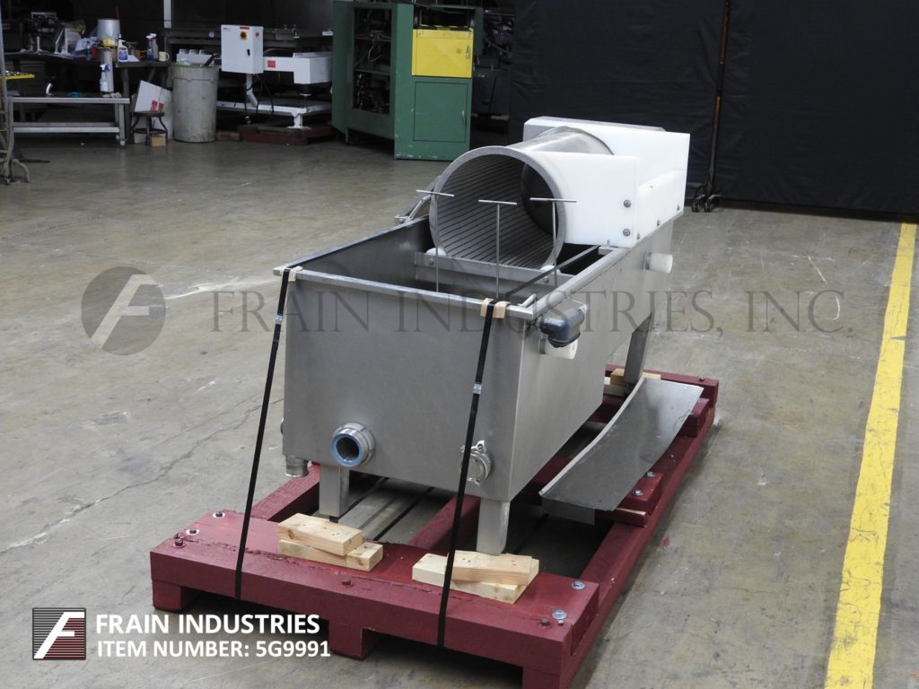 返回所有设备不锈钢,旋转过滤器与磅每小时产品-取决于材料和应用。配备15½“外径x 31”长屏幕,1.5 mm开口由2个马达Hp驱动。屏幕是外部馈送到28“长x 7”宽x 4“深槽沿圆筒的长度。固体被捕捉在筛网表面的外面,并被31“宽弹簧拉伸刮刀除去。液体流过桶,进入24”宽x 66”长x 19”深仓,(6)盒过滤器连接到3½”OD / 2½”ID螺纹端口。油藏还配备了(3)2½”外径/内径三钳式访问端口。