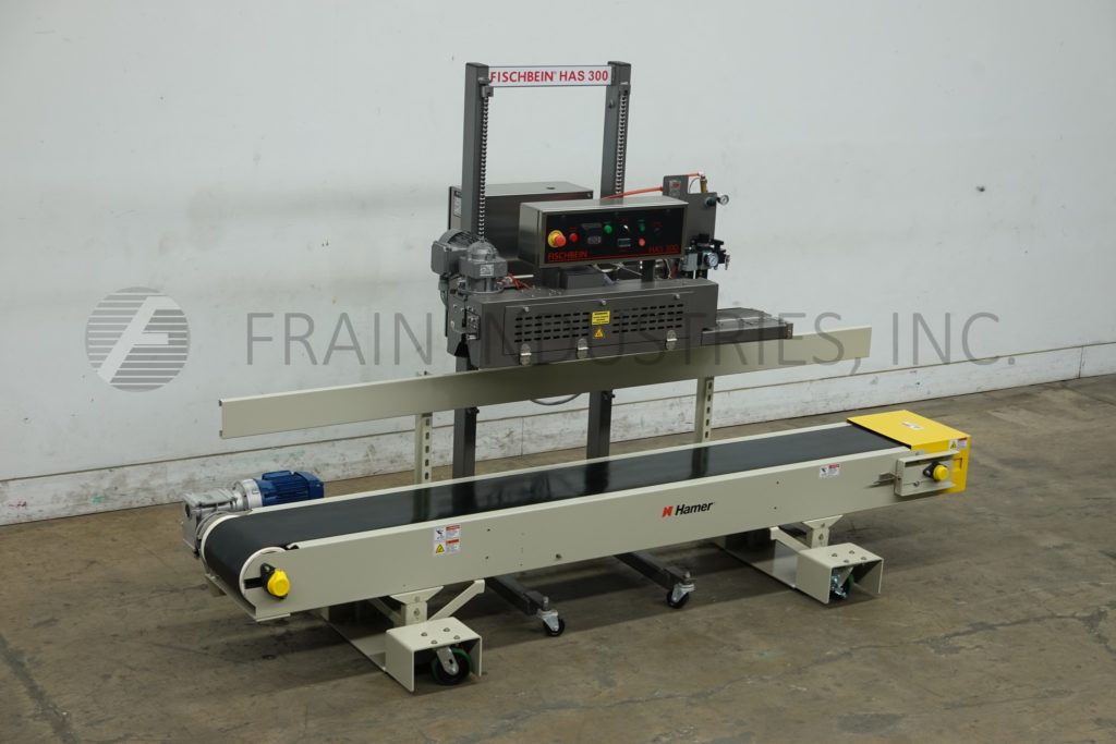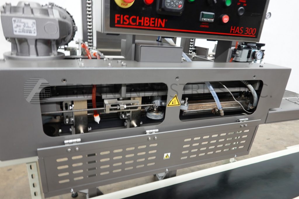 Back to All EquipmentFischbein, Model HAS 300, right to left, hot air bag sealer rated from 30 to 60 linear feet per minute with number of bags – depending on materials, application and operator dexterity. Capable of running most heat sealable pillow and gusseted bags with maximum bag thickness of 10 mils and free bag top of 6" minimum. Equipped with 48" long dual compression belt sealing section. Control panel has push button start / stop. Digital touch pad controls for heat, roller tension and air pressure. Up / down switch and VFD speed control. Mounted on powered height adjustable powder coated steel frame with casters.