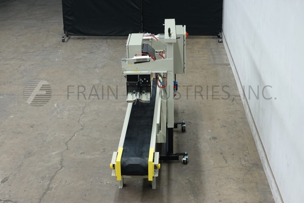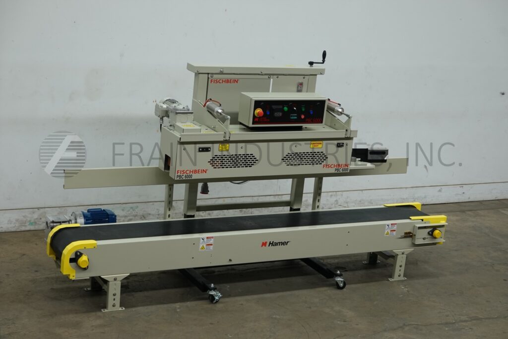 Back to All EquipmentFischbein Model PBC 6000, right to left, pre-applied glue, bag heat sealer rated from 0 to 85 linear feet per minute with number of bags – depending on materials, application and operator dexterity. Bag size range: 4" to 26" in Width up to 56" Length. Filled bag weight from 1 lbs to 110 lbs, will run most gusseted and flat bags. Equipped with front break away channel, bag guide with folding plow for single fold, electric heater to heat up and activate pre-applied glue, adjustable pressure 12" long dual compression belt section. Control panel has touch pad with heater on / off and motor run, auto, stop switches, bag jam detection, over temperature sensor shut down, with start, stop, e-stop push button controls. Mounted on hand crank height adjustable base frame with casters and 10′ long x 12" wide black PVC product belt conveyor.
