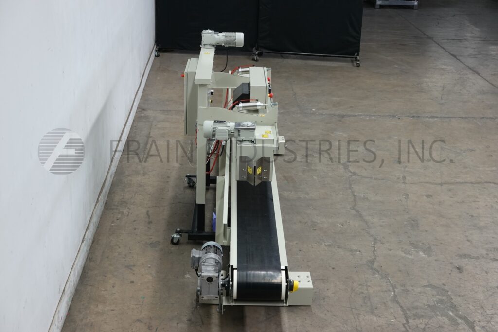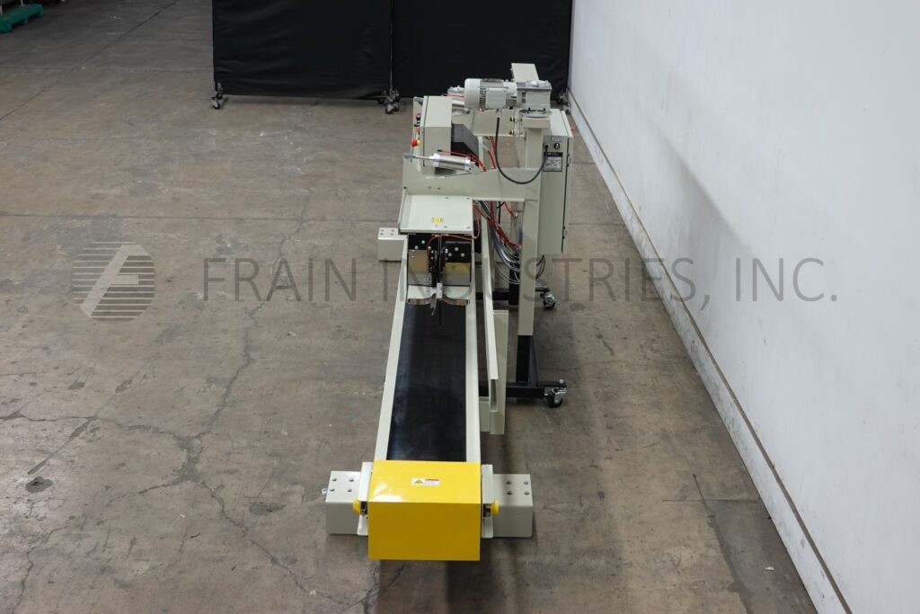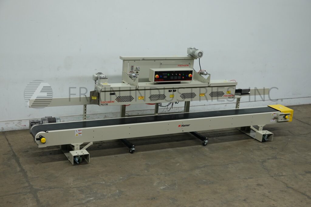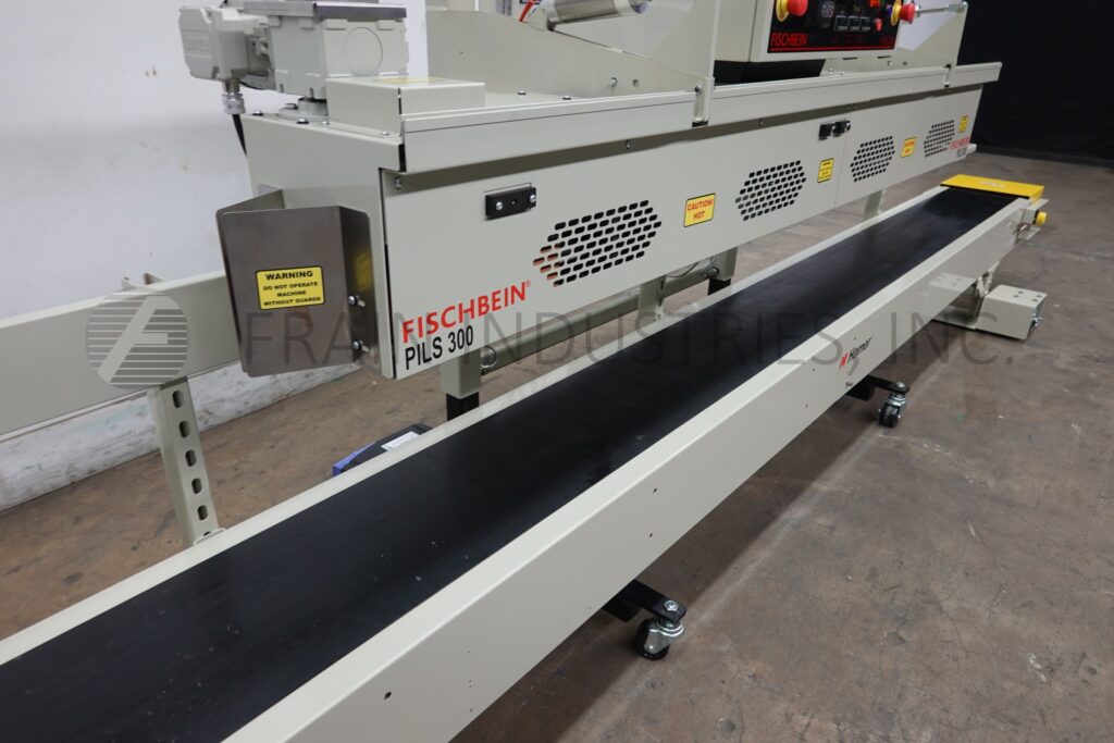 Back to All EquipmentFischbein Model PILS 300, Top pinch, inner liner hot air bag sealer rated up to 75 linear feet per minute with number of bags – depending on materials, application and operator dexterity. Multi-wall paper, pinch bag sealer that have a preapplied hot-melt adhesive strip and heat-sealable polyethylene or foil inner liners, can also be used to seal standard pinch-style bags that do not have inner liners. Equipped with 192" long x 12" wide powered bag belt conveyor, pre-heating station for pre-applied glue with single fold over station, final bag heat sealing and cooling section and hand crank height adjustable. Control panel control panel has digital temperature display, key pad for variable speed control, and dual emergency stop buttons.and machine start / stop button. Breakaway design eliminates costly downtime caused by bag jams while allowing easy cleaning and service of the hot air manifold and bag folder. Mounted on height adjustable frame with casters to roll over existing conveyor.
