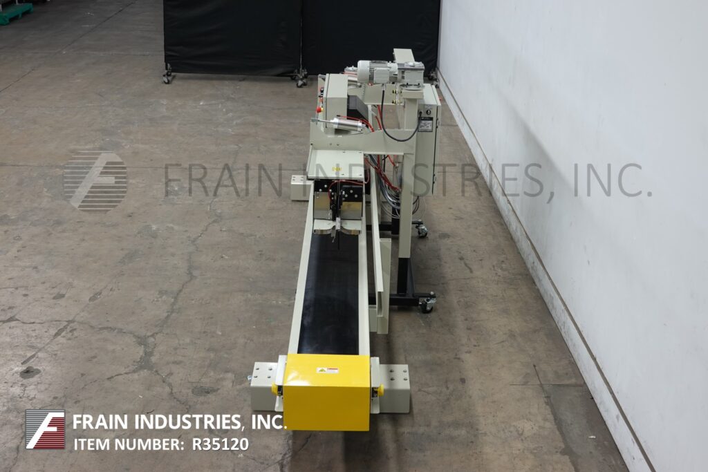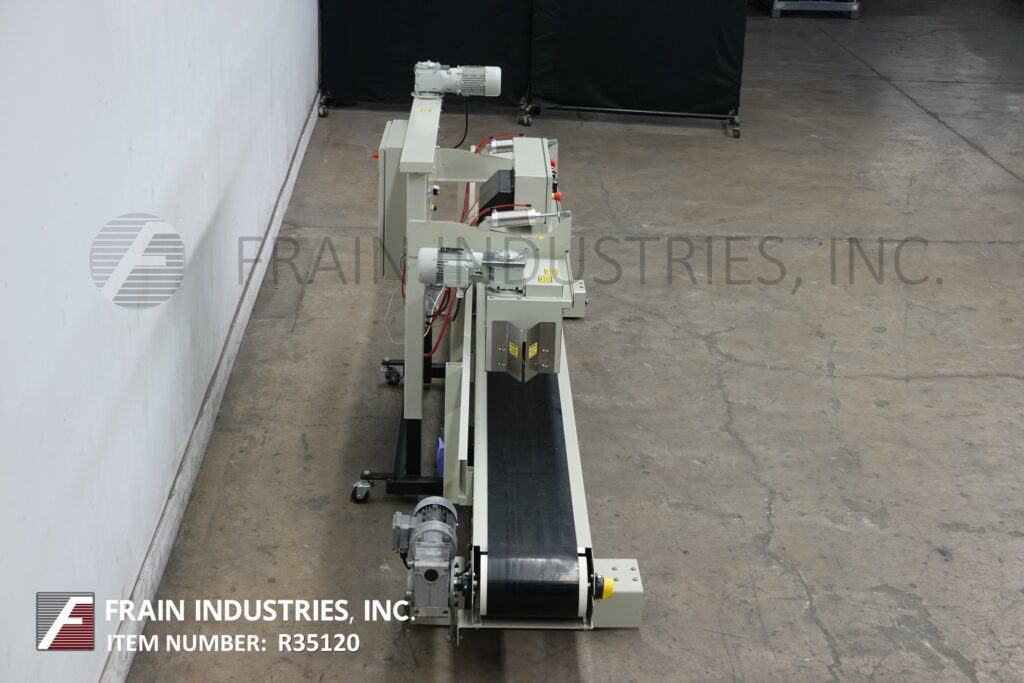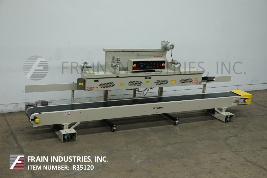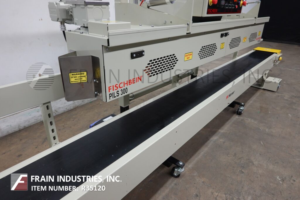 Fischbein Model PILS 300, Top pinch, inner liner hot air bag sealer rated up to 75 linear feet per minute with number of bags – depending on materials, application and operator dexterity. Multi-wall paper, pinch bag sealer that have a preapplied hot-melt adhesive strip and heat-sealable polyethylene or foil inner liners, can also be used to seal standard pinch-style bags that do not have inner liners. Equipped with 192" long x 12" wide powered bag belt conveyor, pre-heating station for pre-applied glue with single fold over station, final bag heat sealing and cooling section and hand crank height adjustable. Control panel control panel has digital temperature display, key pad for variable speed control, and dual emergency stop buttons.and machine start / stop button. Breakaway design eliminates costly downtime caused by bag jams while allowing easy cleaning and service of the hot air manifold and bag folder. Mounted on height adjustable frame with casters to roll over existing conveyor.