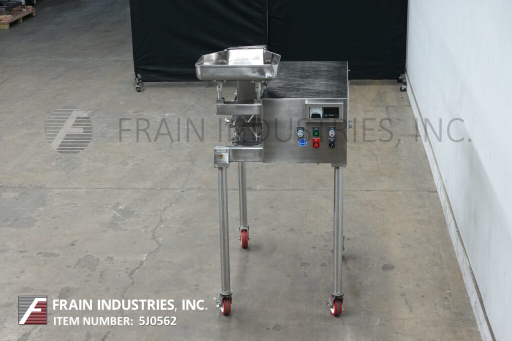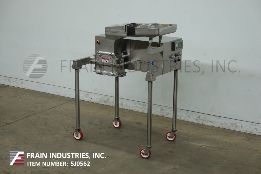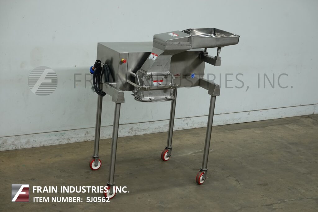 回所有设备Fitzmill、模型D6A、316不稀疏钢商厂每小时产值 — — 视材料、应用和运算符伸缩性而定。配有20宽x36长x5深通素板7宽x8高通素喉咙14长x6宽刀室和16固定刀片/撞击刀片由71.52Hp驱动12'长x6'宽产品卸载挂起(4)条轻钢框