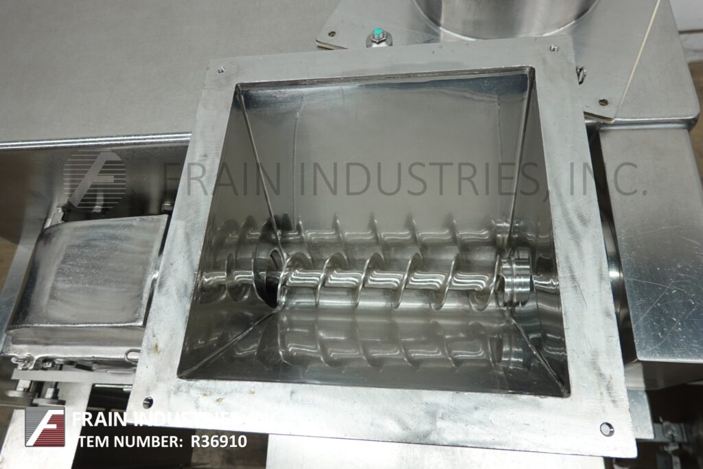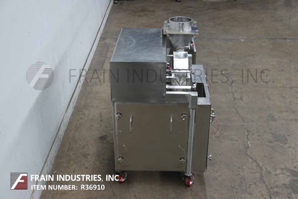Back to All EquipmentFitzmill, Model D6A, Compact, enclosed GMP sanitary design, 316 stainless steel construction, pharmacutical hammer mill, pounds of product per hour – depending on materials and application. Equipped with 15" long x 15" wide x 9½" deep stainless steel product feed hopper with 10¼" diameter charge port, safety grid, stainless steel vari speed metering 3" diameter feed auger, enclosed process chamber with (16) fixed stainless steel knife / impact blades and 13” long x 5” wide product discharge with 36” floor clearance. Remote control panel has speed adjust dials and start, stop buttons for mill and feed screw with feed screw rpm and machine amp readouts with e-stops. Mounted on frames with locking casters.
