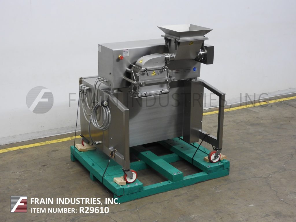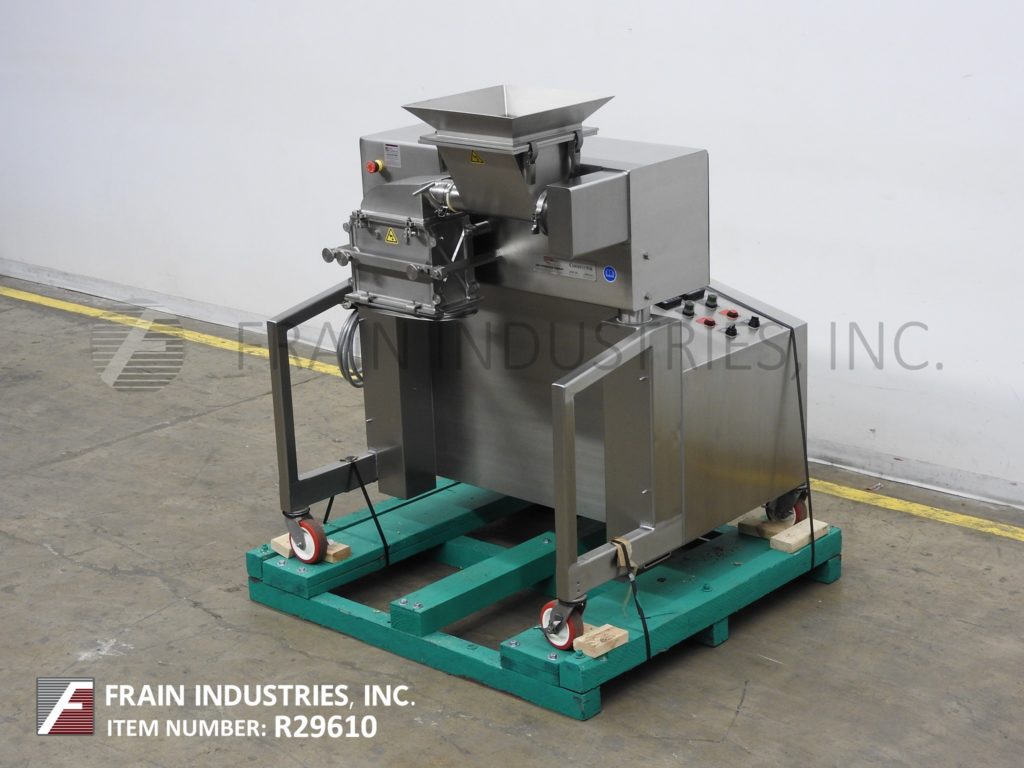 返回所有设备Fitzmill,D6A型号,紧凑,封闭的GMP卫生设计,316不锈钢结构,具有每小时生产速率的药物锤磨坊,具体取决于材料和应用。配备12英寸长的x 12英寸宽x 10“深不锈钢产品饲料料斗,带安全栅格和16”长x 3“ OD不锈钢变量速度测光馈螺钉,与(16)(16)固定的不锈钢刀 /Blount Blades。和13英寸长的x 6英寸宽的产品排放端口,带有36英寸地板间隙。控制面板具有速度调整表盘并启动,磨机的按钮和带有馈螺钉rpm的进纸螺钉和带有E台的机器AMP读数。在带有锁定脚轮的基础框架上。用于精确磨削和受控的药物处理和其他卫生行业的粒度减少。