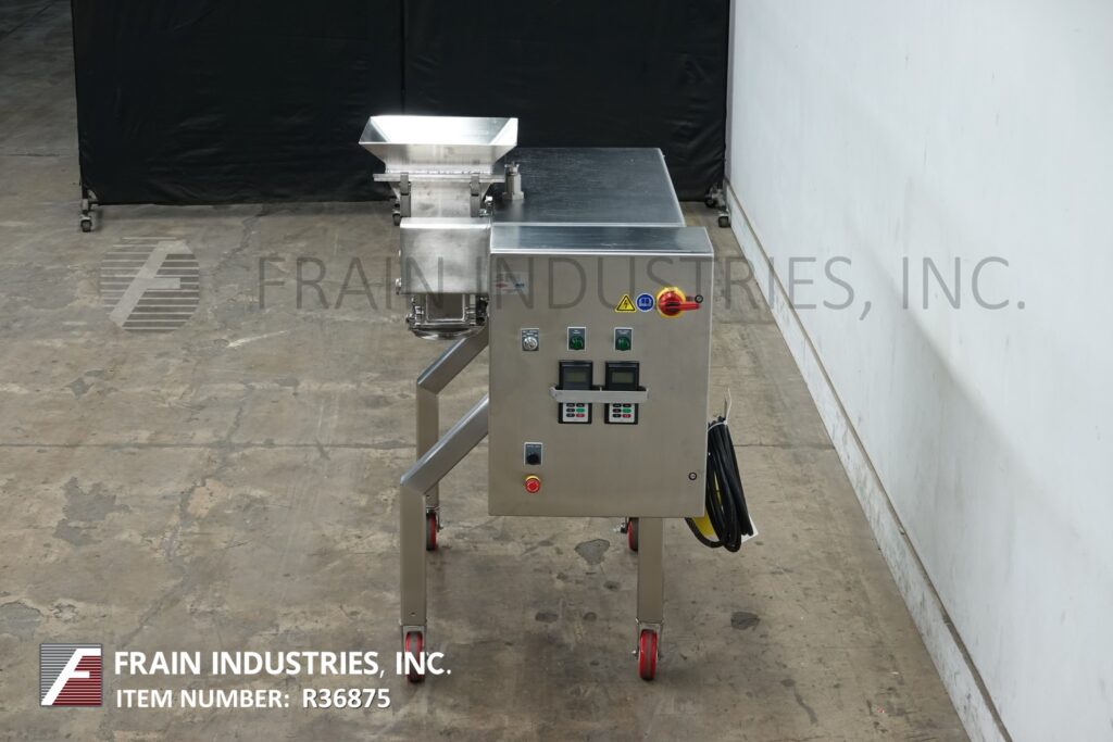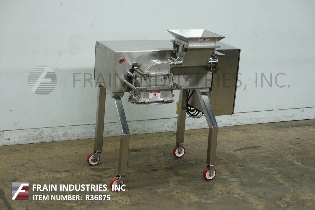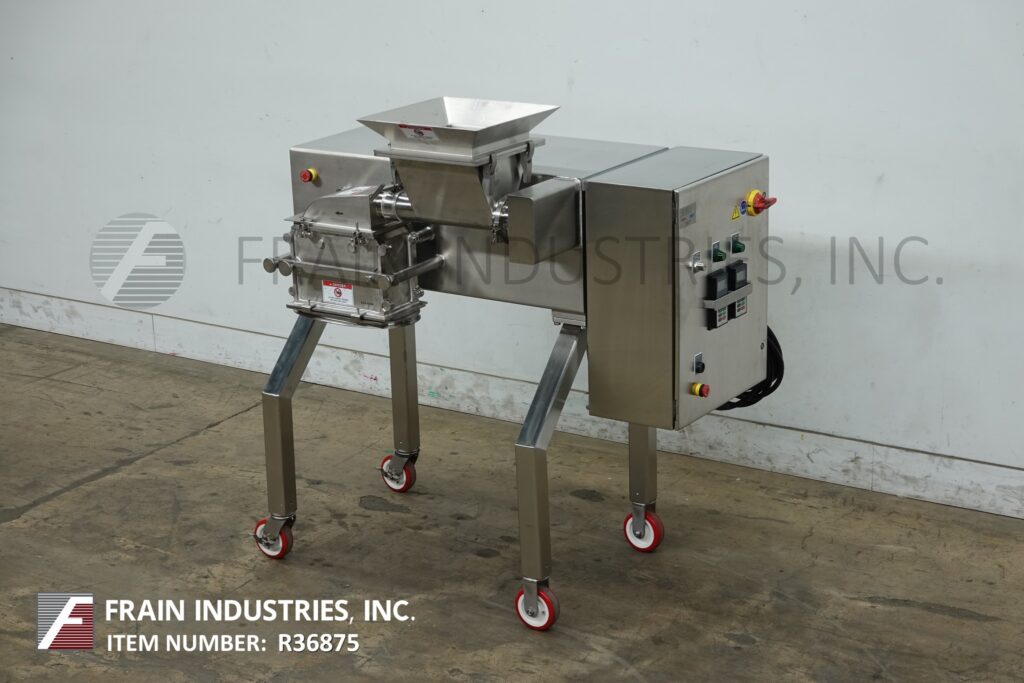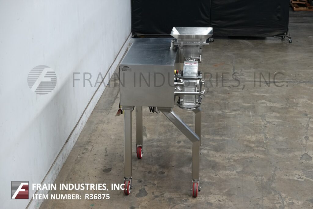 Back to All EquipmentFitzmill, Model D6A, compact, 316 stainless steel construction, hammer mill with production rates per hour – depending on materials and application. Equipped with 12" long x 12" wide x 8" deep stainless steel product feed hopper 3" OD stainless steel vari speed metering feed screw to enclosed process chamber with (16) fixed stainless steel knife / impact blades and 14" long x 10" wide product discharge port with 33" ground clearance. Mounted on stainless steel frame.