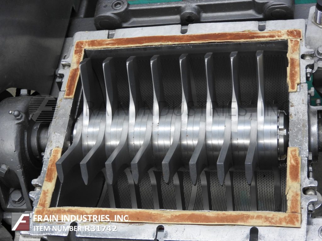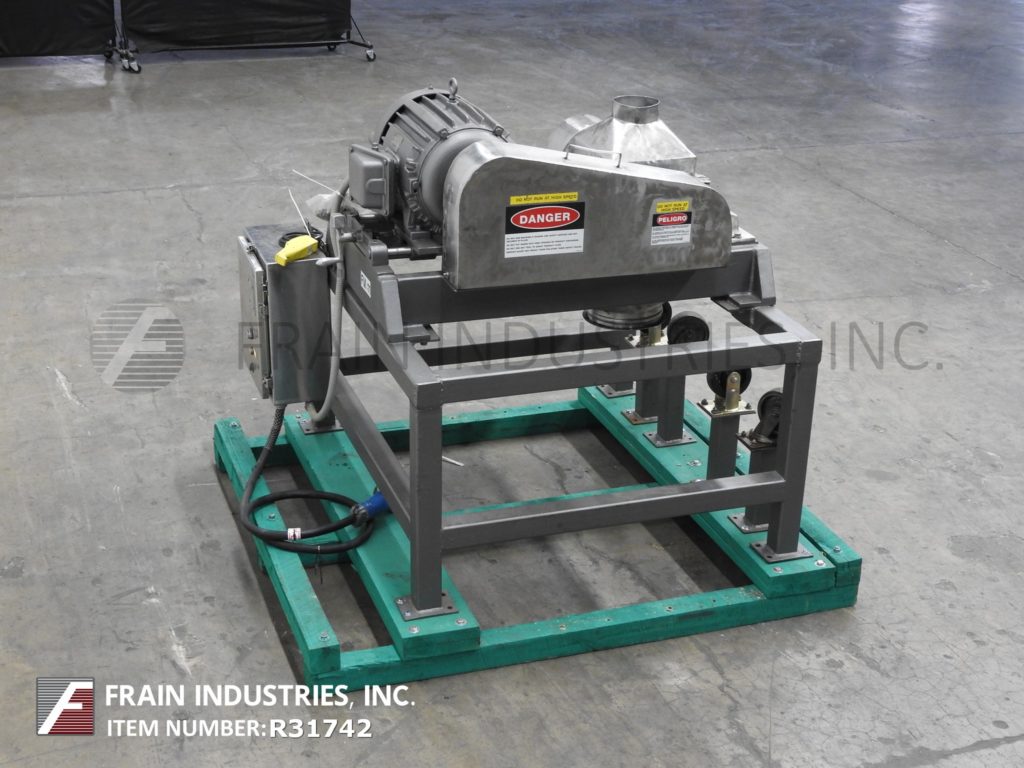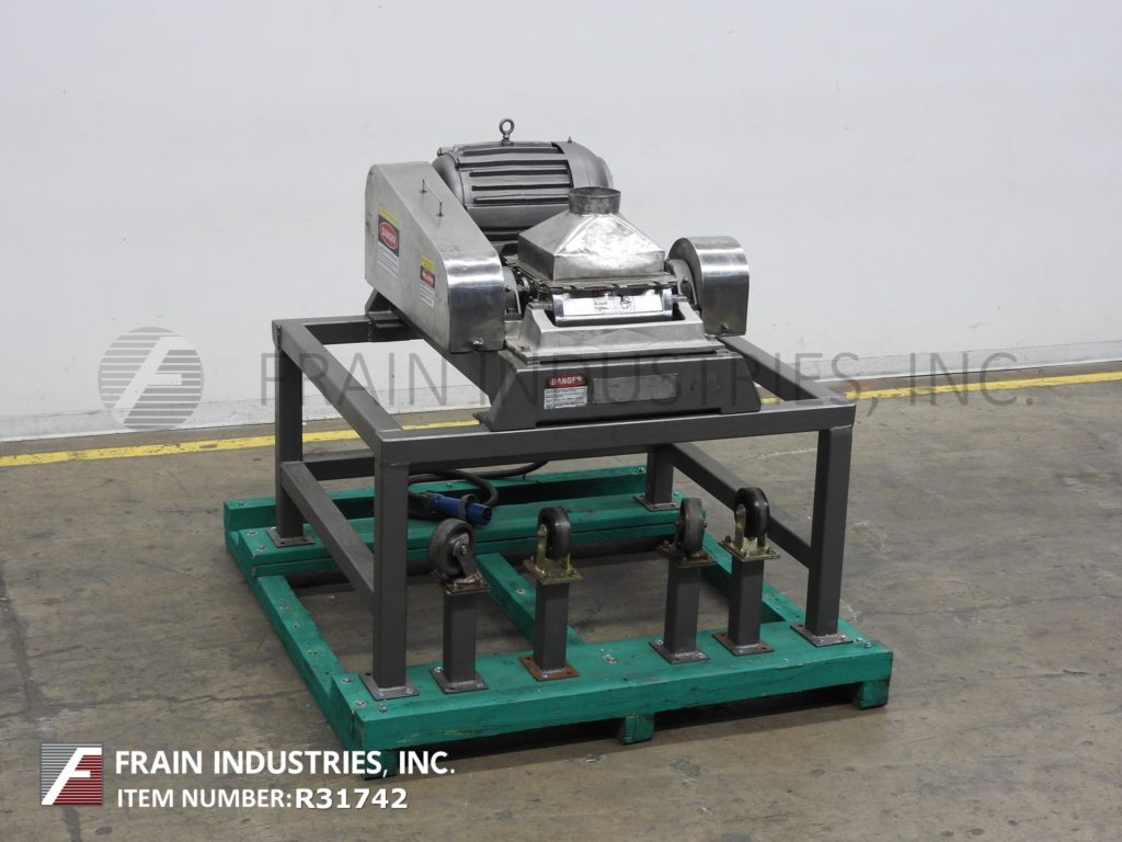 返回所有设备菲茨米尔,型号DKAS012,不锈钢锤式磨机每小时产品的磅数-取决于材料,应用和机器配置。配备5-3/4"外径产品端口和12" x 12"进刀喉(32)固定刀/冲击刀片由20马力电机驱动,底部10"内径产品出口24 "地板间隙。控制面板有启动,停止按钮和手持控制器。安装在(4)带脚轮的不锈钢腿上。用于研磨,除块,粉碎和处理湿或干产品。