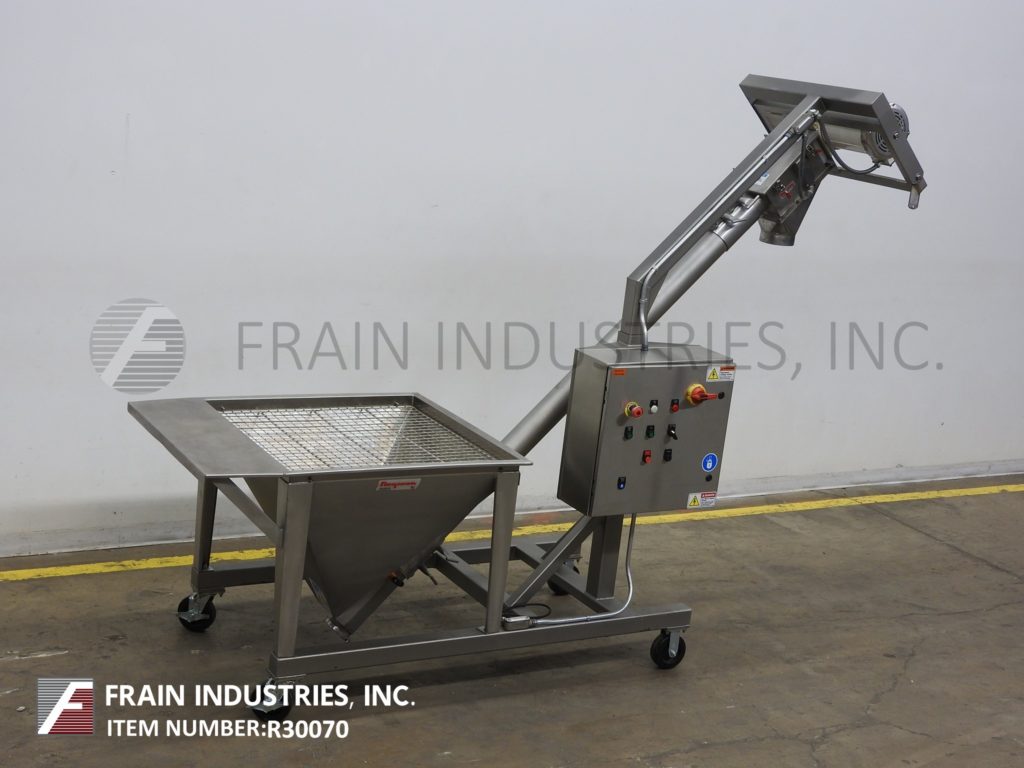返回所有设备Flexicon, 4英寸直径的螺旋输送机额定从10到60立方英尺的产品每小时-取决于材料,应用和机器配置。配备36 " x 36 " x 28 "深产品料斗,4"直径× 108"长不锈钢螺丝4½"直径刚性不锈钢管和6 "直径产品出口69"放电高度。动力由两速3 / 2马力顶部驱动电机。控制盒具有前进/后退,停止和复位按钮。安装在四脚框架与锁定脚轮。