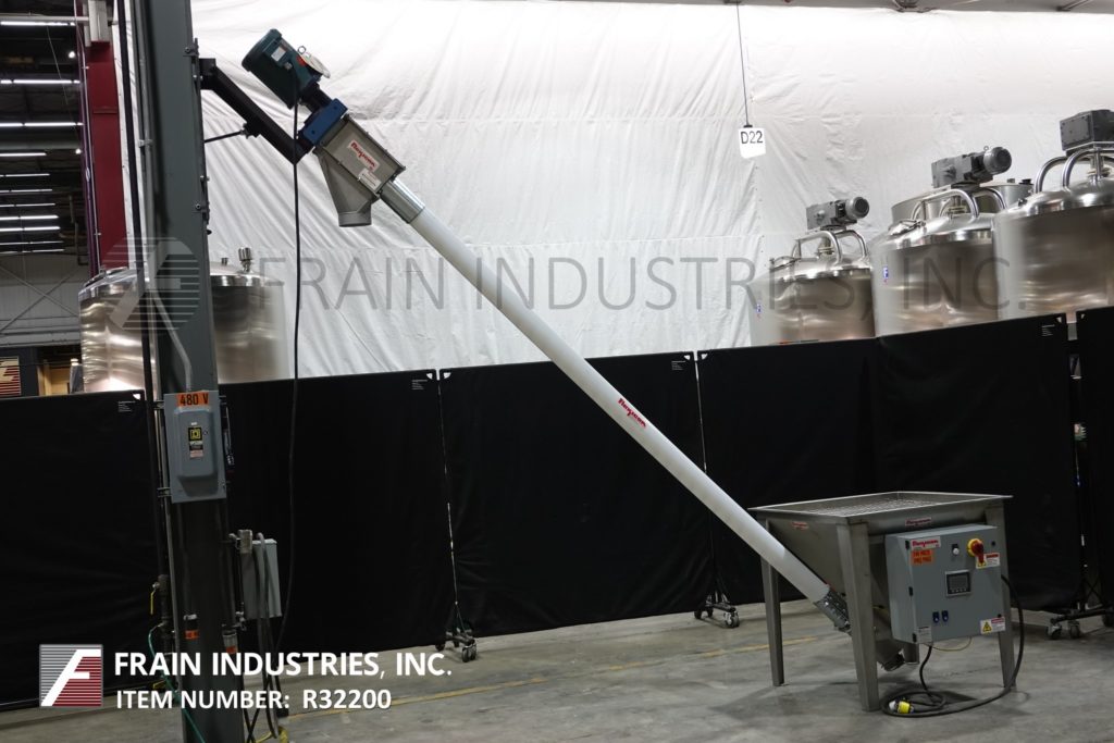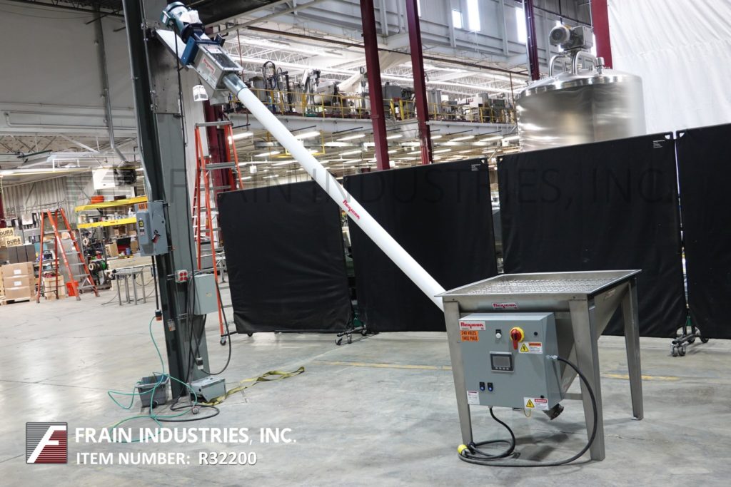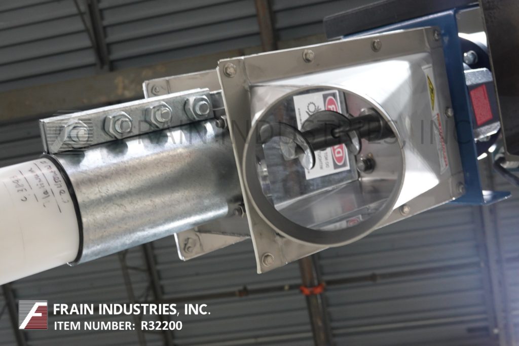 Back to All EquipmentFlexicon, Model 1450, 4" diameter x 120" long screw conveyor. Capable of transferring up to 140 ft³ of product per hour – depending on materials, application, and product density. Equipped with a 36” long x 36” wide x 27” deep product hopper with grated cover and ½ Hp agitator, 3" diameter x 151" long stainless steel product conveying screw, 4" diameter x 120" long flexable poly tube, top 3 Hp motor drive with 6” inside diameter product discharge port.