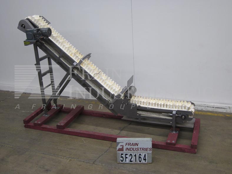 Back to All Equipment6" wide x 96" long, incline neoprene cleated belt conveyor. Equipped with 5" wide x 3" high cleats on 6" centers, 36" long infeed/load area, 6" diameter x 11" wide high product product flatener, and a 72" high discharge. Mounted on a stainless steel frame with height adjustable legs.