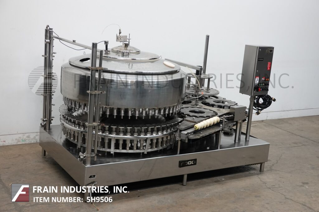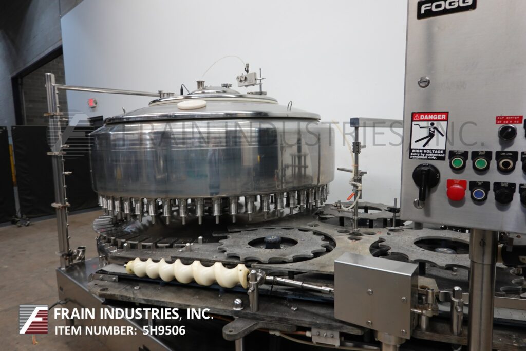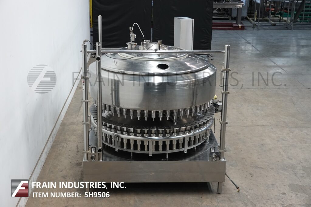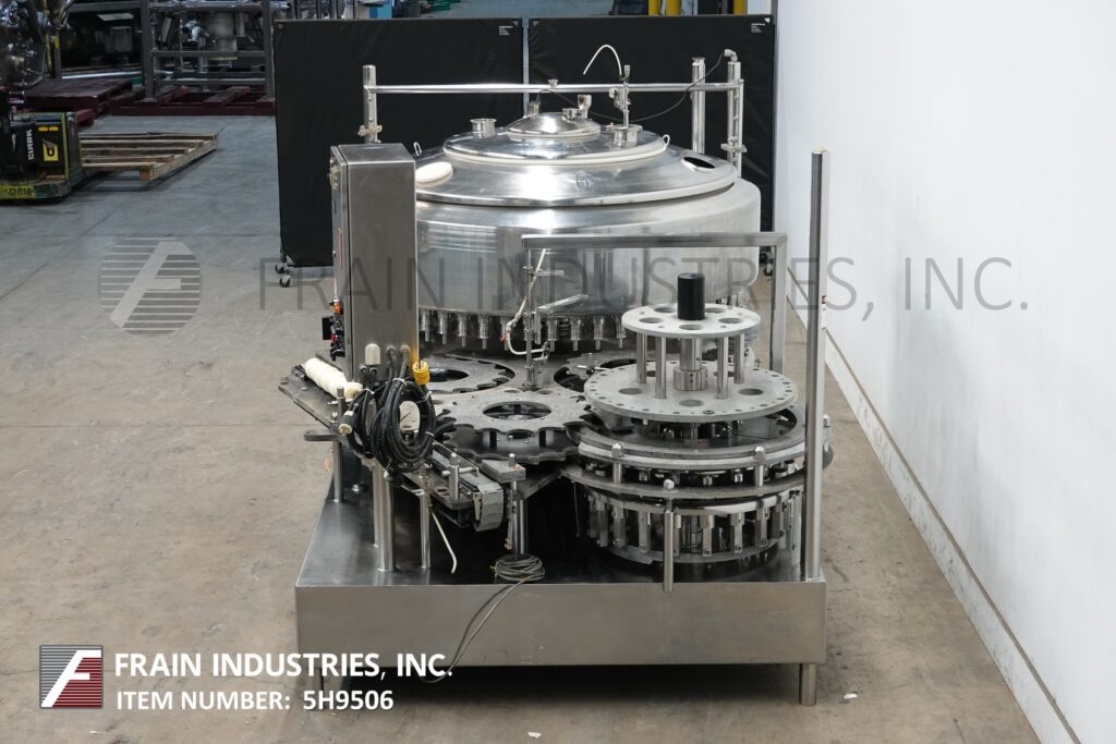 Back to All EquipmentFederal, Model 3615, Automatic, 316 stainless steel, 56 head rotary, pressure gravity filler rated from 56 to 200 containers per minute – depending on materials and application. Equipped with 72" long x 3-1/2" container conveyor has worm screw to star wheel container in feed and discharge, 64" turrett with (56) J3 double diapragm 3/4" OD fill to level nozzles, set on 4" centers with 3" x 5" container platforms and 60" OD x 16" Deep product holding tank with CIP ring. Capper capable (no cap heads) Control panel has A/B PLC with filler start, jog, speed, bowl, capper, no cap and bottle back-up with, start and e-stop push buttons. Mounted on heavy duty stainless steel frame. Capable of running bottled water, juice, tea and both cold or hot fills.