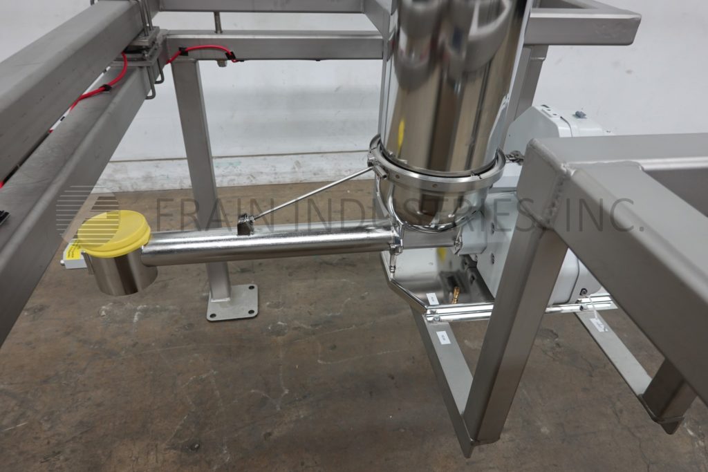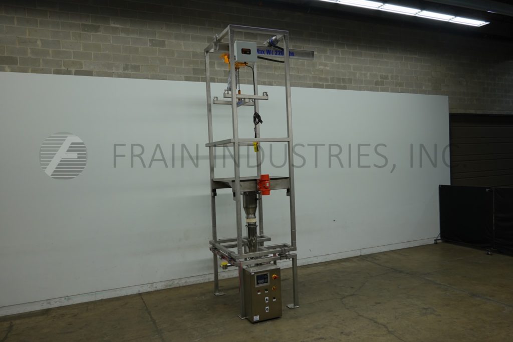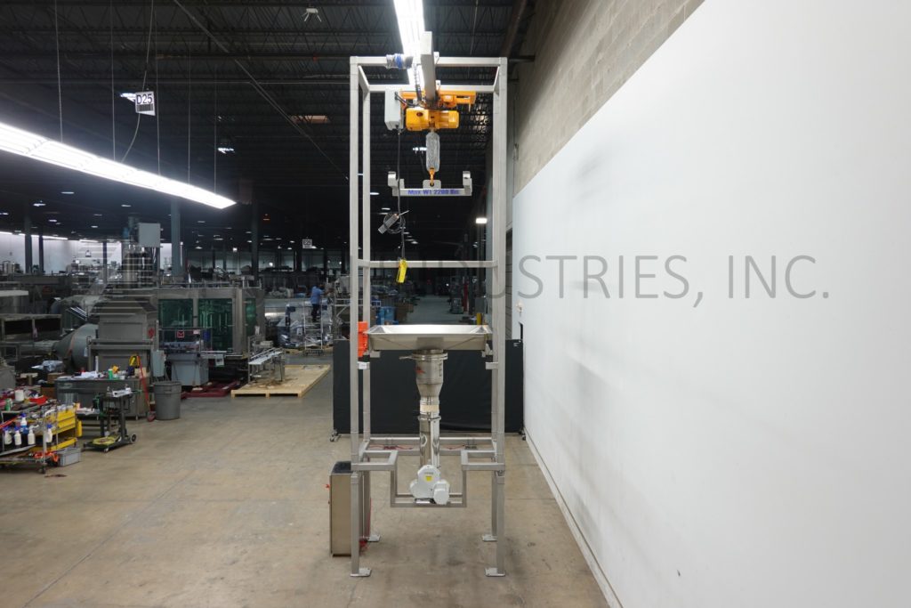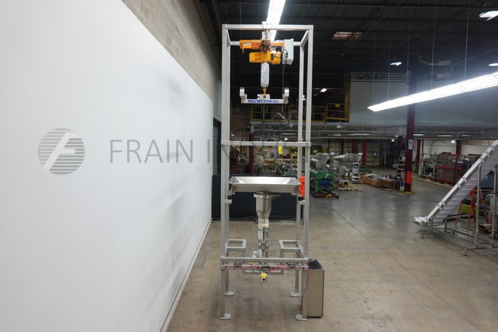 Back to All EquipmentFormpak Inc, Model 500HT, Bulk bag, unloading system rated up to 2,200 lb capacity with number of bags per hour – depending on materials, application and operator dexterity. Equipped with 92" long I-Beam and Harrington 35" long x 36" wide spider lift bag attachment that allows lifting of various size bulk bags up to 2,200 lb capacity, with hoist and trolley powered by 1.2 Hp motor drive and has flanged mounted product receiving chamber with Coperion K-Tron vibratory agitation and auger feeder with Iris discharge valve for product flow control by volume. Control panel has start and pause / reset scale, auto off and on switches, reset and e-stop push buttons with hand held controller. Discharges into Rice Lake weigh auger feeder. Mounted on heavy-duty box tube structural design frame.