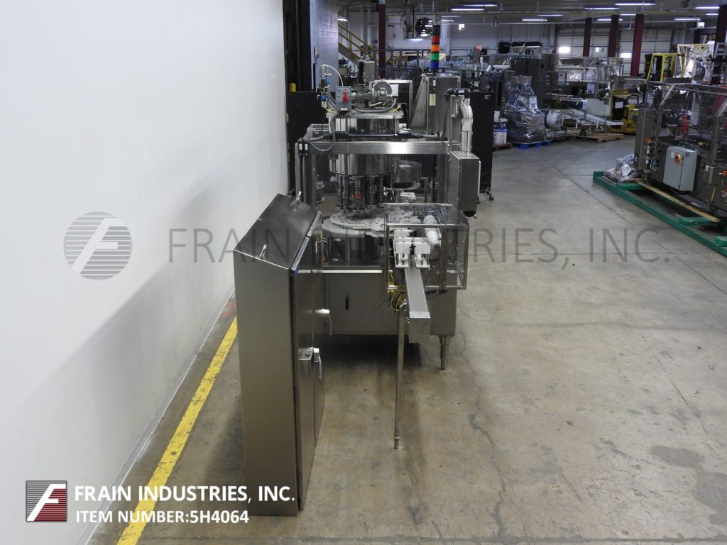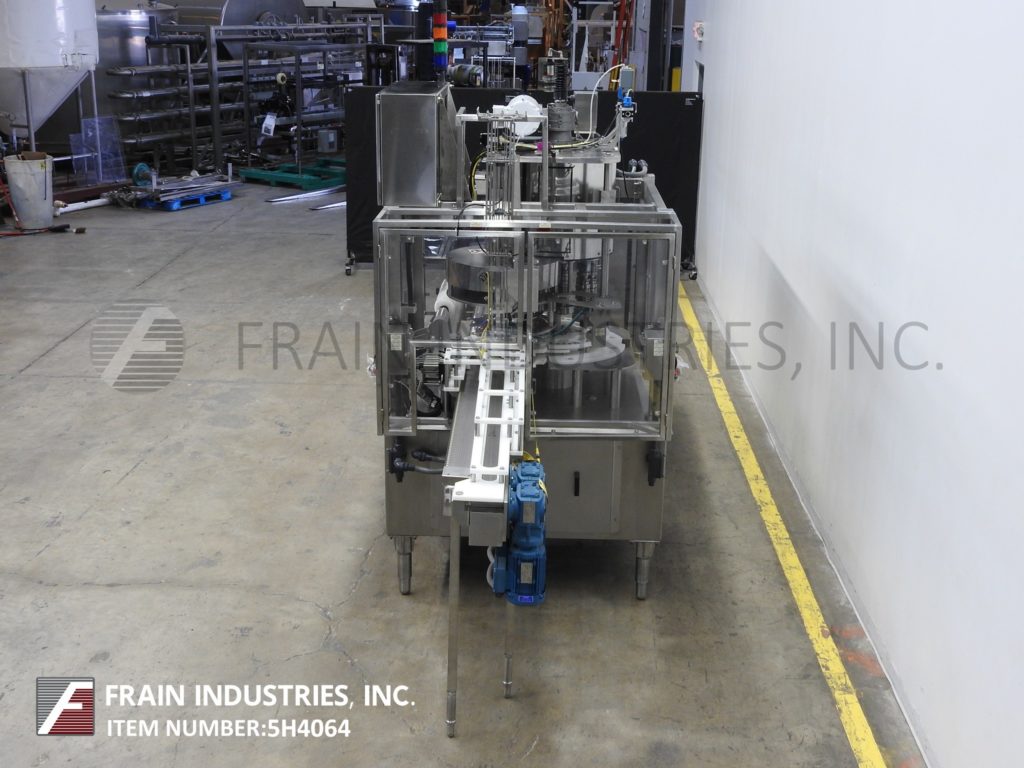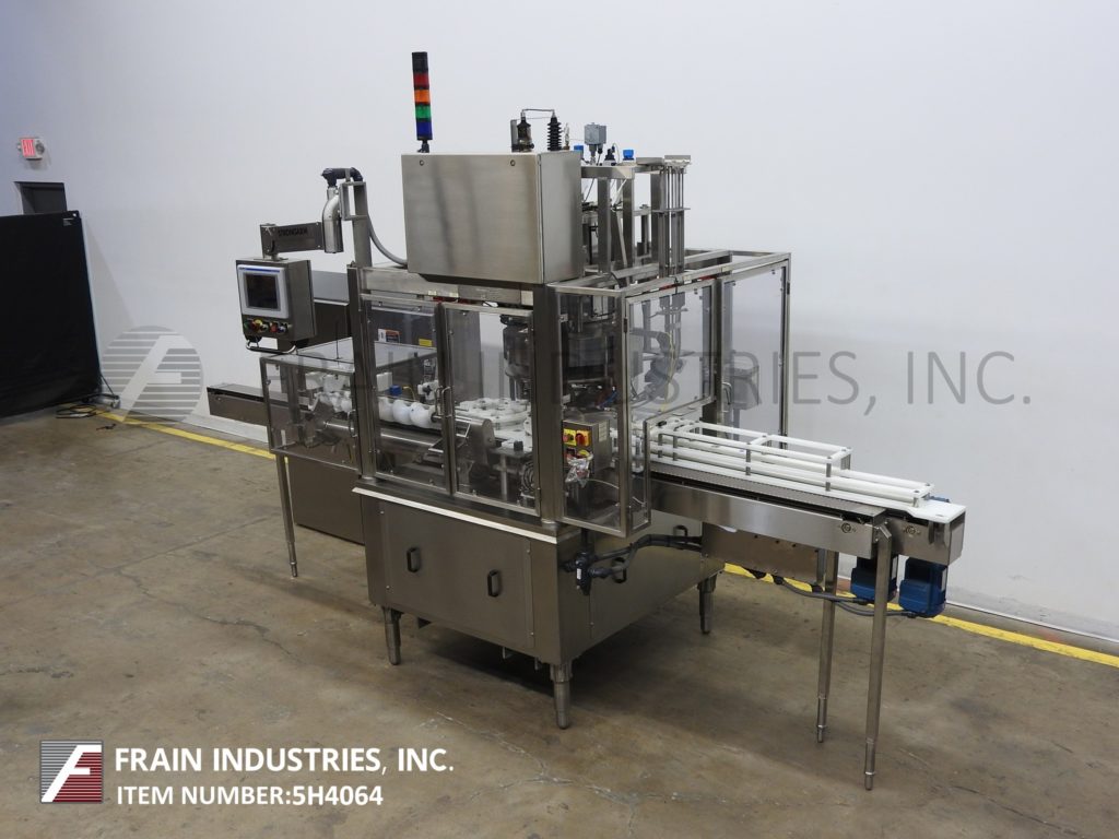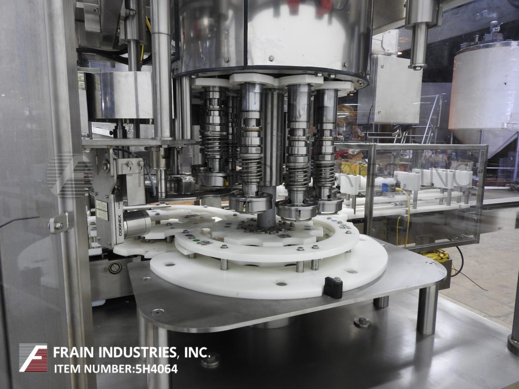 Back to All EquipmentFowler Model CAPDF-9/360, automatic, left to right, (9) head rotary, stainless steel, push-on capper designed to run insert and push-on style closures rated from 9 to 325 containers per minute – depending on materials and application. Cap and Container sizes per application with proper change parts. Equipped with 177" long x 4-1/2" wide plastic interlock container belt conveyor with 32" long worm screw to star wheel container in feed and discharge, cap chute currently set for 63mm caps with no container / no cap, (9) push on capping heads with quick release gripper jaws set on 5" centers, with container sampling and rejection section has 4-1/2" wide secondary cross over conveyor. Remote control panel has A/B CPU controller with on board Strongarm swing arm and A/B touch pad controller with panel view and has control power on / off and cycle start, stop, reset and e-stop push bottons controls with A/B powerflex vari-speed controllers and interlock safety guarding with statis light bar. Mounted on stainless steel base frame with (4) height adjustable legs. Used for lids, fitments, plugs, overcaps, flip tops and roller ball applications and can handle glass, metal or plastic containers.