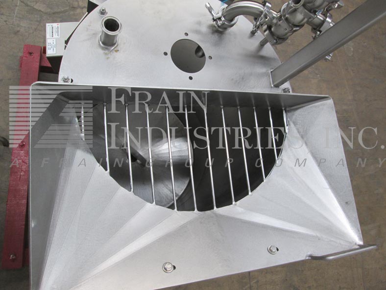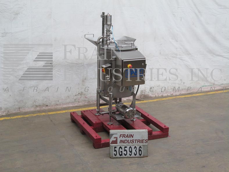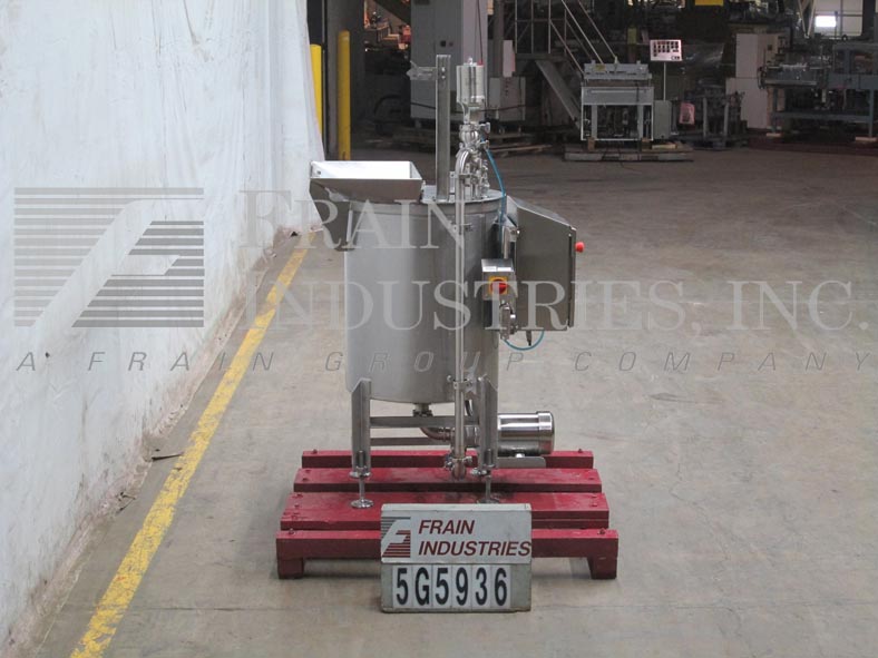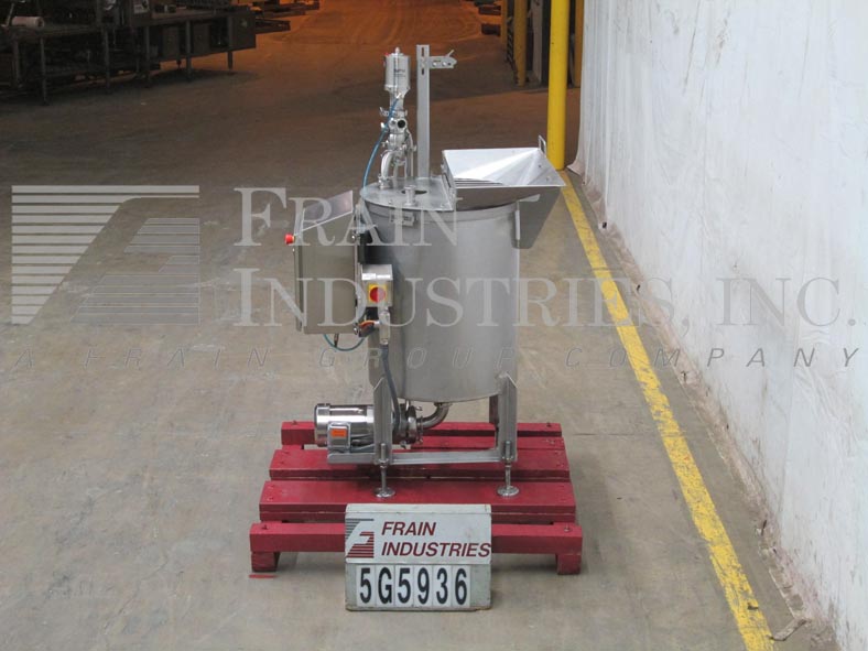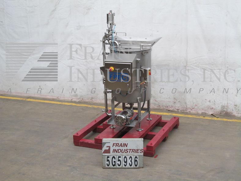 Back to All EquipmentFPEC, 50 gal. 304 stainless steel tank and centrifugal pump. Vessel dimensions: 24" in Diameter; 30" Straight Wall. Equipped with a grated charging hopper measuring 30" by 16", 2½"OD/2"ID tri-clamp bottom outlet to a Waukesha model C114 centrifugal pump powered by a 1 HP drive and capable of pumping up to 100 GPM. The pump discharges to a two-way pneumatic valve that recirculates back into the tank or discharges to a 2"OD/1½"ID tri-clamp style fitting with 55" ground clearance.