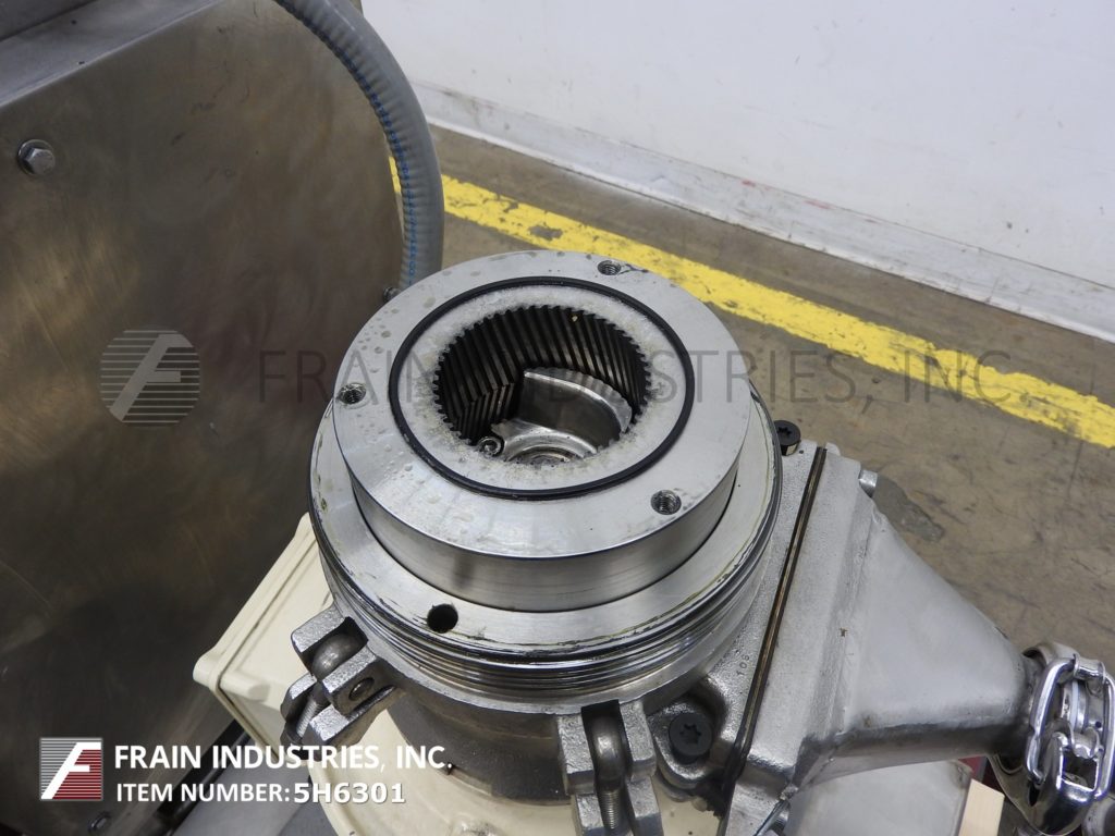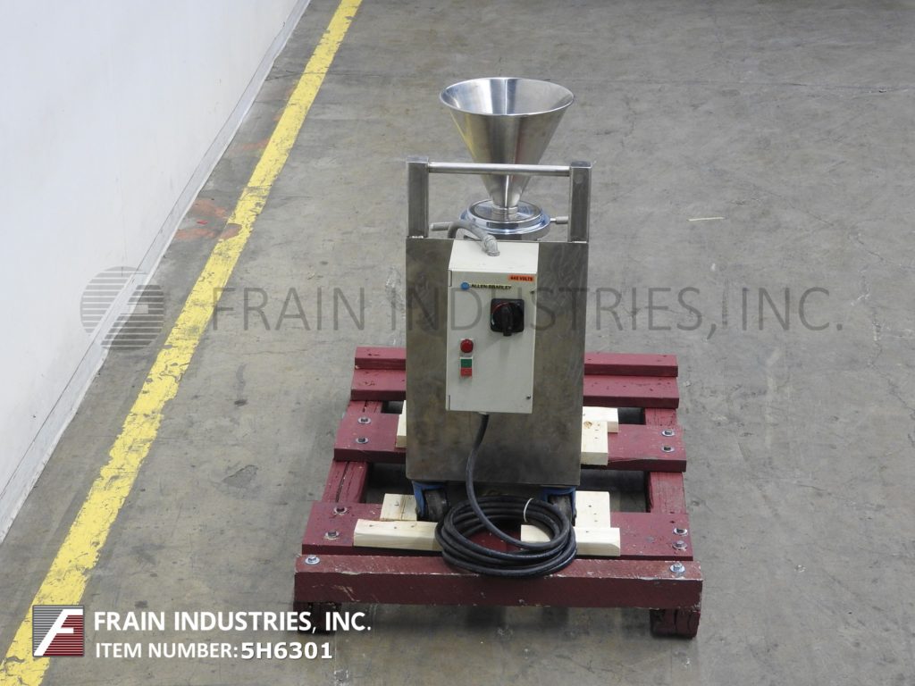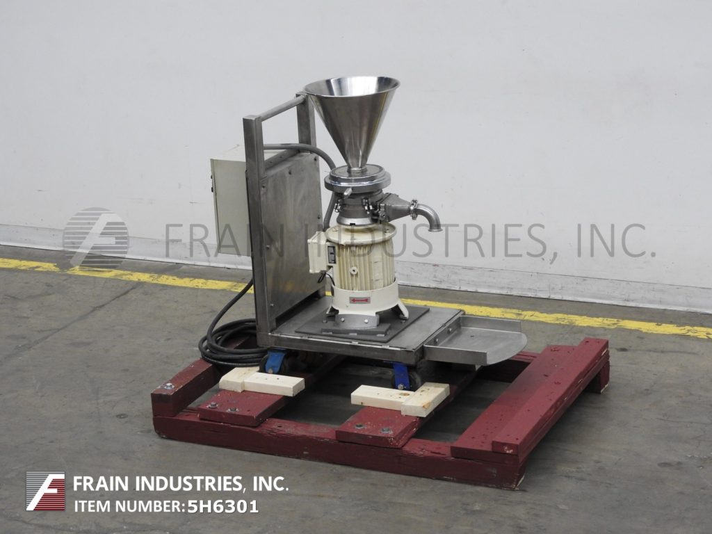 返回所有设备Fryma, MZ-80型,不锈钢,齿状胶体磨,生产速度从100到1000升产品每小时-取决于材料和应用。配备12½" OD x 11"深不锈钢圆锥形产品料斗,2" OD / 1½"ID三钳放电和3马力电机驱动。安装在24" x 17"不锈钢底座与脚轮。